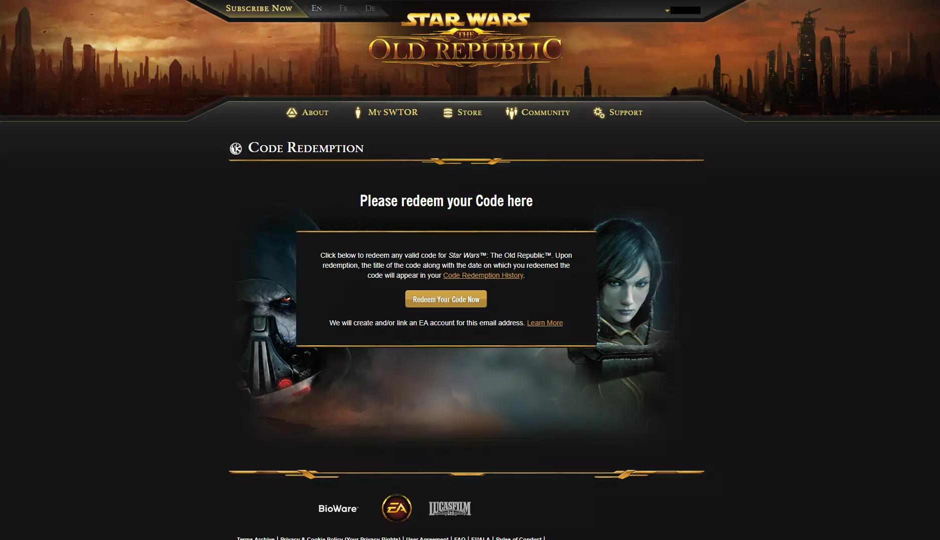 如果您有关于此部分的其他信息,也请告知。 促销代码 现在我们将介绍如何以及在何处输入促销代码,相应的促销代码及其奖励将在下方列出。 促销代码需在官方网站已登录的个人资料中输入! 1. 进入My SWTOR部分 2. 第一个标签页My Account 3. 切换到Redeem a Code标签页