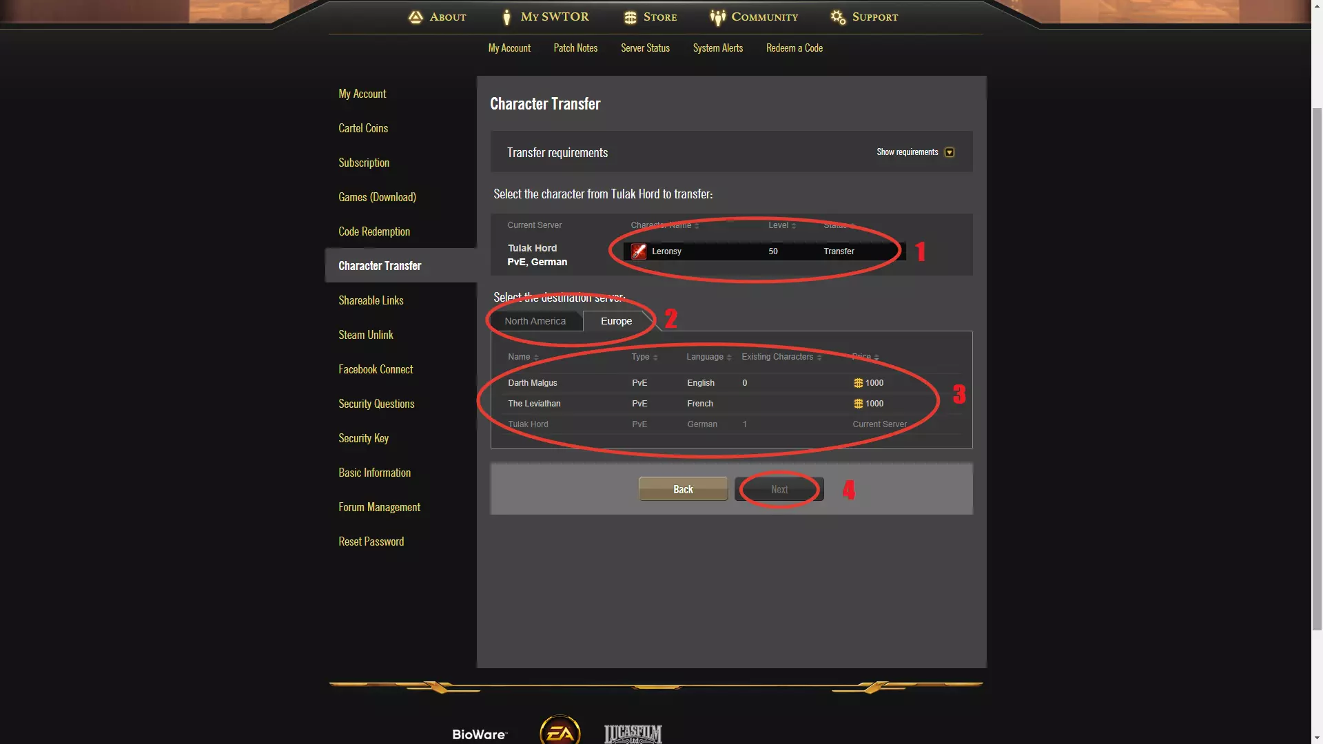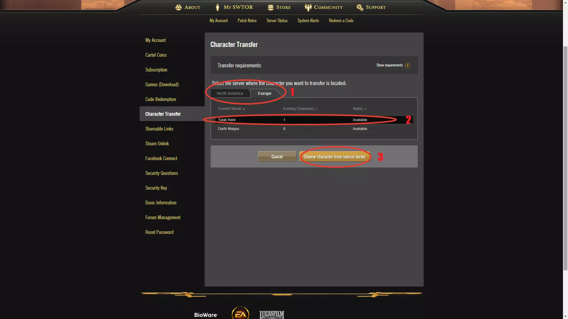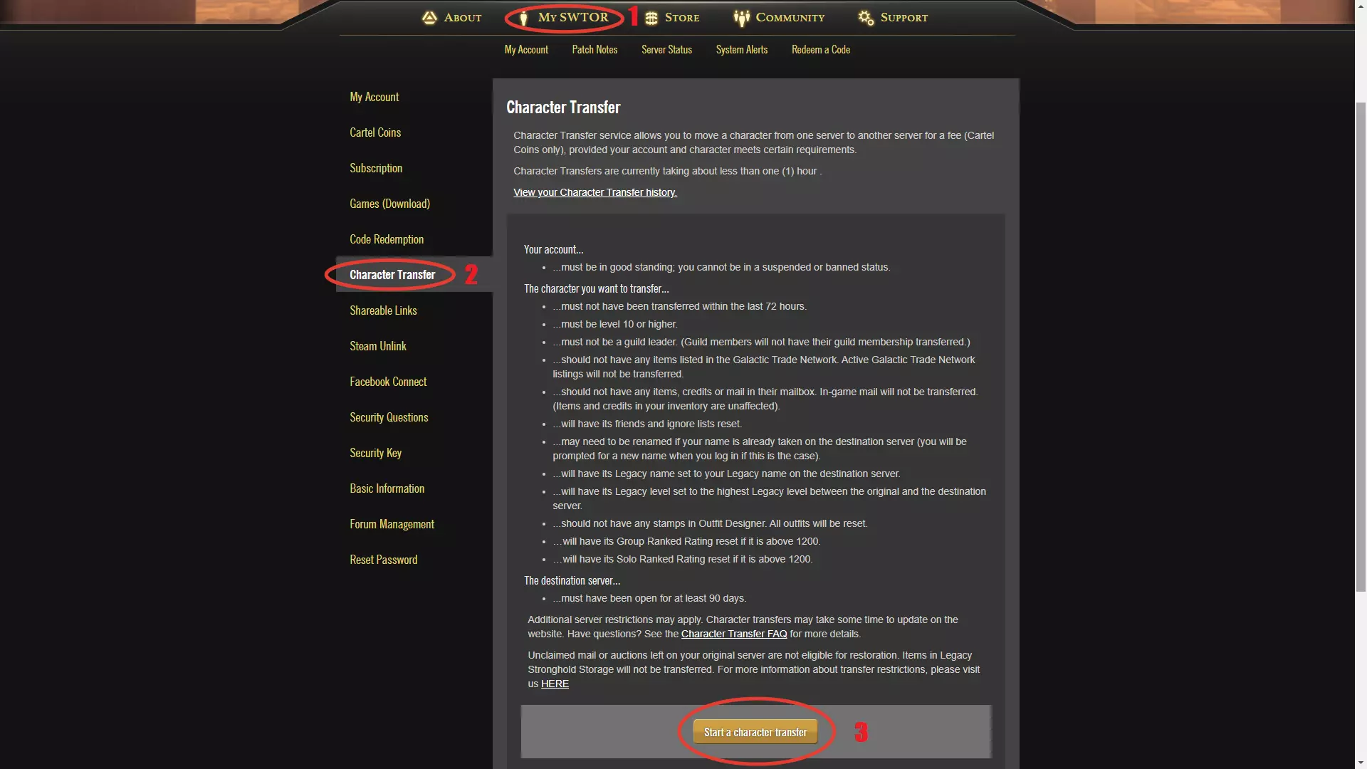现在我来演示如何转移角色。 进入官方网站后,登录自己的账号页面,点击“My SWTOR”,然后在下方的标签中选择“Character Transfer”。在了解完我之前已经说明的相关要求后,点击“Start a character transfer”即可开始角色转移。