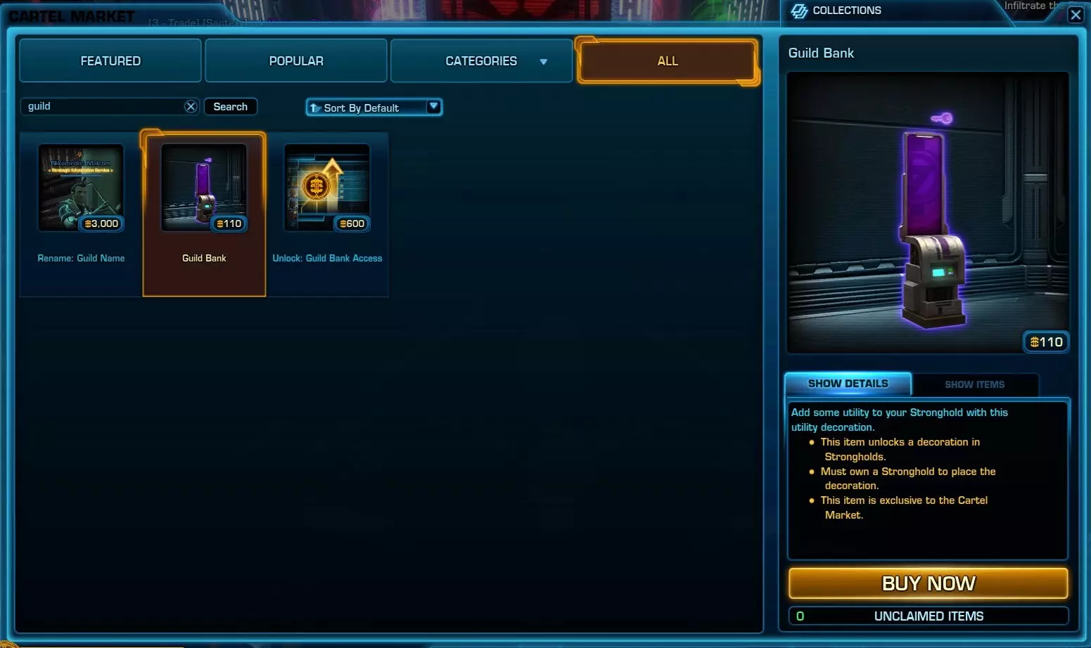 关于旗帜,这里的情况也不简单,需要先获取公会银行才能往里面存放信用点,但好在公会银行只需110个卡特尔币。购买流程与公会改名类似。此外还有一些条件和注意事项: 1. 该物品作为装饰在要塞中解锁。 2. 你必须拥有要塞才能放置它。 3. 该物品是卡特尔市场的专属物品。