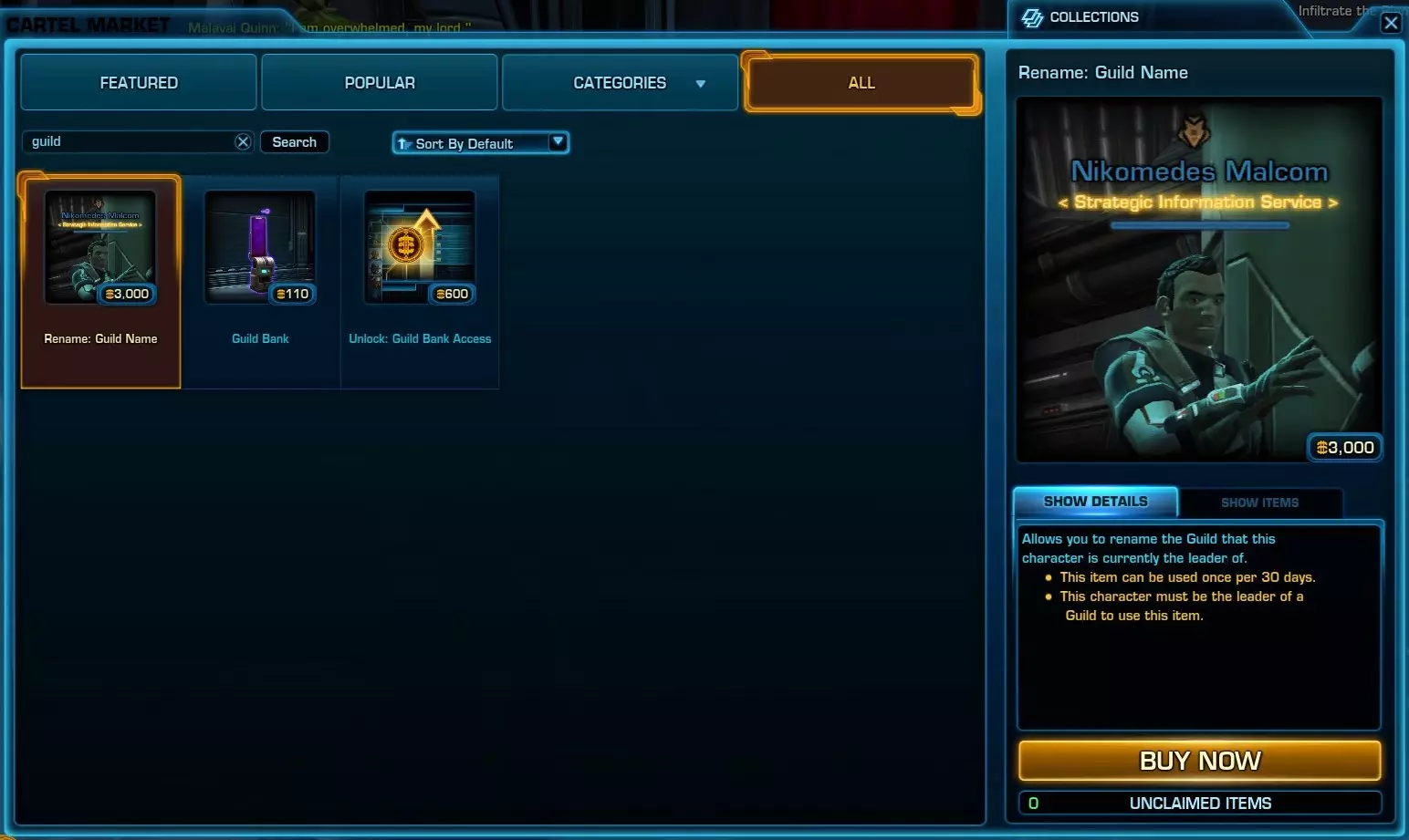 这里将为新手提供关于是否需要公会以及公会作用的相关信息。 修改公会名称和徽章若要更改公会名称,需在Cartel Market购买名为【Rename: Guild Name】的公会名称更改道具。为快速找到该道具,可在搜索栏输入“guild”。该道具的描述中列出了以下使用条件: 1. 每30天可使用一次。 2. 使用者必须是公会领袖。 道具价格:3000 cartel coins。