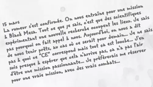 《半条命:针锋相对》的说明书包含了艾德里安·谢泼德在黑山事件前的多篇日记节选,让玩家得以了解他在灾难发生前接受的高级训练,以及G-Man对他的关注。3月3日