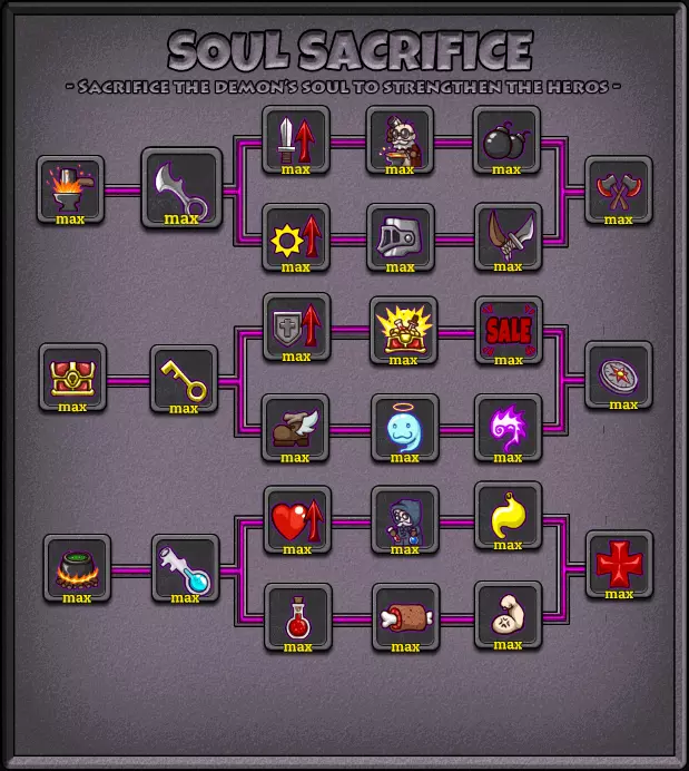 每次进入新区域时,你都会召唤史莱姆。 英雄强化(上层路径): 角色死亡后,系统会让你选择强化某项技能。角色发展路径有3种:通过伤害、通过速度和暴击,或者通过食物和药水。所有这些分支都将以不同方式帮助你通关《失落城堡》。