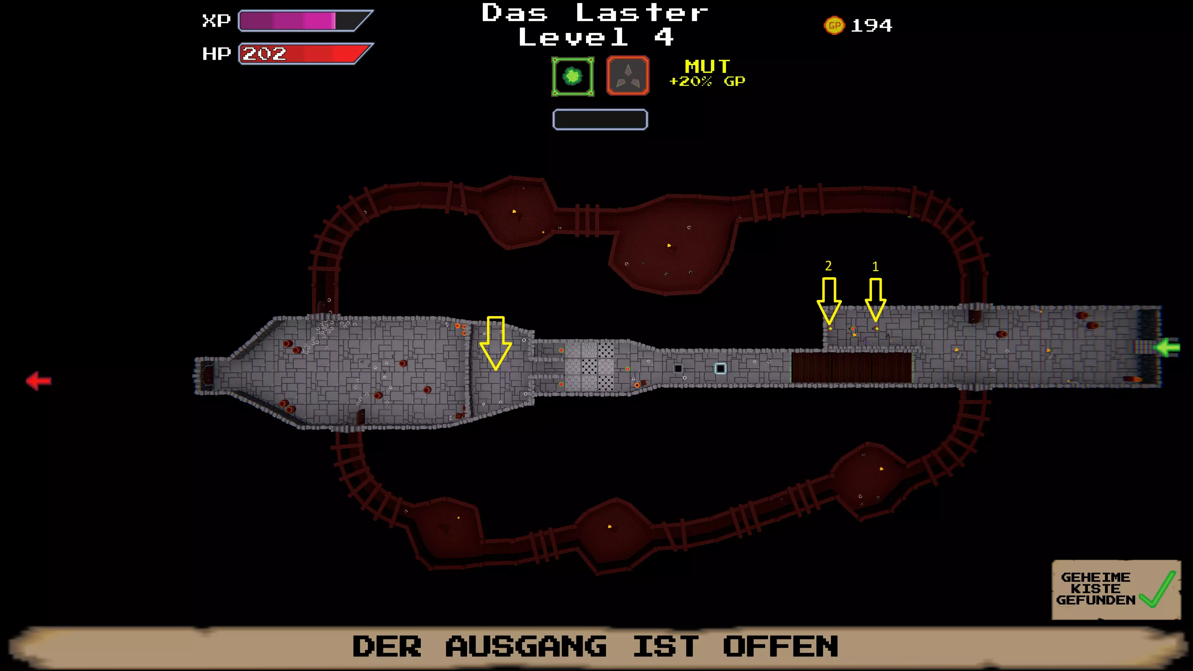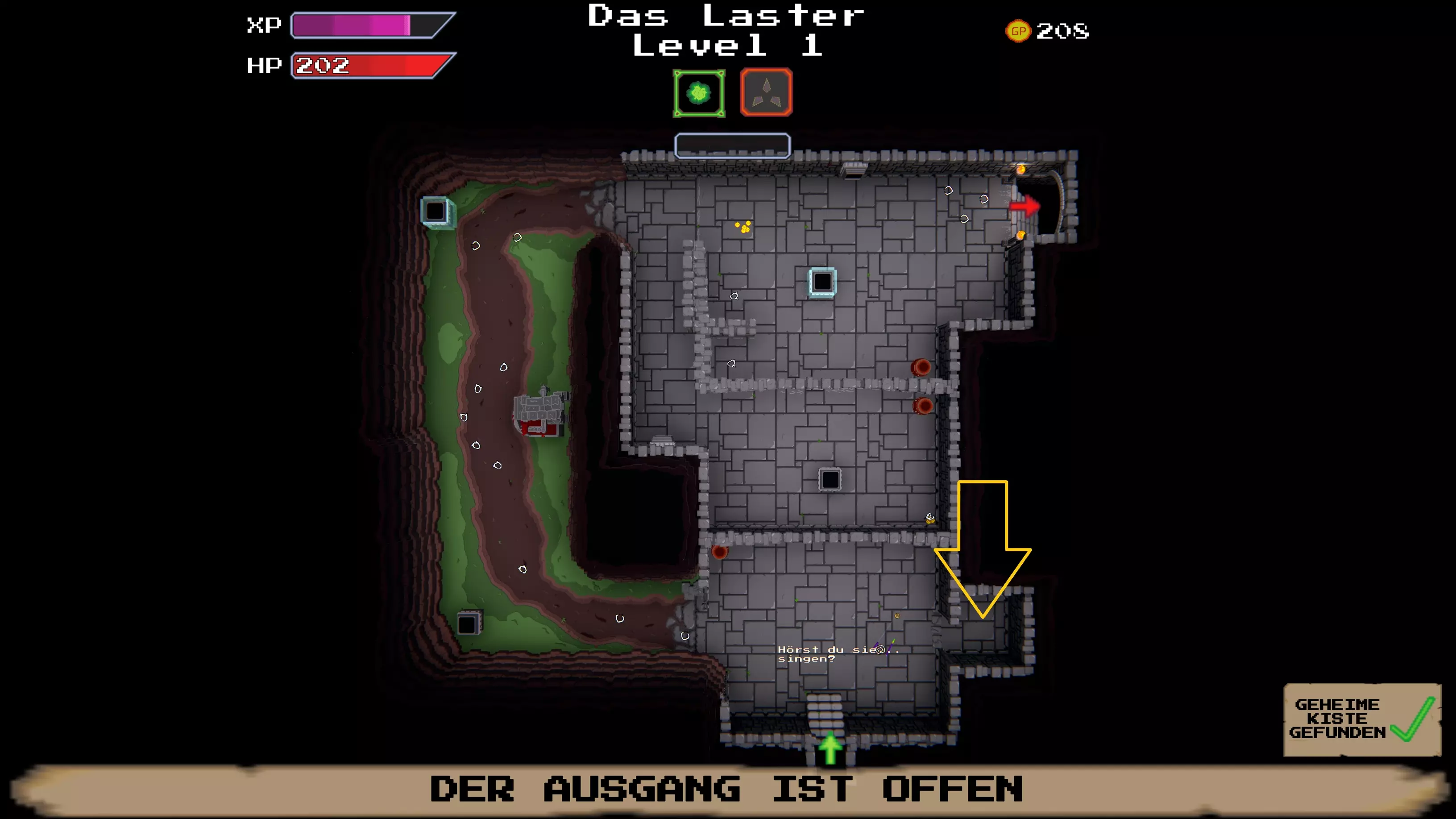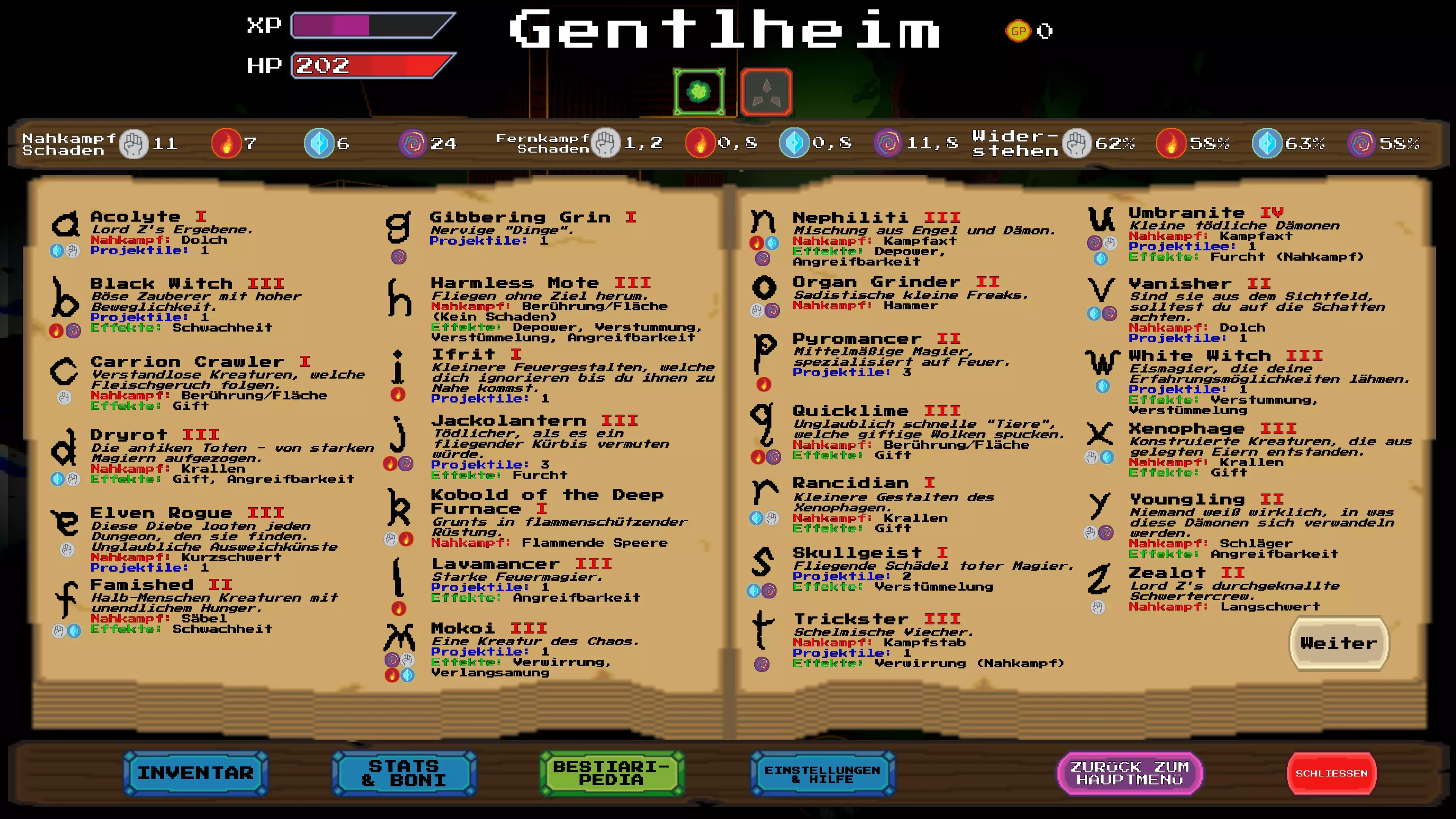 了解你的ABC:捕获奖励单词 几乎每个关卡的右上角都有一个“奖励单词”。通过近战攻击打掉字母。字母变为白色时表示计入进度。集齐整个单词后,会出现一个宝箱。 注意:如果之后死亡且未收集宝箱,该单词仍算作已完成,但宝箱会消失。 等级:新手:提升等级 当紫色经验条充满后,前往酒馆并在最内圈的点消耗经验值来提升等级。这里简直像个动物园 查阅怪物图鉴 在村庄中按ESC键,打开“怪物图鉴”选项卡。