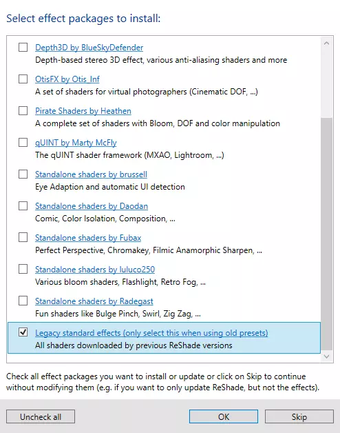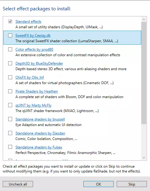 稍后会弹出第二个窗口,请在其中勾选以下选项: AdaptiveSharpen AmbientLight ChromaticAberration FakeHDR Levels MagicBloom Tonemap Vignette