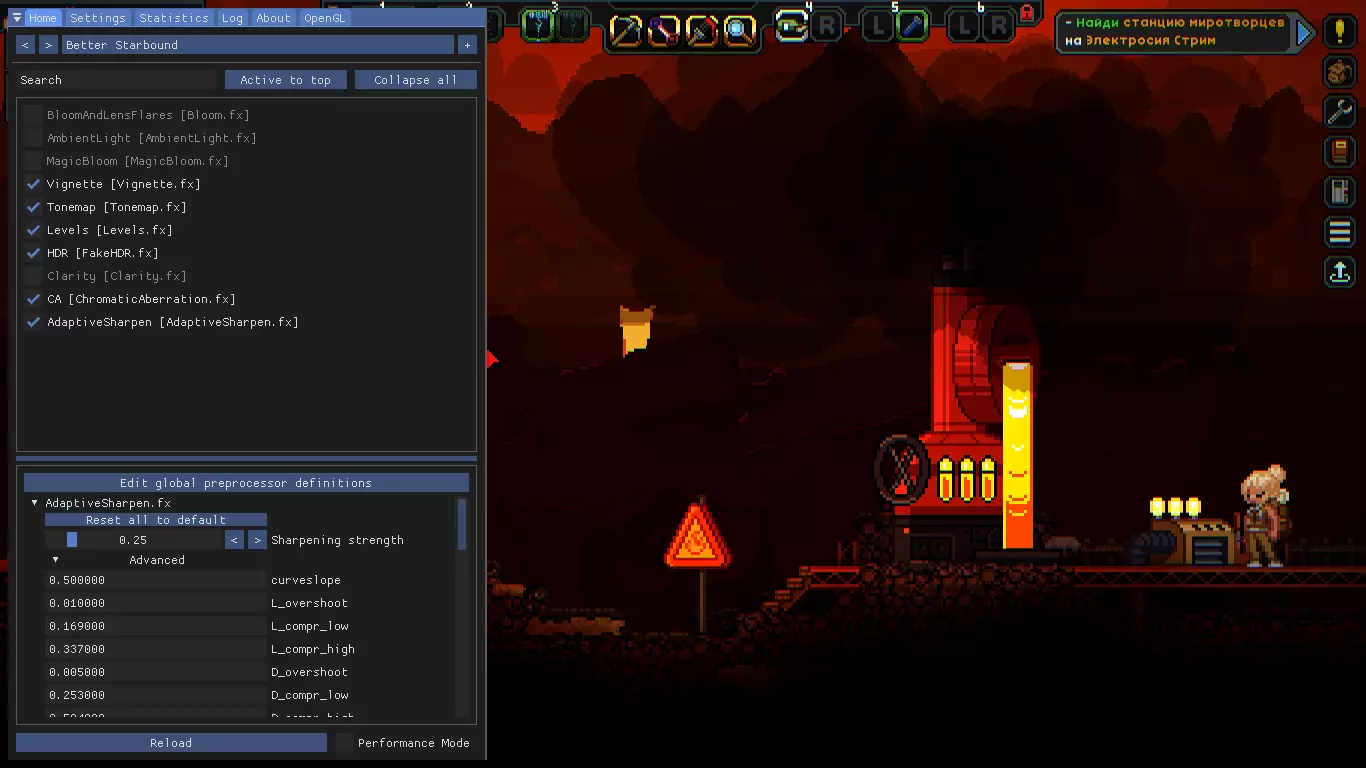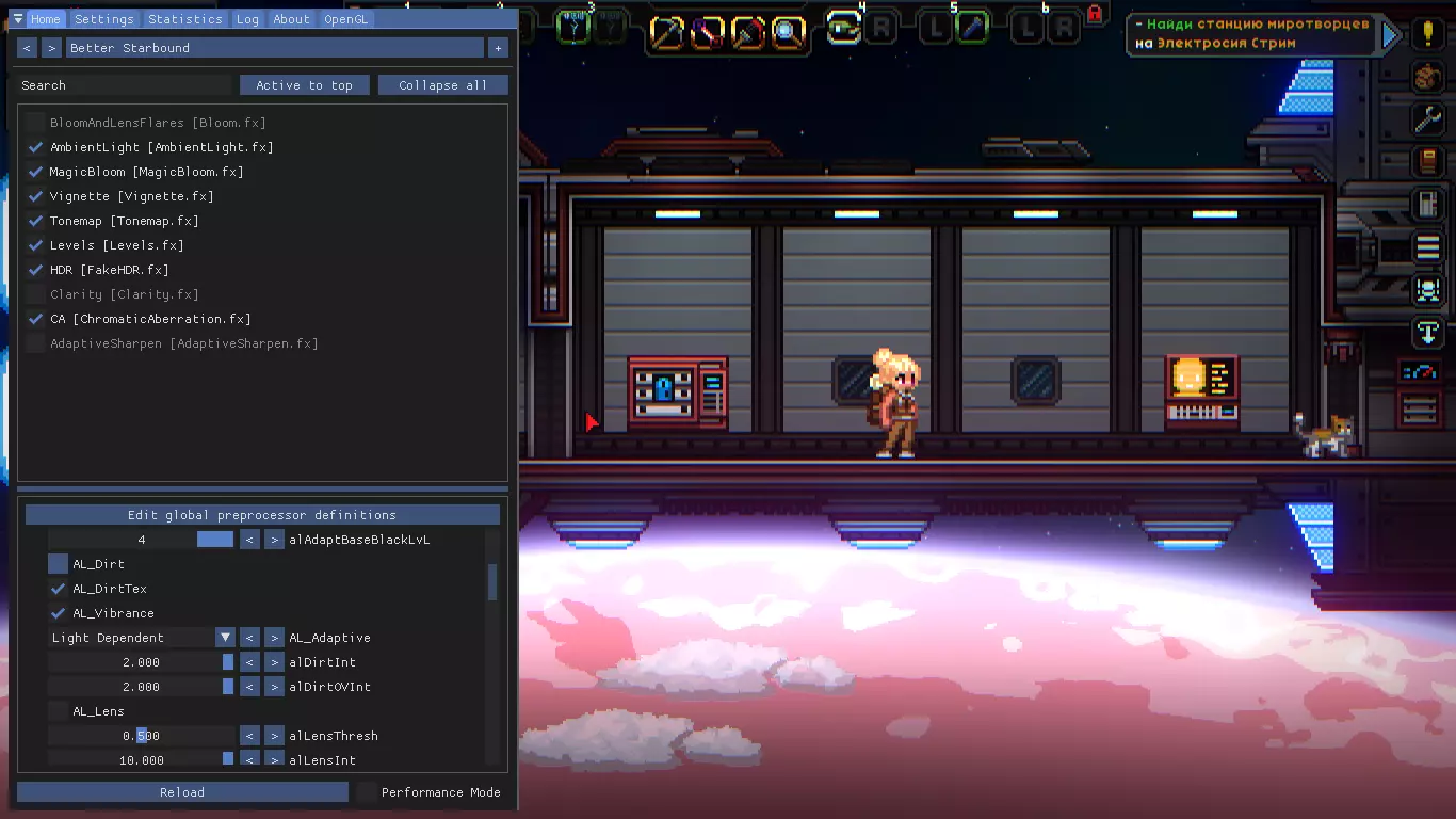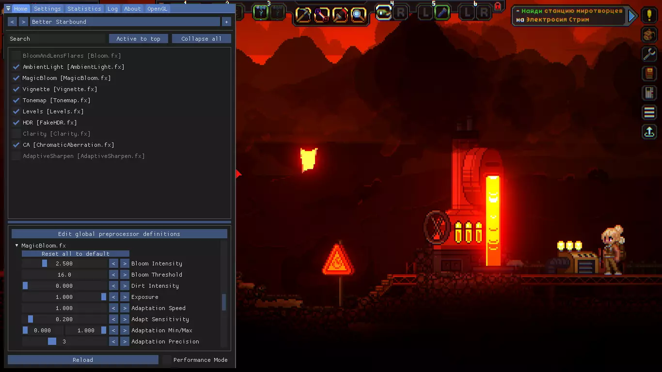 那么,我们将使用ReShade,相信很多玩过《反恐精英:全球攻势》的玩家都熟悉这个工具,或者更准确地说是它的类似工具SweetFX。 在下载和安装软件本身之前,请先下载我的预设之一: 标准预设——【该链接已被屏蔽】 这是大多数截图中使用的预设。在明亮的星球上不适合游戏。足够强的发光效果(MagicBloom) 对比度(FakeHDR、色阶、色调映射) 暗角 - 屏幕边缘的深色渐变(Vignette) 色差 - 图像通道偏移会在画面元素上添加蓝色和红色条纹(ChromaticAberration) 锐化增强 - 仅在关闭该效果时画面不模糊的情况下使用,如果关闭效果后画面没有重影(你会立刻明白),则保持关闭(AdaptiveSharpen)只保留最必要的内容。完全可游玩。 微弱发光(MagicBloom) 略微增强对比度(FakeHDR,色阶,色调映射) Plus:标准预设的2倍效果。适合那些不想游玩,只想在洞穴中探索的玩家。 Black:现代化的精简预设。完全可游玩。微弱发光(MagicBloom) 高对比度(FakeHDR、色阶、色调映射) 暗角(Vignette) 色差(ChromaticAberration) 之后将其移动到文件夹: ...Steam steamapps common Starbound win64 — 适用于64位系统 ...Steam steamapps common Starbound win32 — 适用于32位系统 预设对比无着色器: