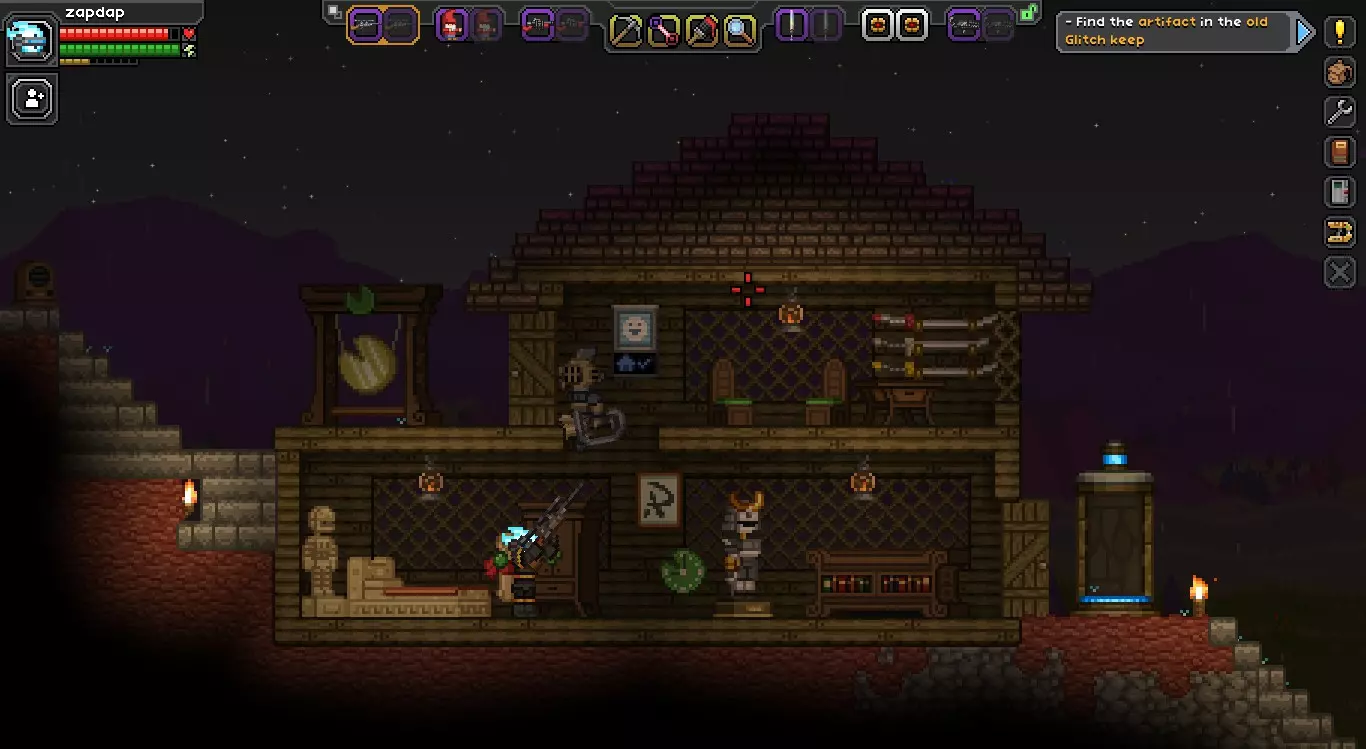 - 这里是建造两栋房屋的绝佳地点,注意这片平坦的地面非常合适。 总体而言,刷成就任务的最佳地点是1-2级星球,但对于本指南来说,殖民地建在哪里其实并不重要。我为了演示方便(而且看起来也不错),把自己的殖民地建在了初始星球上。 第二部分:建造 一旦你为殖民地选好了合适的位置,就应该开始做一些基础准备工作了。 - 整理地形,使其在某些区域完全平坦且没有背景。有山丘是可以接受的,但如果是有轻微凹陷和孔洞的平原,建议把它们填平,这样你就不会建造出歪歪扭扭的房屋了。-铺设一些地板,通过铺设一层你喜欢的方块来让景观看起来更美观。我推荐使用石板材或砖块,让它看起来像鹅卵石路,但你也可以按自己的喜好来做。 -建造房屋。大多数想要最大化利润的人会建造一群小型公寓,塞进尽可能多的租户,以获得最高的租金空间比,但这对我们的目标有几个不利之处。首先,这些公寓不够大,无法容纳独特租户或不同类型的租户,比如守卫和厨师。它们确实能带来更多租金,但其他有用的奖励会更少,比如高等级船员(没有大房子是不可能获得的),而且如果怪物进入公寓楼,所有租户都会死亡。一个好的房屋需要有放置床、灯、桌子、椅子、墙壁装饰品和殖民地契约的空间。