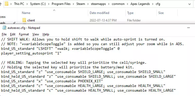 将以下指令复制粘贴到你的autoexec.cfg文件中 // 治疗:轻按所选按键将优先使用小型护盾电池/注射器 // 长按所选按键将优先使用大型护盾电池/医疗包 bind_US_standard "z" "use_consumable SHIELD_LARGE; use_consumable SHIELD_SMALL" bind_held_US_standard "z" "use_consumable SHIELD_SMALL; use_consumable SHIELD_LARGE" bind_US_standard "x" "use_consumable PHOENIX_KIT" bind_US_standard "c" "use_consumable HEALTH_LARGE; use_consumable HEALTH_SMALL" bind_held_US_standard "c" "use_consumable HEALTH_SMALL; use_consumable HEALTH_LARGE" 完成后应显示为上述内容