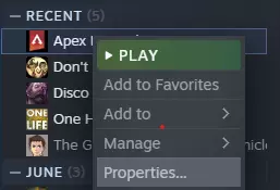 你是否喜欢开启自动奔跑,但又怀念在敌人附近时能够步行并保持更隐蔽状态的能力?你是否需要超过一秒钟才能选中想要的治疗物品?别再找了!本指南将介绍如何使用自定义按键绑定,让你可以按住【Shift】键步行,并为护盾电池和小型护盾电池设置单独的按键以实现更快治疗。 自动执行配置文件(autoexec.cfg)设置入门指南 注意:如果你已经设置好autoexec.cfg,可以跳过此部分。 首先,你需要创建一个用于保存所有新按键绑定的autoexec.cfg文件。 操作方法:打开Steam中的游戏库,右键点击【Apex英雄】,然后选择属性。