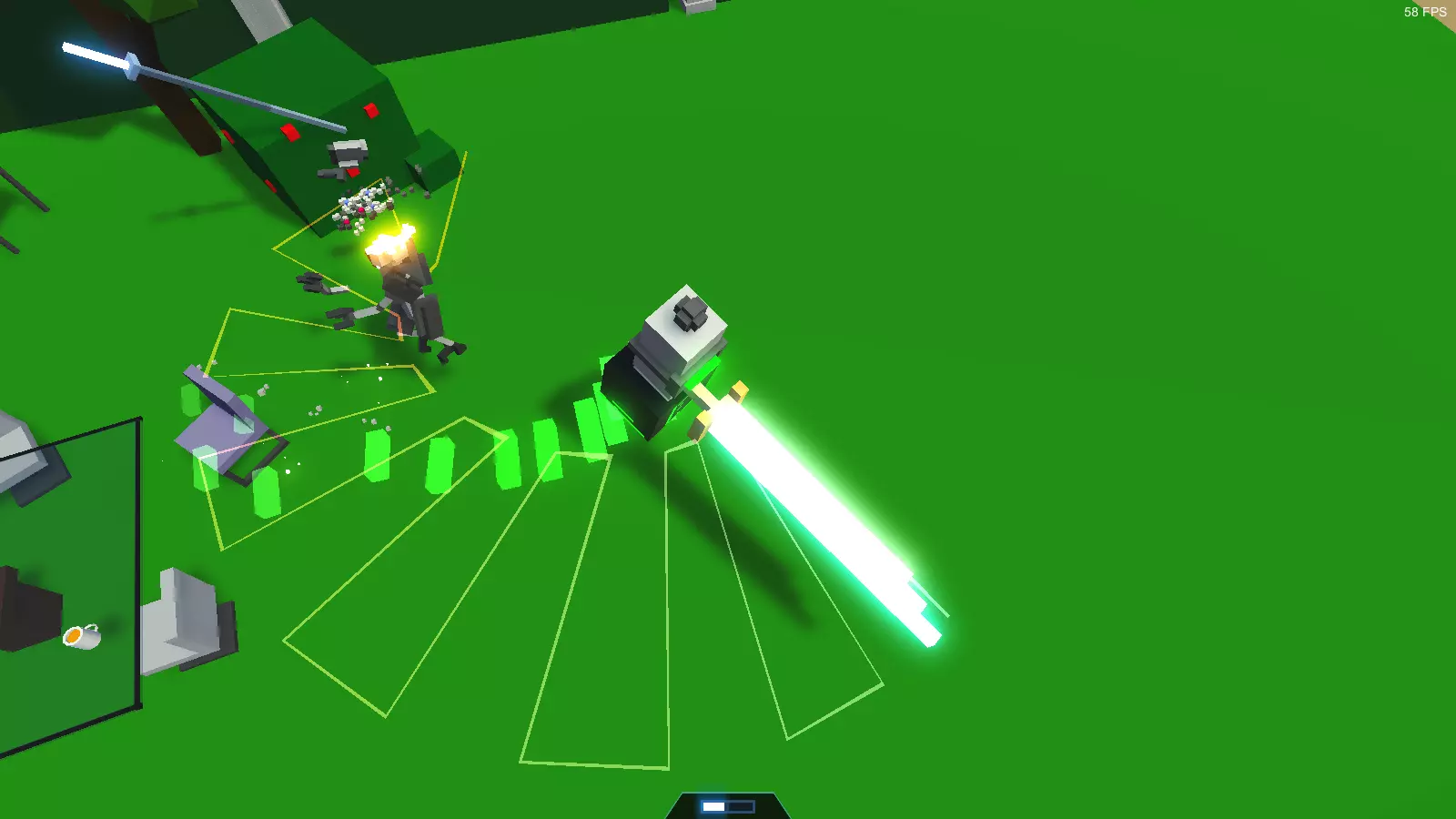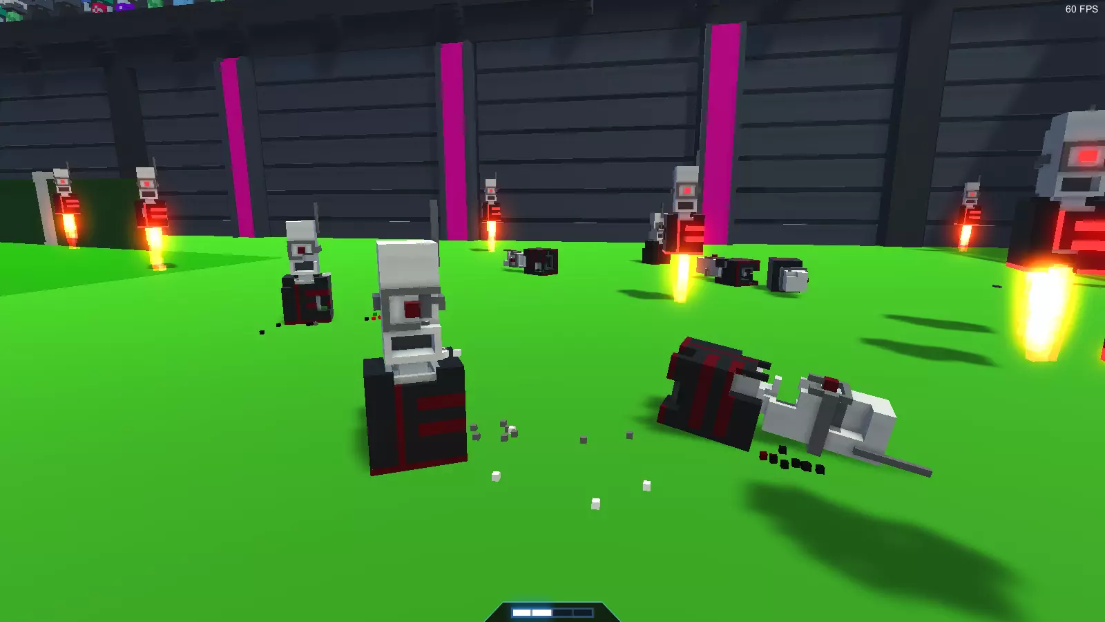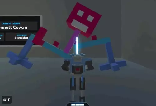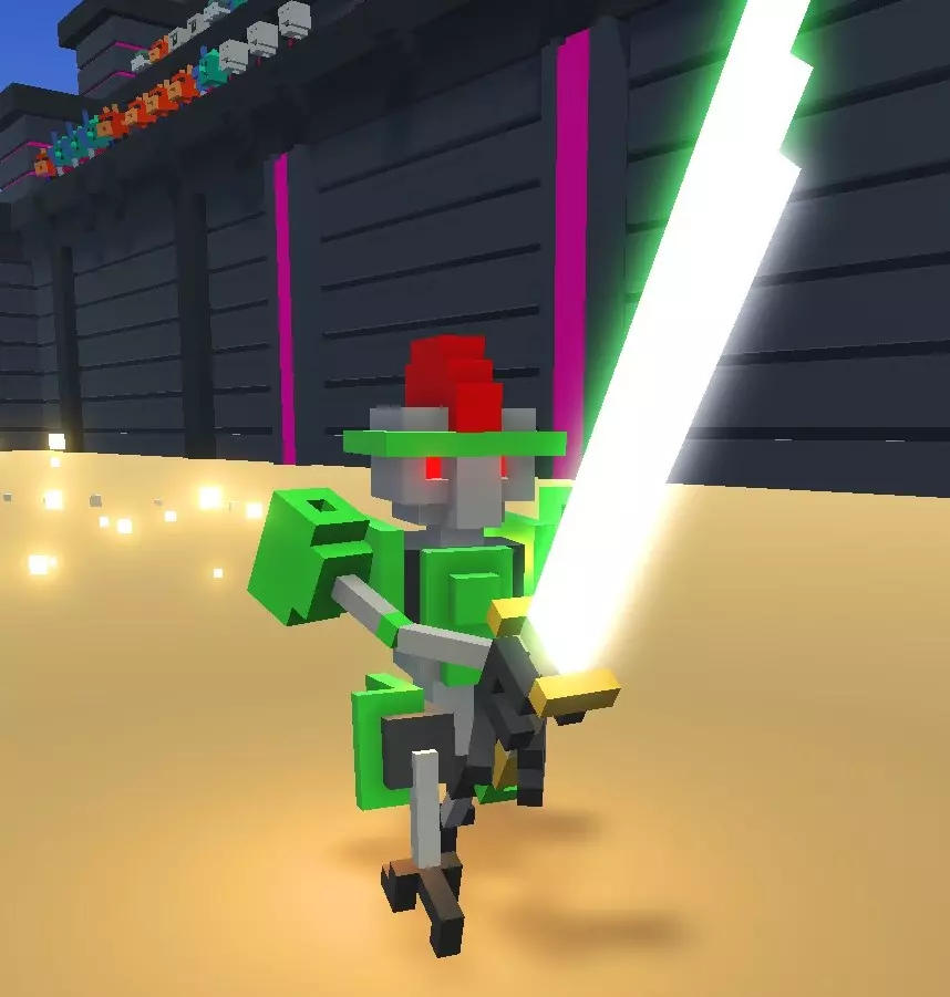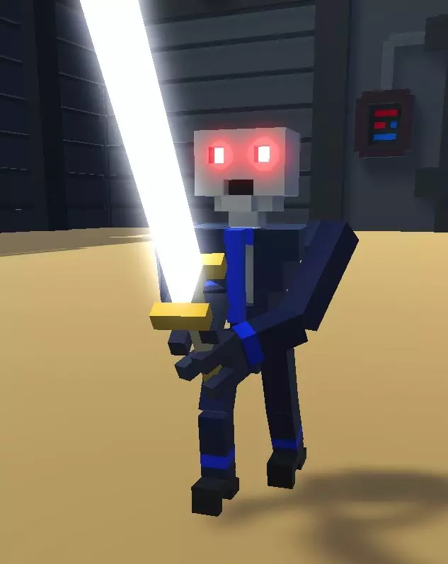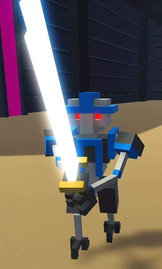 冲刺 - 标准技能,通过Shift键激活,更高级的版本是喷气背包。几乎所有机器人都出现在故事模式中,因此如果某个机器人至少在故事中出现过一次,我就不再特别说明。如果机器人未出现在故事模式中,我会在其特性的第一点注明。 人形机器人 注意!玩家操控的机器人也属于此类! 失去腿部后将无法使用踢击。标准判定规则如下: 死亡判定条件: 1. 失去双腿。 2. 失去主导手(锤子和弓的主导手为双手,剑和长矛的主导手为右手。玩家的【仅用踢击】和【仅用激光】挑战模式除外。此外,仅使用踢击或装备激光武器的无武装机器人也在此列)。 3. 位于头部的中央处理器(一个2×2×2体积的方块,位于颈部上方3个方块处)受到损坏。【剑刃机器人(马克1型)】 游戏中第一个也是最基础的敌人。外观为银色机器人,配备小型蓝绿色装甲。武器为一把剑,与玩家初始获得的剑相同。是竞技场中最弱的机器人,但数量众多时会构成威胁。在无尽模式中,从“青铜”等级开始出现。