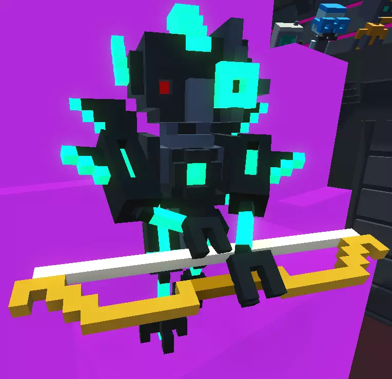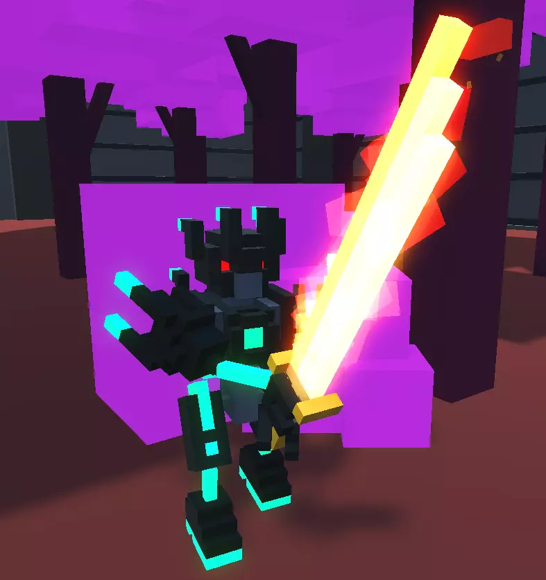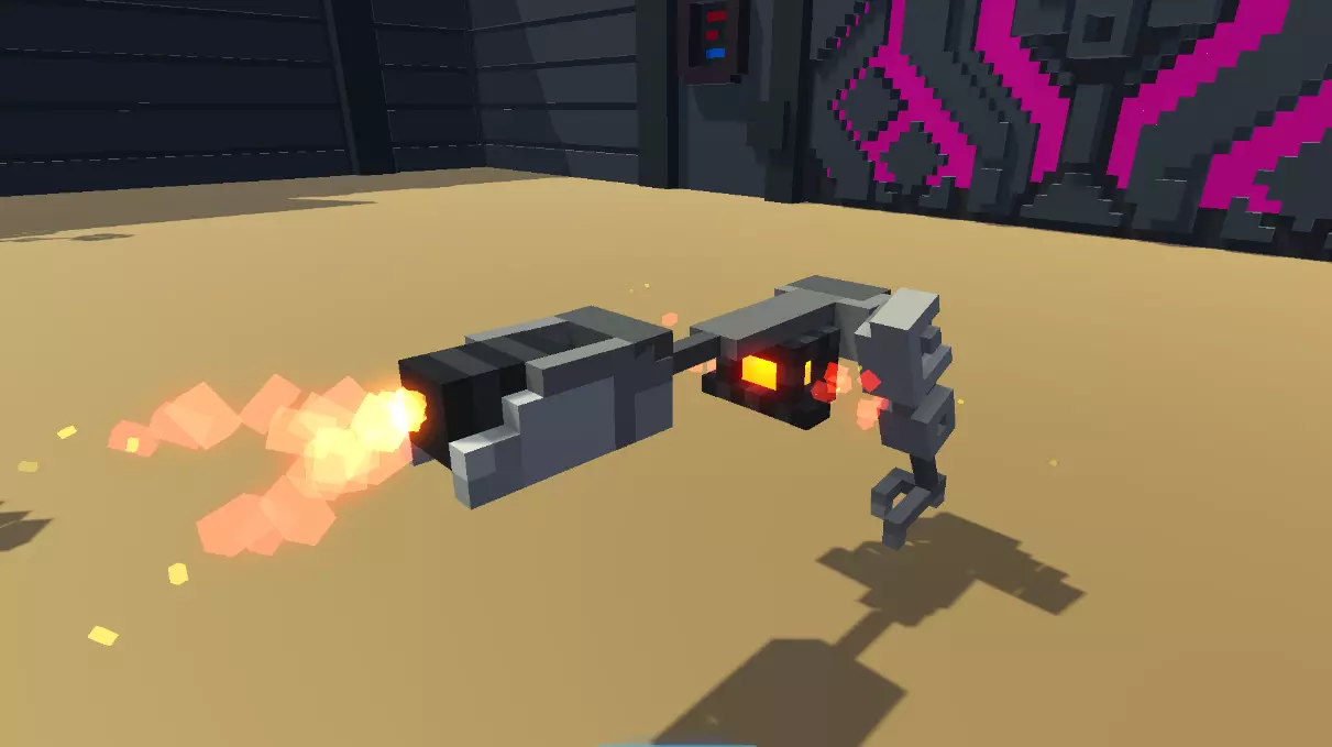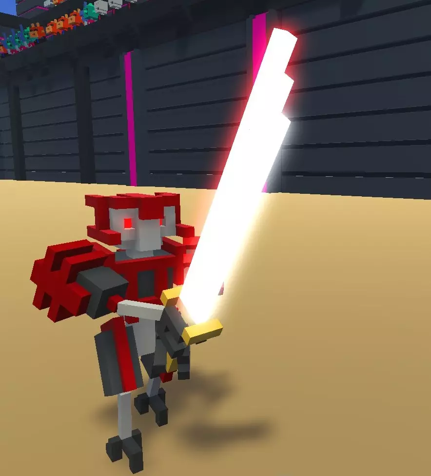 弱点: 1. 易受侧面攻击。 特性: 1. 拥有三级"格挡刀剑"强化。 2. 拥有二级"失衡"强化。 3. 会将箭矢反弹回玩家。 4. 被击倒后能快速起身。 5. 部分攻击时会跳跃。 6. 躲避攻击能力较强。 7. 能够从侧面发起攻击。战术: 如果您使用剑或锤子,只需进行侧击,但要小心。 在“Only Bow”挑战中,有3种获胜战术。 1) 如果地图上有敌人,尝试让他们夹击目标。此外,该机器人无法防御来自背后的攻击,其盟友向您射击时可能会误杀它。 2) 如果您拥有“Punch”强化,或者地图上有蜘蛛机器人、踢击机器人(详见下文)。推倒持剑者并迅速向其射击,或者将其推倒在陷阱上。 3) 如果既没有上述两种情况,而你又是技术高超的玩家,可以尝试在他进行侧劈时攻击他(瞄准他开始挥剑时剑所在的位置)。 其他情况下你就会变成尸体;) 机械持剑者(4型) 它的人工智能比2型持剑者稍好一些。其全部危险之处在于它拥有二级“火焰剑”强化。如果它击中你,就会失去一条肢体,甚至很可能直接死亡。它拥有漂亮的火焰外观,带有大量发光体素。在无限模式中,从【钻石】等级开始出现。
