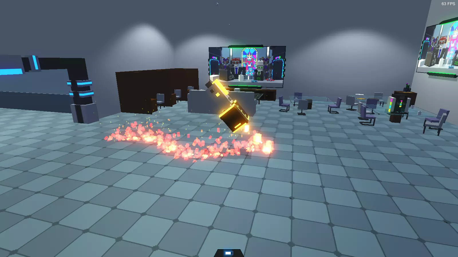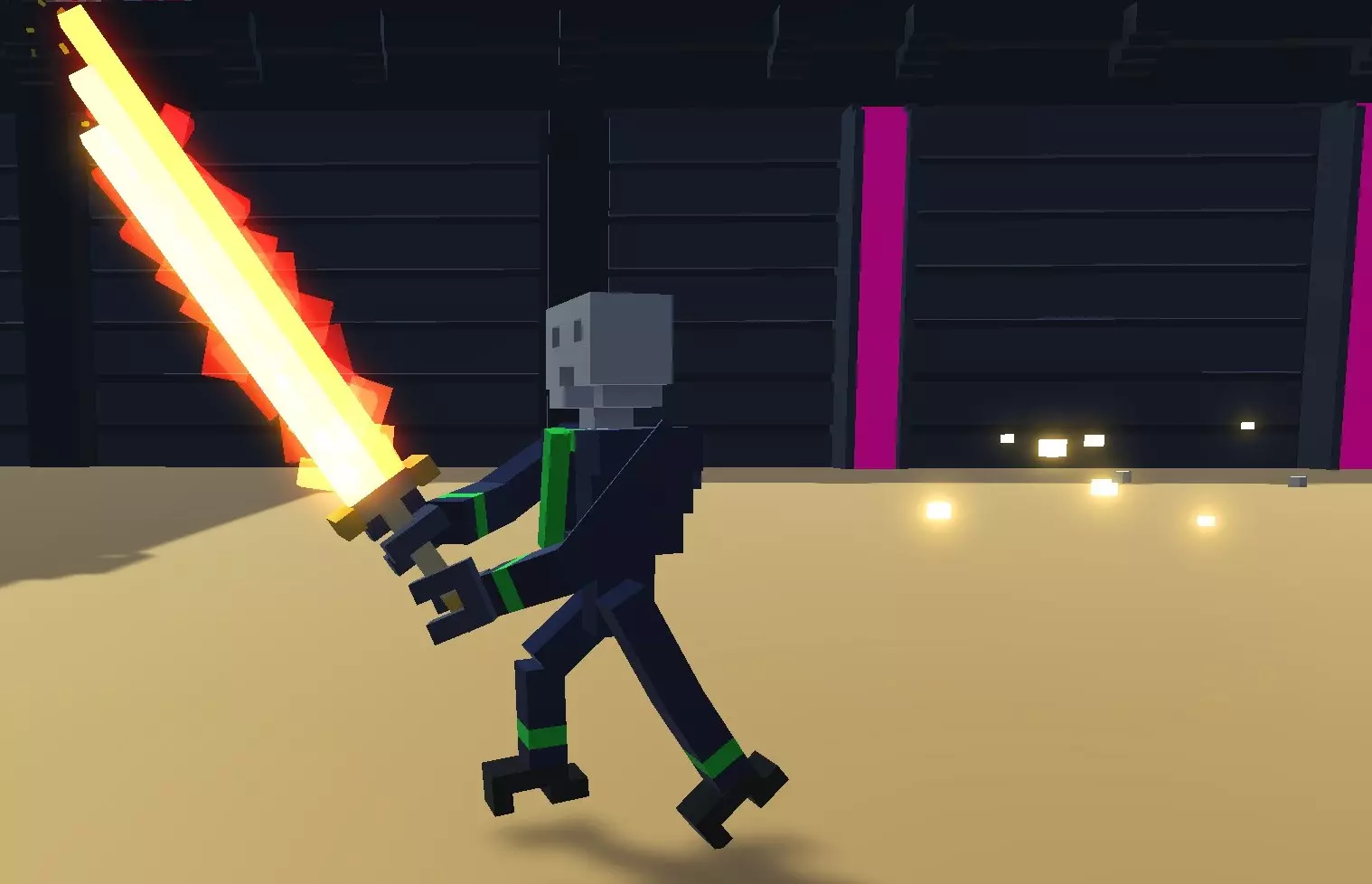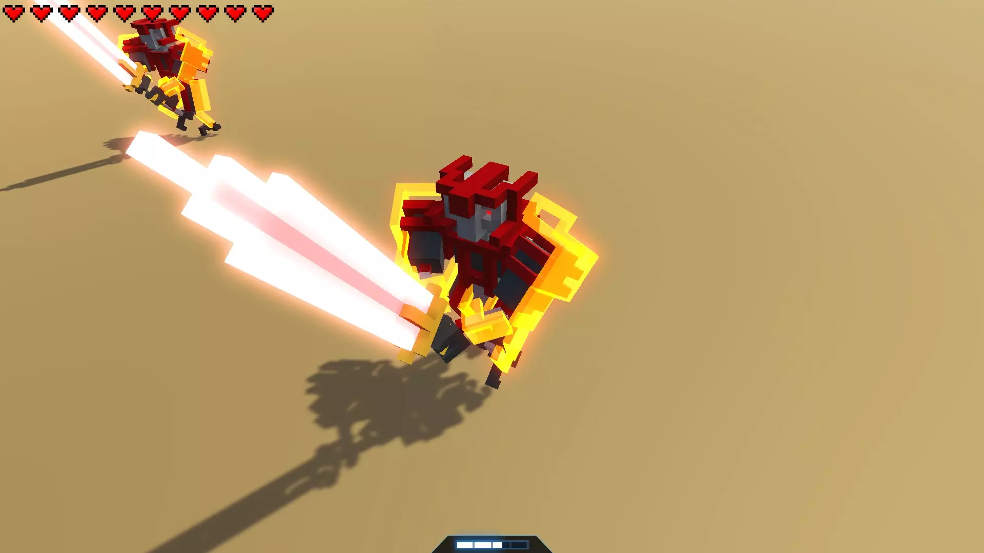 弱点: 1. 易受侧面攻击。 特性: 1. 拥有三级"格挡刀剑"强化。 2. 拥有二级"失衡"强化。 3. 会将箭矢反弹回玩家。 4. 被击倒后能快速起身。 5. 部分攻击时会跳跃。 6. 躲避攻击能力较强。 7. 能够从侧面发起攻击。战术: 如果您使用剑或锤子,只需进行侧击,但要小心。 在“Only Bow”挑战中,有3种获胜战术。 1) 如果地图上有敌人,尝试让他们夹击目标。此外,该机器人无法防御来自背后的攻击,其盟友向您射击时可能会误杀它。 2) 如果您拥有“Punch”强化,或者地图上有蜘蛛机器人、踢击机器人(详见下文)。推倒持剑者并迅速向其射击,或者将其推倒在陷阱上。 3) 如果既没有上述两种情况,而你又是技术高超的玩家,可以尝试在他进行侧劈时攻击他(瞄准他开始挥剑时剑所在的位置)。 其他情况下你就会变成尸体;) 机械持剑者(4型) 它的人工智能比2型持剑者稍好一些。其全部危险之处在于它拥有二级“火焰剑”强化。如果它击中你,就会失去一条肢体,甚至很可能直接死亡。它拥有漂亮的火焰外观,带有大量发光体素。在无限模式中,从【钻石】等级开始出现。