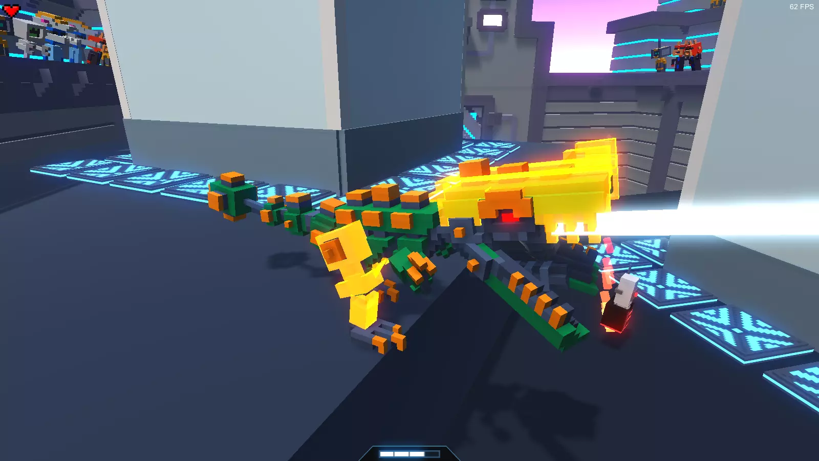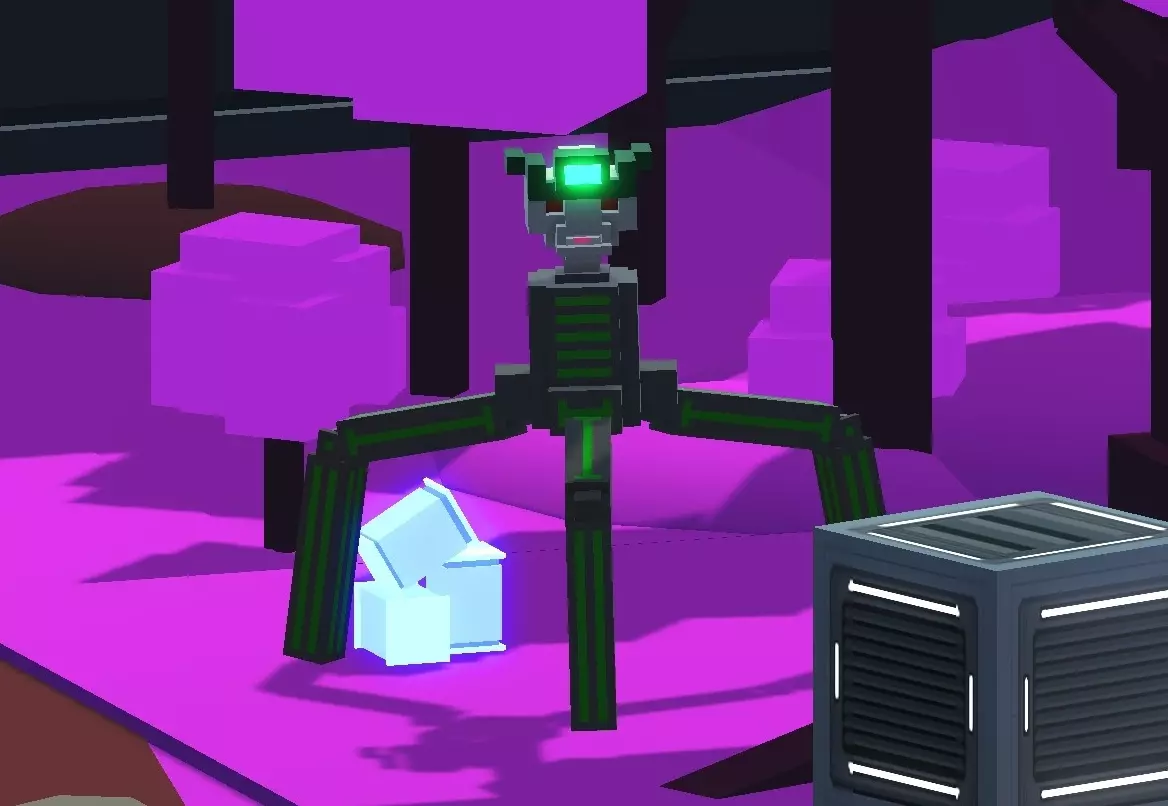 特性: 1. 拥有4个能量槽(“能量储备”升级为第三级)。 2. 拥有“能量恢复”二级升级(能量恢复速度提升100%)。 3. 侧面装甲层非常厚。因此,从侧面用锤子或剑攻击不会产生预期效果。 4. 被踢时会被远远击退。 5. 具备快速射击和迅猛攻击能力。注意!迅猛龙在激光攻击时会非常快速地转动头部,所以必须时刻保持移动! ----------------------- 弱点: 1. 攻击时会站在原地。 2. 如果恐龙跳上蹦床,骑手可以瞄准你撞向迅猛龙。 3. 头部的90%是要害部位。只要击中至少3个体素,恐龙就会被击败。 ----------------------- 战术: 最有效的消灭方法是使用弓箭。一箭射中它的嘴巴,恐龙就完蛋了。如果它有护甲,那就先攻击它的嘴部,然后立即攻击稍高一点的位置(当面部护甲的部分被卸下时,它会抬起嘴)。也可以使用火焰吐息。如果这两种方法都没有……那就用锤子。锤子越大越好。砸烂它的头——然后就可以煮机器恐龙汤了。 蜘蛛步足机器人 这种机器人没有腿,而是有4个步足,设计成蜘蛛腿的样式。如果拆掉一条机械腿,机器人会向拆掉腿的一侧倾斜。值得注意的是,即使把机械腿全部拆掉,机器人也不会被摧毁,仍然能够行走、跳跃等。 失去手臂不会导致机器人被摧毁。 中央处理器(位于颈部上方3个方块处的2×2×2体积方块)受损时,机器人会被摧毁。机器人只有在将步行足连同盆骨部分(步行足所连接的身体部位)一起切断时才会被摧毁。这一特性使得玩家可以用最小的锤子攻击其盆骨,轻松一击消灭此类机器人。 舰队观察员 注意,以下内容包含剧透! 一种巨大的机器人,用步行足代替了腿部。它的头部有点像锤头鲨的头部,身体呈紫色,前方看起来像一个反应堆,它会从那里发射激光。出现在无限模式中,从“Diamond”等级开始。在第三章末尾也会作为 Boss 出现。