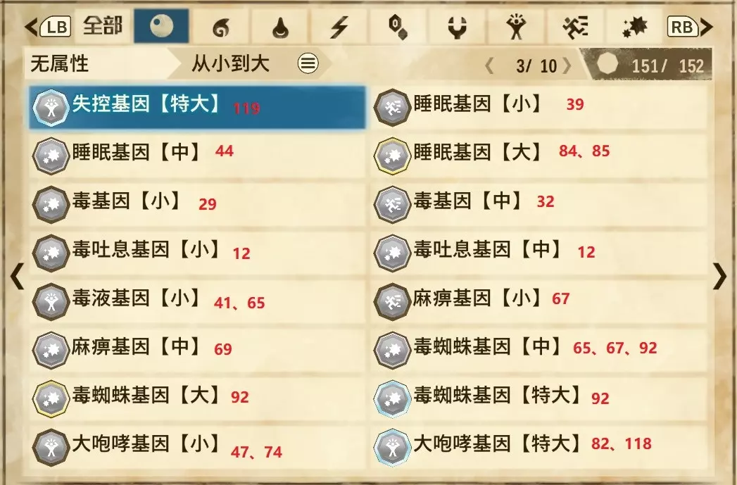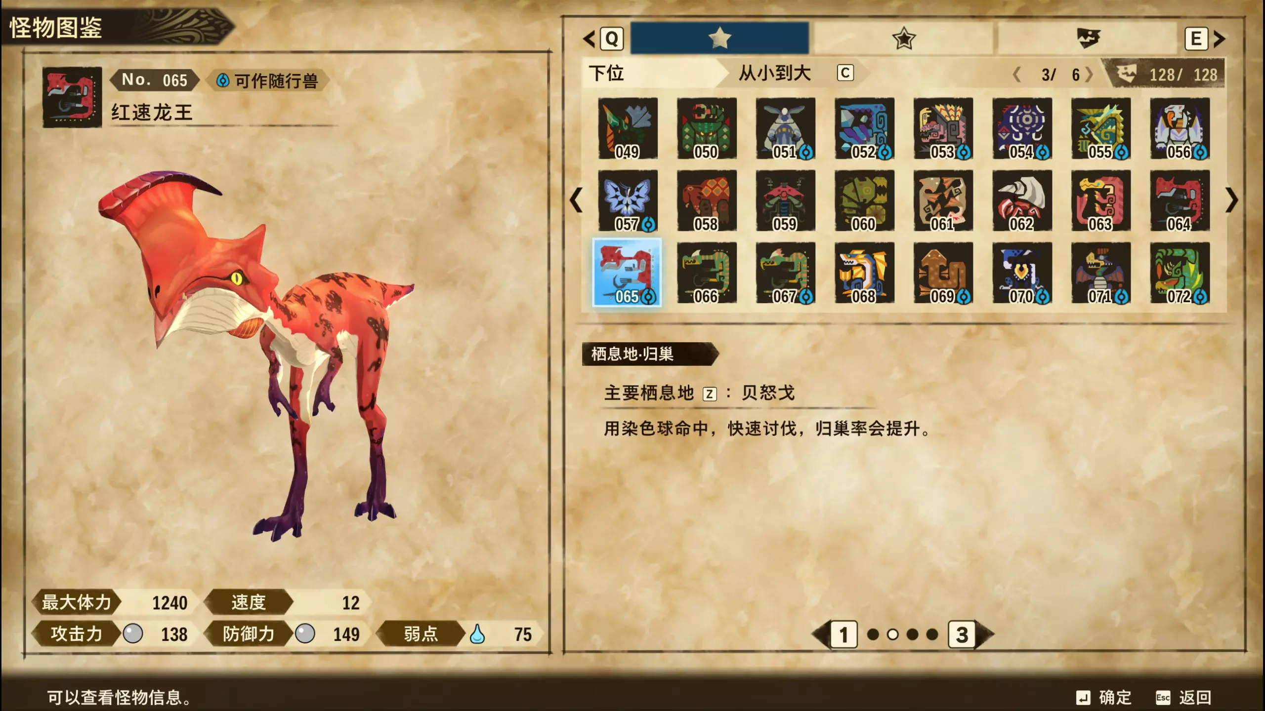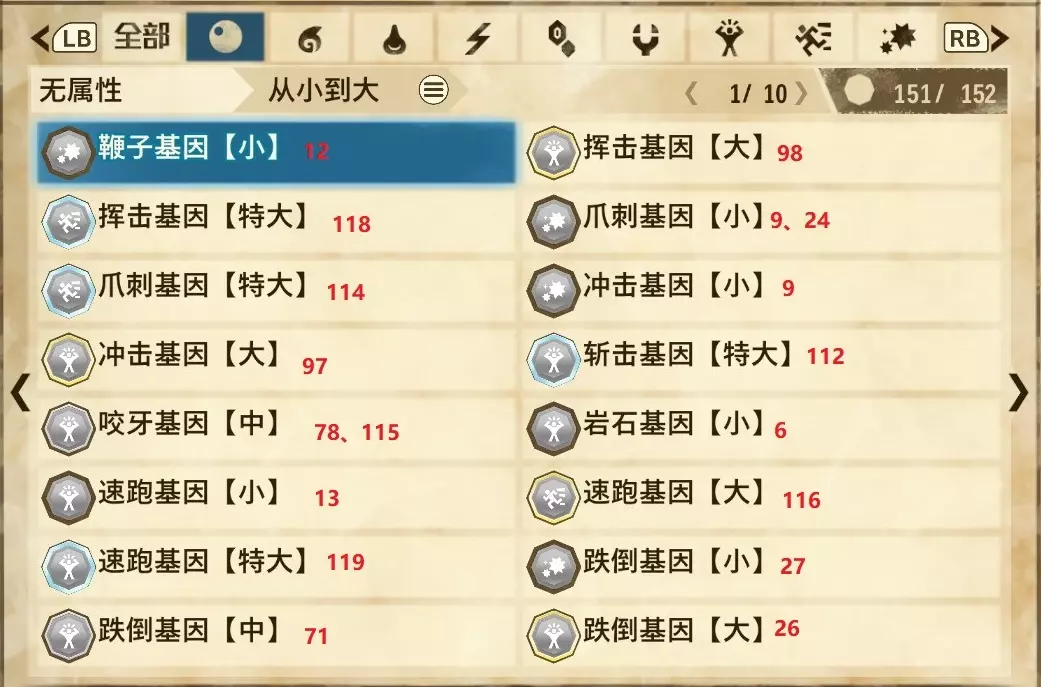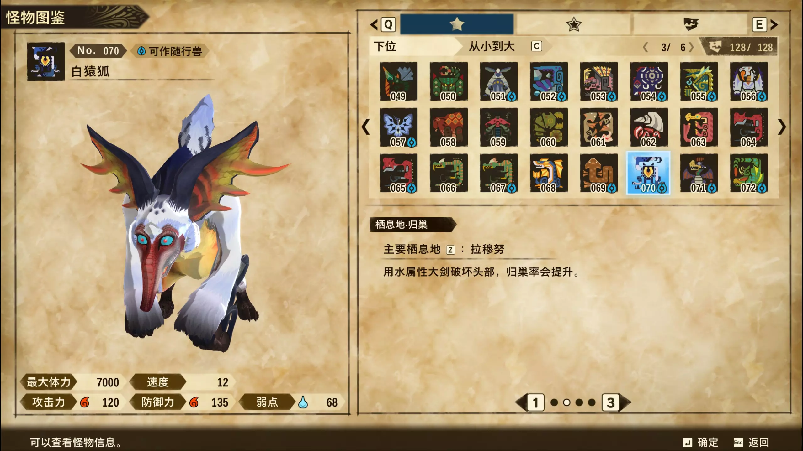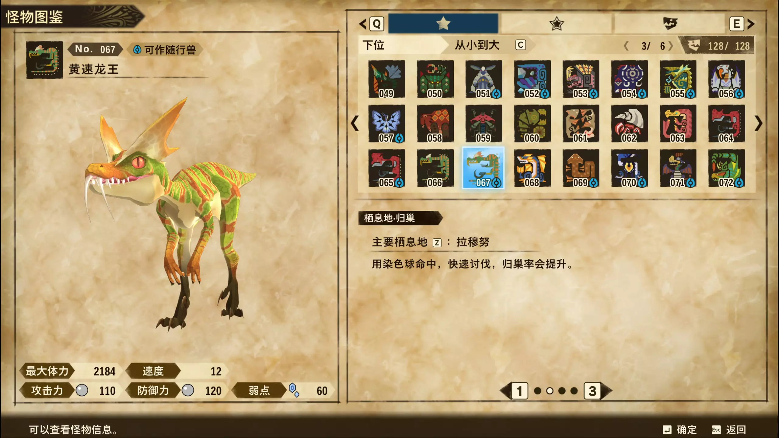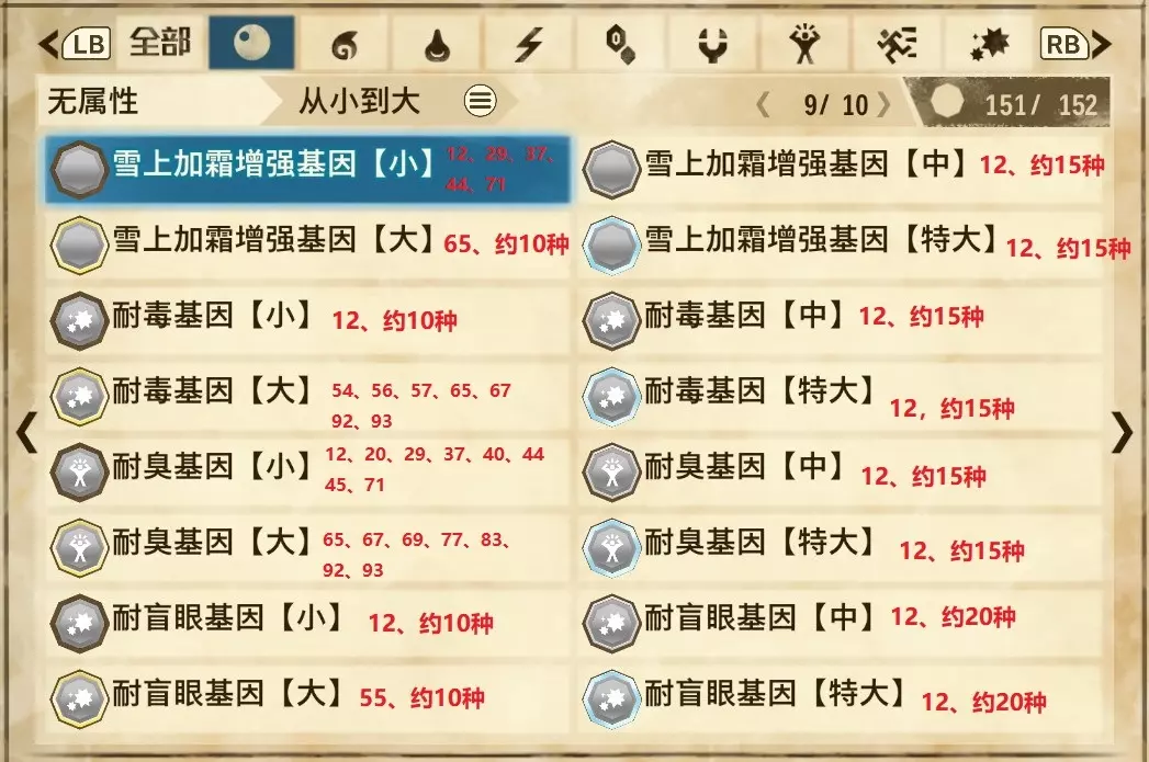 仅【高难度】系列任务 图鉴难点攻略(持续更新中) 先写感觉的几个难点吧,更具体的可以留言,我会再增加。 其余怪物基本均在对应下位明怪点附近的上位洞穴大概率刷新。 推荐:携带彩鸟或丝瓜等拥有【探测巢穴】技能的随从跑图刷怪 按图鉴顺序排列 001,上位草食龙:在新手村门口附近的上位普通洞穴,不用跑太远,大概率碰到正在睡觉或是回巢守蛋的上位草食龙。 017,上位雌狗龙:迷茫森林的上位普通洞穴,一定概率刷狗龙王,有几率出现雌狗龙同场。 021,上位鬼蛙:8星联机共斗任务【限时】两生种·平局。 033,上位波波。雪村门口的上位普通洞,大概率会遇到正在睡觉或是回巢守蛋的上位波波(刷法与上位草食龙相同)。 049,下位穿甲虫。 纳维雪岭地图尽头的大坑位置稳定刷新。 049和050,上位穿甲虫和上位重甲虫。 8星考验任务,【破坏部位】虫们的猛攻。 054,上位巨象。 8星联机共斗任务,【破坏部位】山神携随从挺进。 古龙巢穴5层,地图最下面的左边三岔口处稳定刷新。 060,上位盾虫【红】。 古龙巢穴6层,出门稳定刷新,与碎龙同场。 火山图上位普通洞和稀有洞均大概率刷新。 089,上位奇面族。 贝努戈火山脚,白海龙附近的上位普通洞,有一定概率刷新。(多数会在洞口附近,建议带彩鸟或丝瓜进图探怪,没有就退出重置。) 098,下位灭尽龙。 贝努戈火山脚-万之晶,地图尽头,初见咩咩子的场景图大坑附近稳定刷。 105,上位飞甲虫【红】。 古龙巢穴9层,地图下侧,风牙龙附近稳定刷。 111,上位大桶G艾露猫。 全古龙巢穴随机出。推荐:古龙里巢穴1层,最终的苍樱火附近大概率刷。 ————全基因图鉴———— ※:不得不说,怪猎物语这部分基因的概率低的离谱,肝了几天,还是没齐,暂时先发个残缺版的,不影响查找,后续替换!(建议先完成随从兽图鉴,对应基因孵蛋时即可解锁) ps:数字为怪物图鉴编号,超过10种以上的基因暂只提供首位编号。 ⚪无属性(共10页,本体152种)