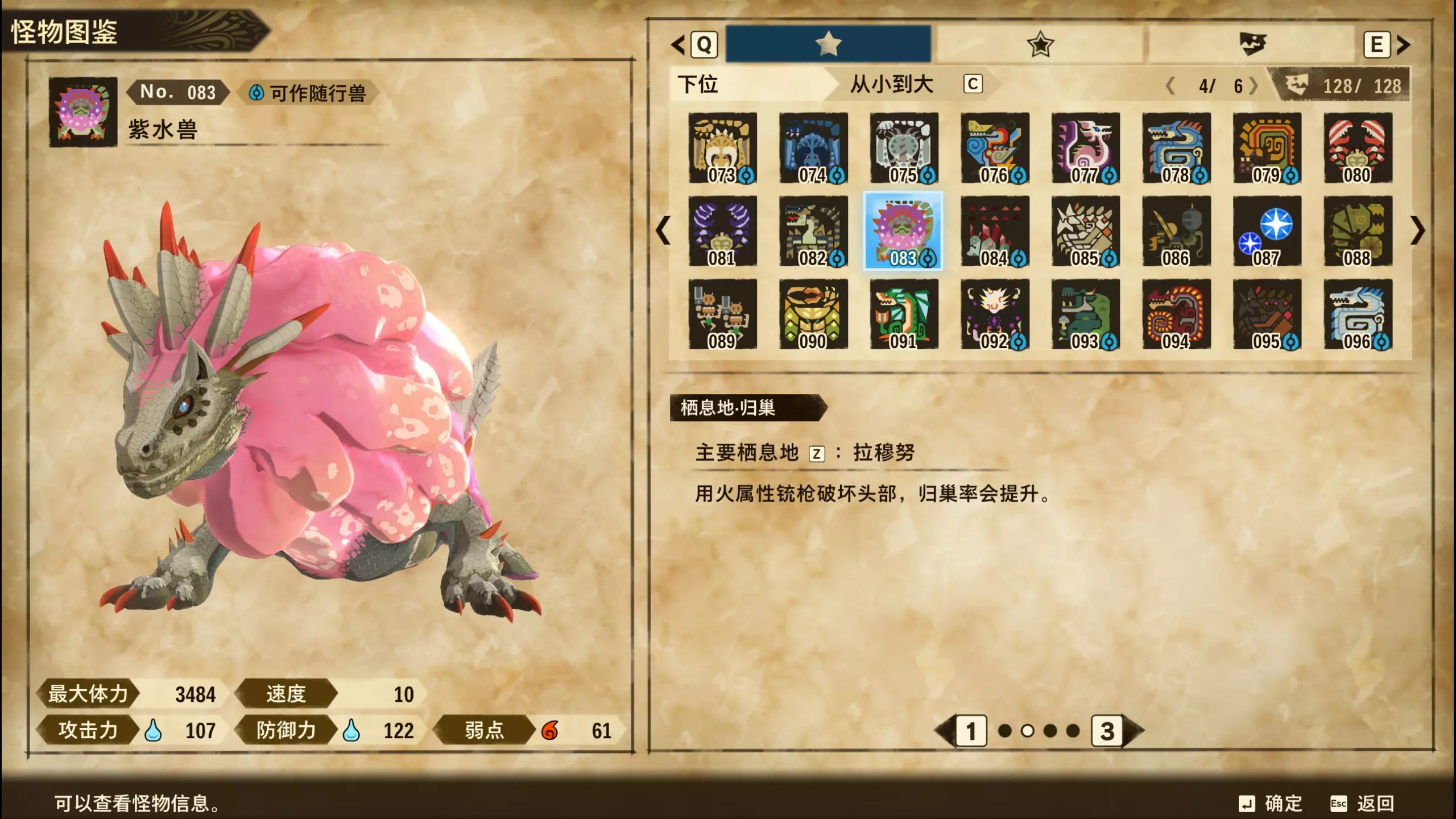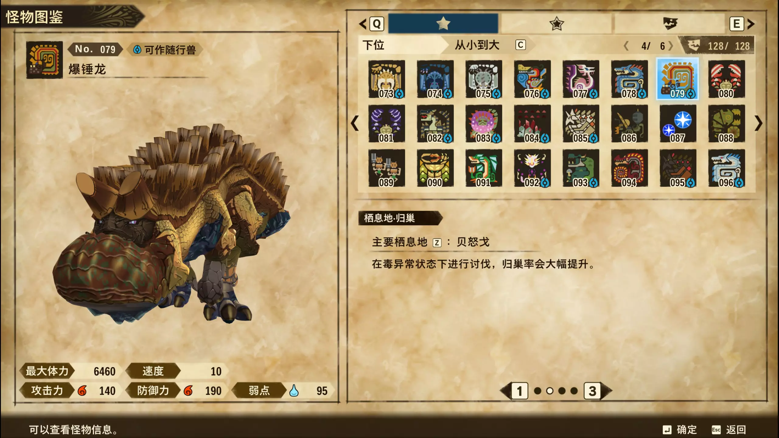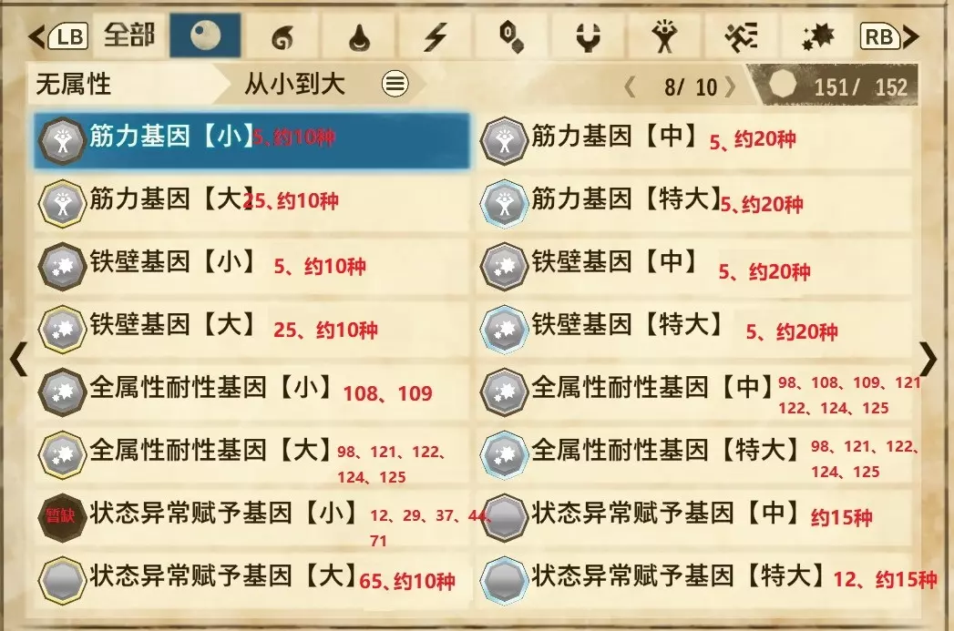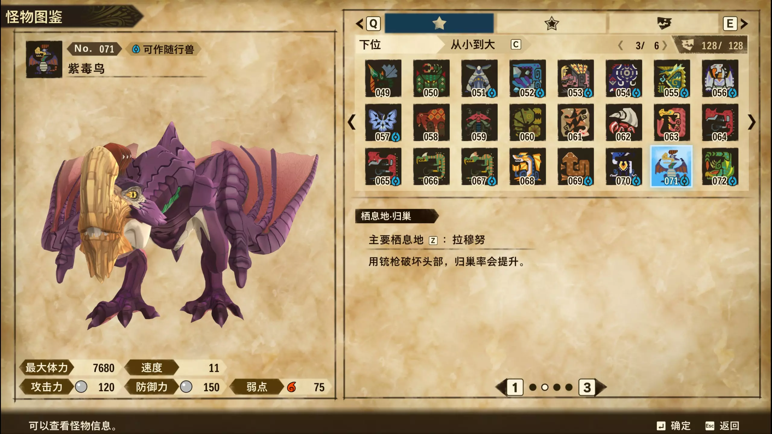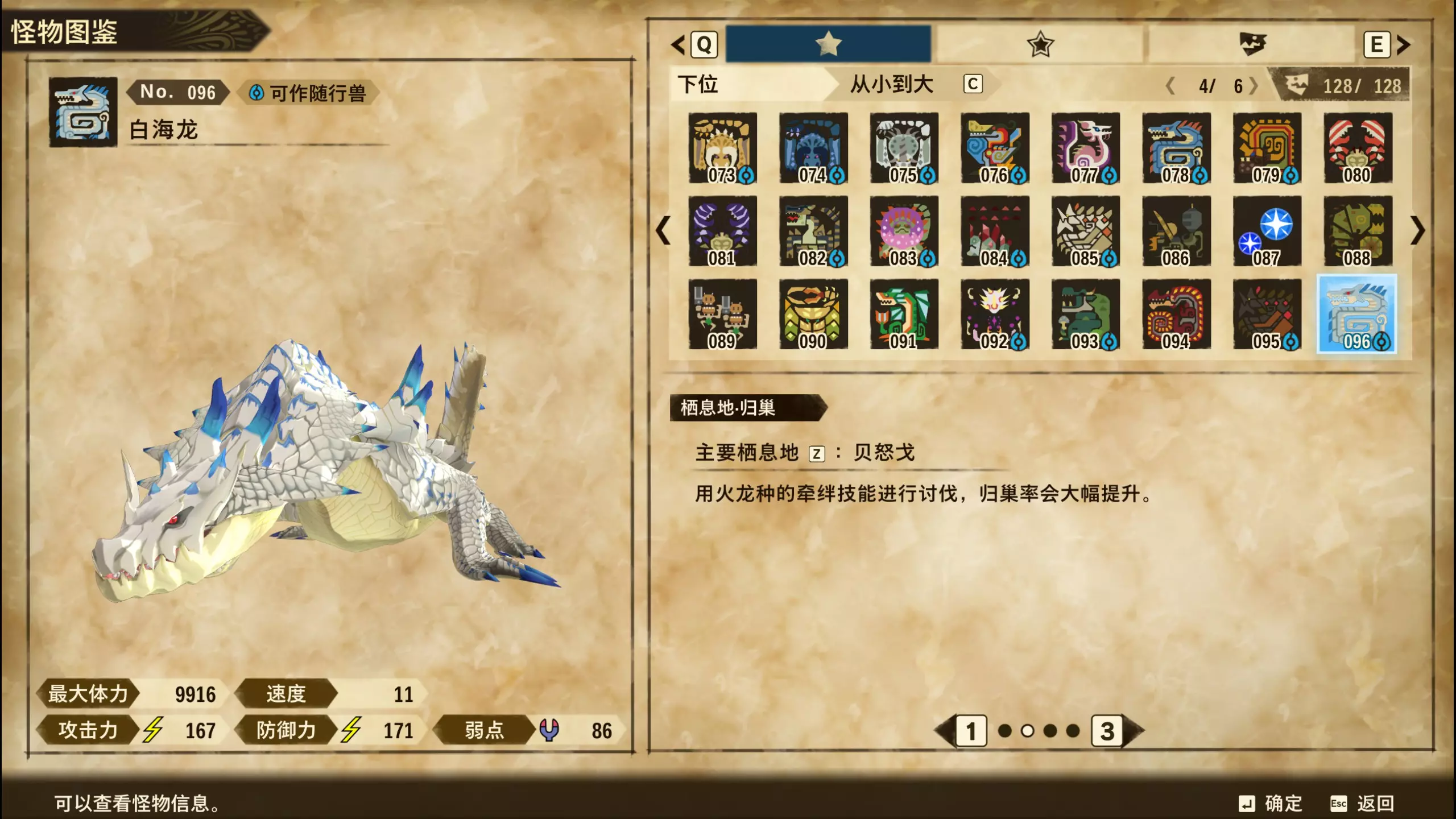 仅【高难度】系列任务 图鉴难点攻略(持续更新中) 先写感觉的几个难点吧,更具体的可以留言,我会再增加。 其余怪物基本均在对应下位明怪点附近的上位洞穴大概率刷新。 推荐:携带彩鸟或丝瓜等拥有【探测巢穴】技能的随从跑图刷怪 按图鉴顺序排列 001,上位草食龙:在新手村门口附近的上位普通洞穴,不用跑太远,大概率碰到正在睡觉或是回巢守蛋的上位草食龙。 017,上位雌狗龙:迷茫森林的上位普通洞穴,一定概率刷狗龙王,有几率出现雌狗龙同场。 021,上位鬼蛙:8星联机共斗任务【限时】两生种·平局。 033,上位波波。雪村门口的上位普通洞,大概率会遇到正在睡觉或是回巢守蛋的上位波波(刷法与上位草食龙相同)。 049,下位穿甲虫。 纳维雪岭地图尽头的大坑位置稳定刷新。 049和050,上位穿甲虫和上位重甲虫。 8星考验任务,【破坏部位】虫们的猛攻。 054,上位巨象。 8星联机共斗任务,【破坏部位】山神携随从挺进。 古龙巢穴5层,地图最下面的左边三岔口处稳定刷新。 060,上位盾虫【红】。 古龙巢穴6层,出门稳定刷新,与碎龙同场。 火山图上位普通洞和稀有洞均大概率刷新。 089,上位奇面族。 贝努戈火山脚,白海龙附近的上位普通洞,有一定概率刷新。(多数会在洞口附近,建议带彩鸟或丝瓜进图探怪,没有就退出重置。) 098,下位灭尽龙。 贝努戈火山脚-万之晶,地图尽头,初见咩咩子的场景图大坑附近稳定刷。 105,上位飞甲虫【红】。 古龙巢穴9层,地图下侧,风牙龙附近稳定刷。 111,上位大桶G艾露猫。 全古龙巢穴随机出。推荐:古龙里巢穴1层,最终的苍樱火附近大概率刷。 ————全基因图鉴———— ※:不得不说,怪猎物语这部分基因的概率低的离谱,肝了几天,还是没齐,暂时先发个残缺版的,不影响查找,后续替换!(建议先完成随从兽图鉴,对应基因孵蛋时即可解锁) ps:数字为怪物图鉴编号,超过10种以上的基因暂只提供首位编号。 ⚪无属性(共10页,本体152种)