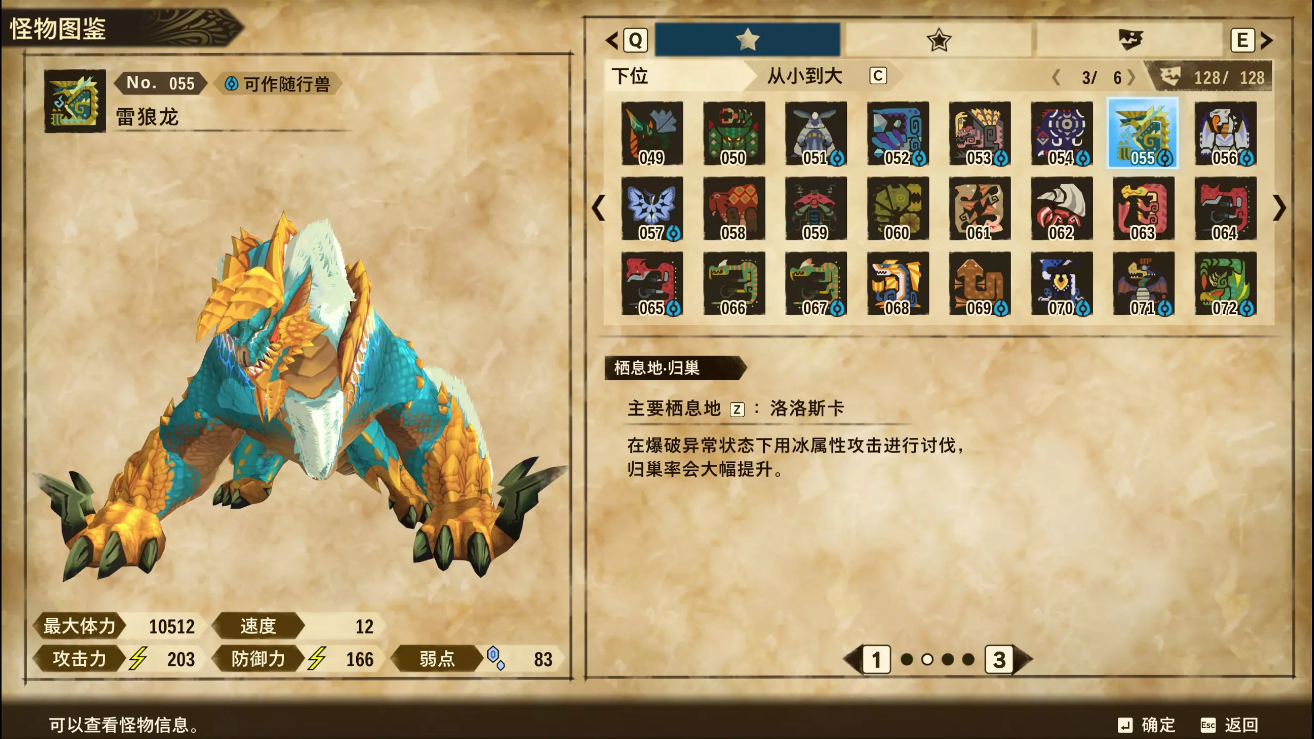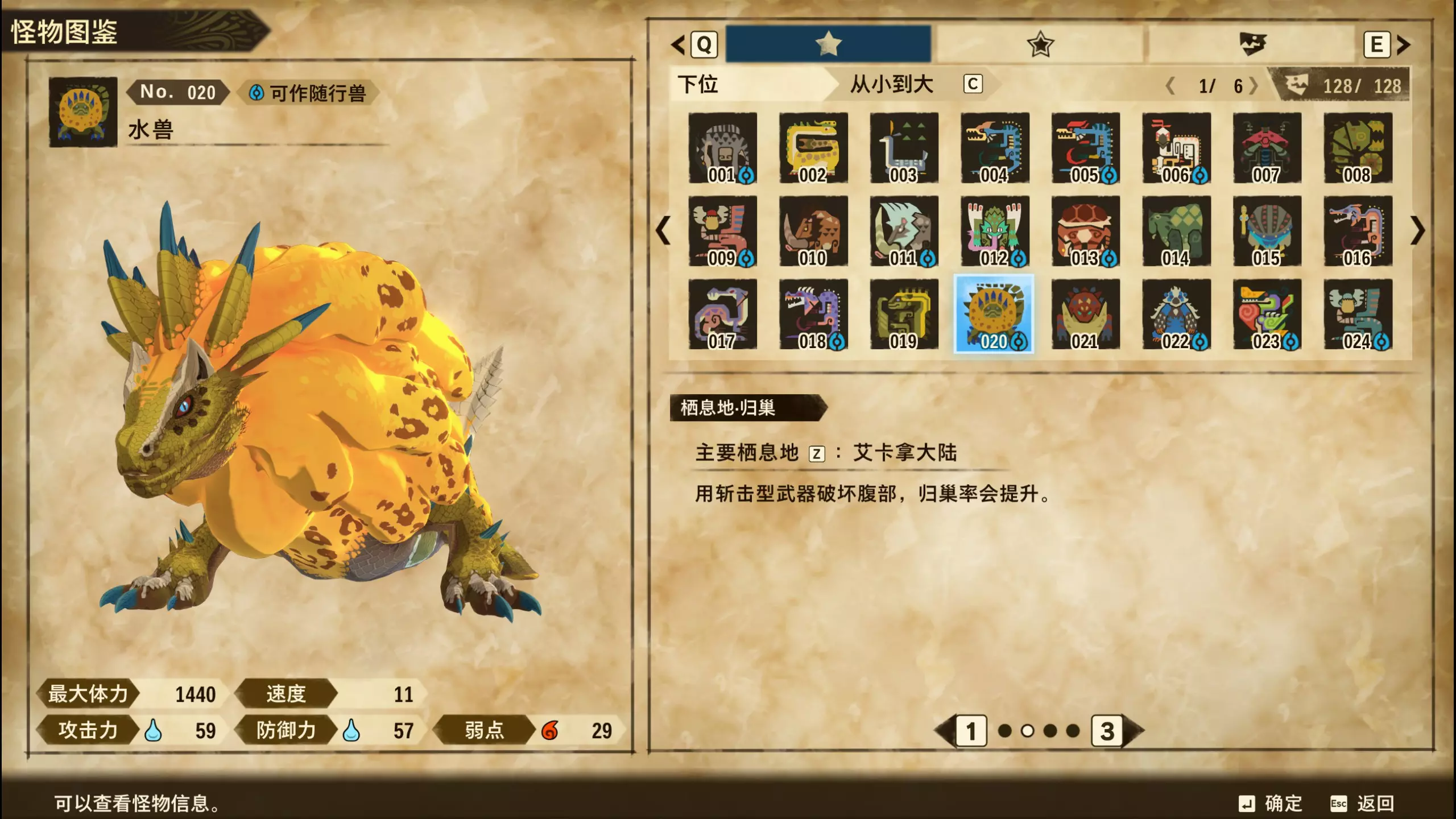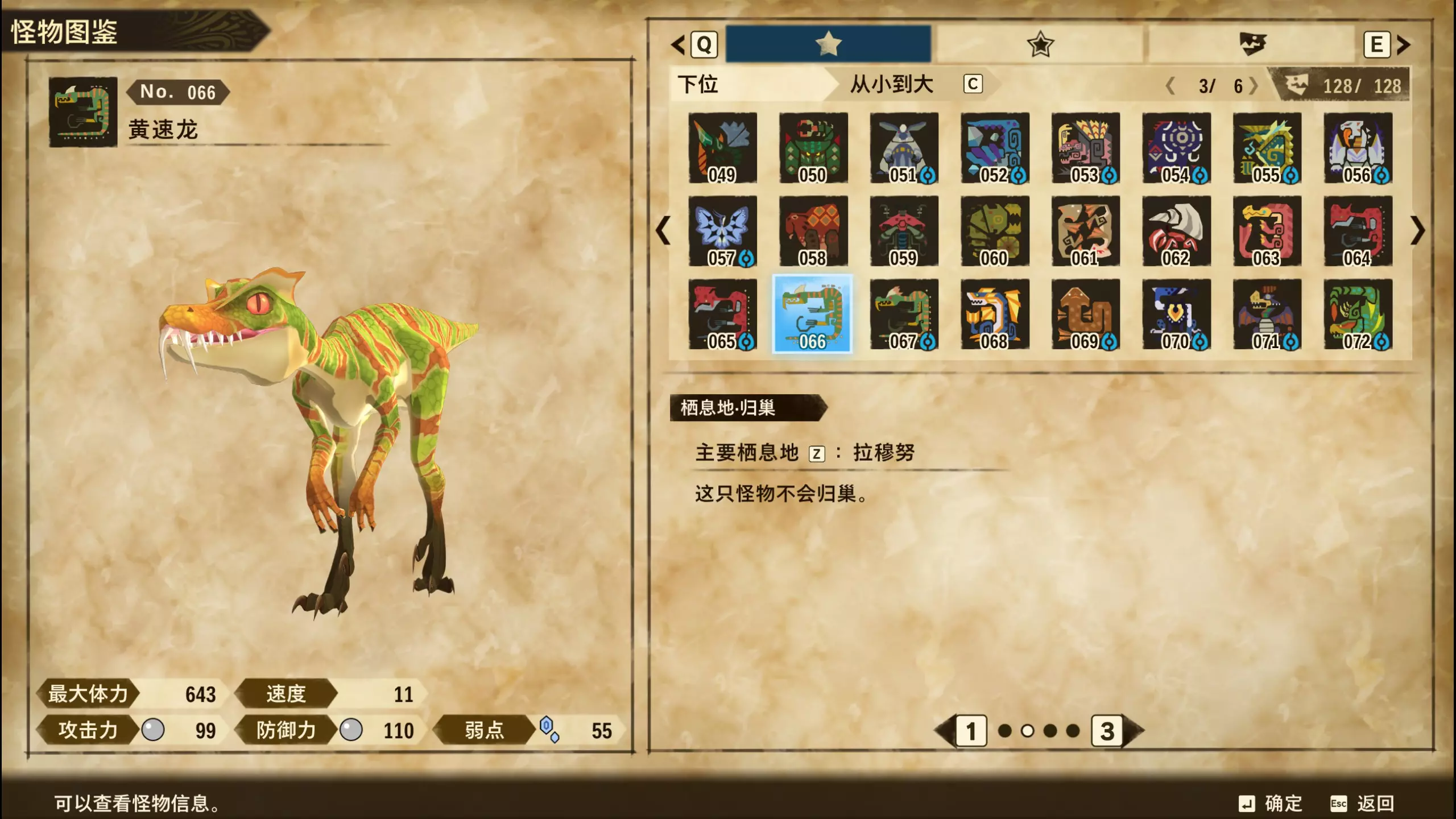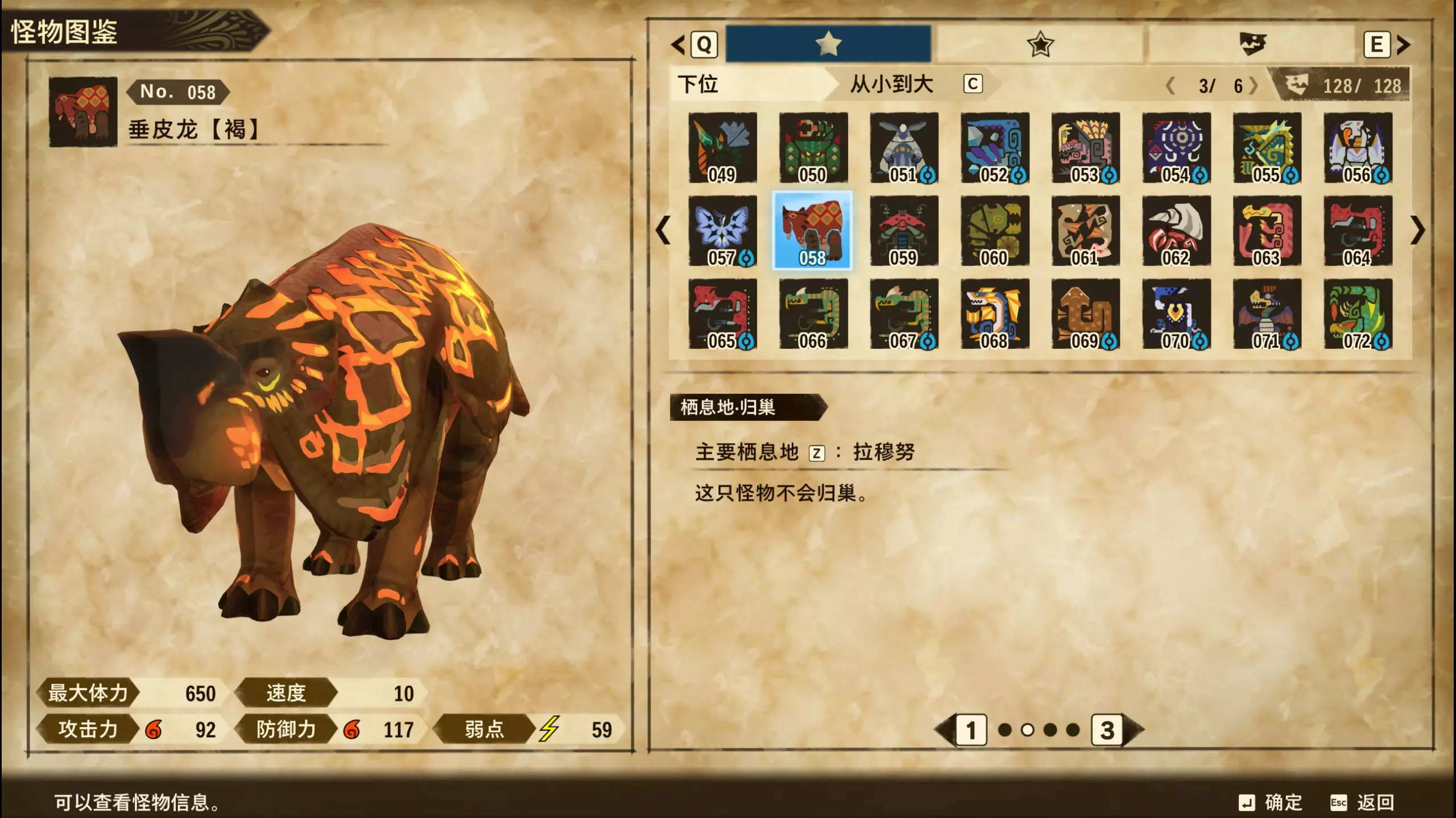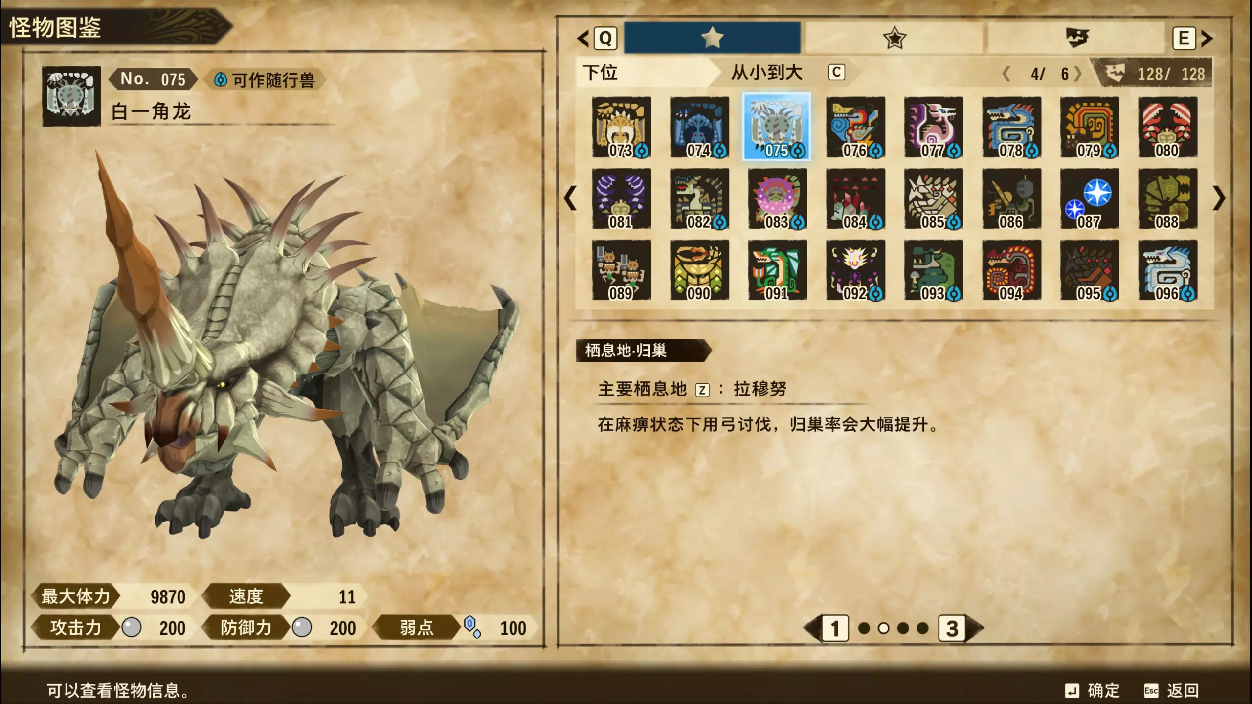 仅【高难度】系列任务 图鉴难点攻略(持续更新中) 先写感觉的几个难点吧,更具体的可以留言,我会再增加。 其余怪物基本均在对应下位明怪点附近的上位洞穴大概率刷新。 推荐:携带彩鸟或丝瓜等拥有【探测巢穴】技能的随从跑图刷怪 按图鉴顺序排列 001,上位草食龙:在新手村门口附近的上位普通洞穴,不用跑太远,大概率碰到正在睡觉或是回巢守蛋的上位草食龙。 017,上位雌狗龙:迷茫森林的上位普通洞穴,一定概率刷狗龙王,有几率出现雌狗龙同场。 021,上位鬼蛙:8星联机共斗任务【限时】两生种·平局。 033,上位波波。雪村门口的上位普通洞,大概率会遇到正在睡觉或是回巢守蛋的上位波波(刷法与上位草食龙相同)。 049,下位穿甲虫。 纳维雪岭地图尽头的大坑位置稳定刷新。 049和050,上位穿甲虫和上位重甲虫。 8星考验任务,【破坏部位】虫们的猛攻。 054,上位巨象。 8星联机共斗任务,【破坏部位】山神携随从挺进。 古龙巢穴5层,地图最下面的左边三岔口处稳定刷新。 060,上位盾虫【红】。 古龙巢穴6层,出门稳定刷新,与碎龙同场。 火山图上位普通洞和稀有洞均大概率刷新。 089,上位奇面族。 贝努戈火山脚,白海龙附近的上位普通洞,有一定概率刷新。(多数会在洞口附近,建议带彩鸟或丝瓜进图探怪,没有就退出重置。) 098,下位灭尽龙。 贝努戈火山脚-万之晶,地图尽头,初见咩咩子的场景图大坑附近稳定刷。 105,上位飞甲虫【红】。 古龙巢穴9层,地图下侧,风牙龙附近稳定刷。 111,上位大桶G艾露猫。 全古龙巢穴随机出。推荐:古龙里巢穴1层,最终的苍樱火附近大概率刷。 ————全基因图鉴———— ※:不得不说,怪猎物语这部分基因的概率低的离谱,肝了几天,还是没齐,暂时先发个残缺版的,不影响查找,后续替换!(建议先完成随从兽图鉴,对应基因孵蛋时即可解锁) ps:数字为怪物图鉴编号,超过10种以上的基因暂只提供首位编号。 ⚪无属性(共10页,本体152种)