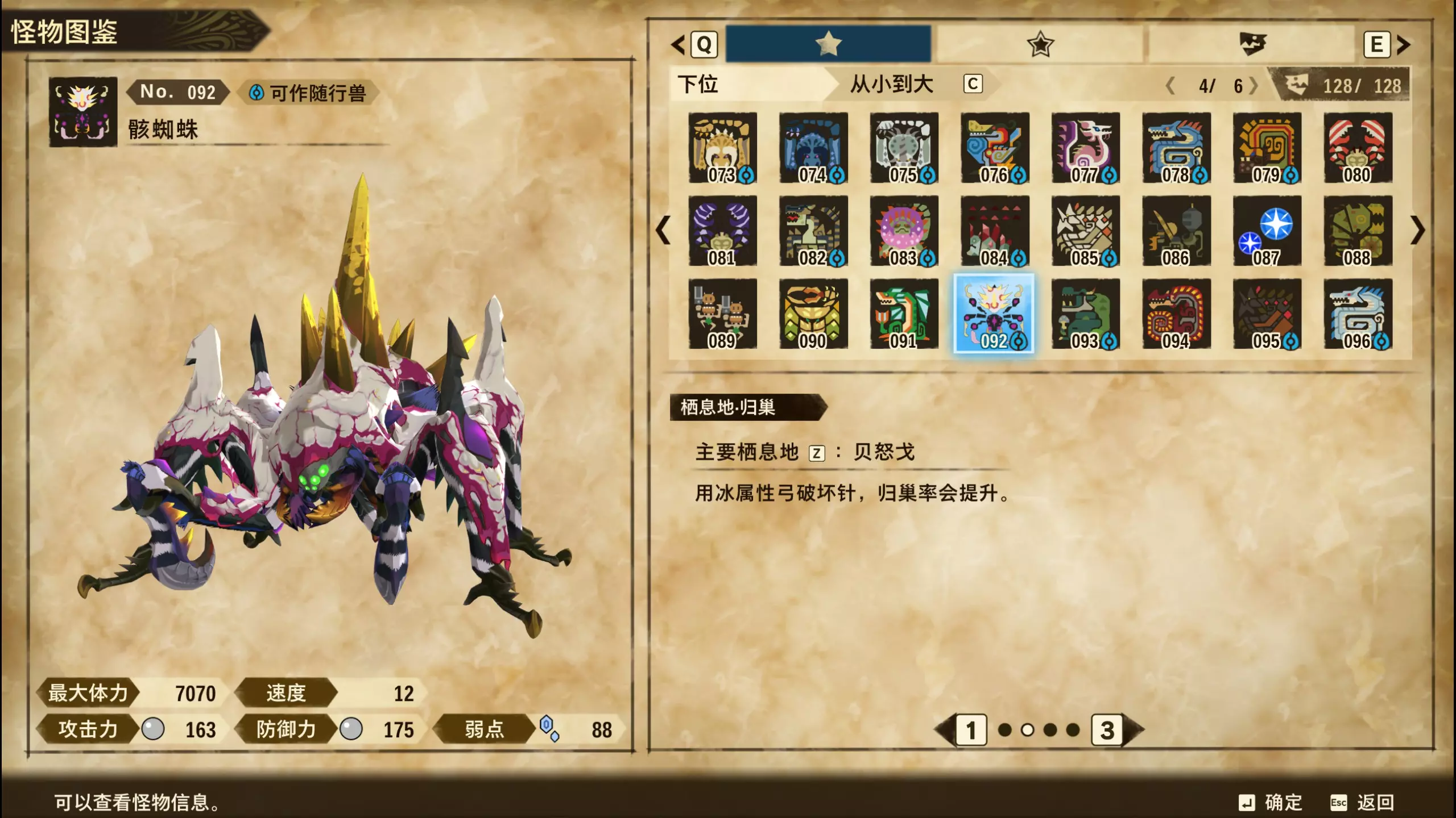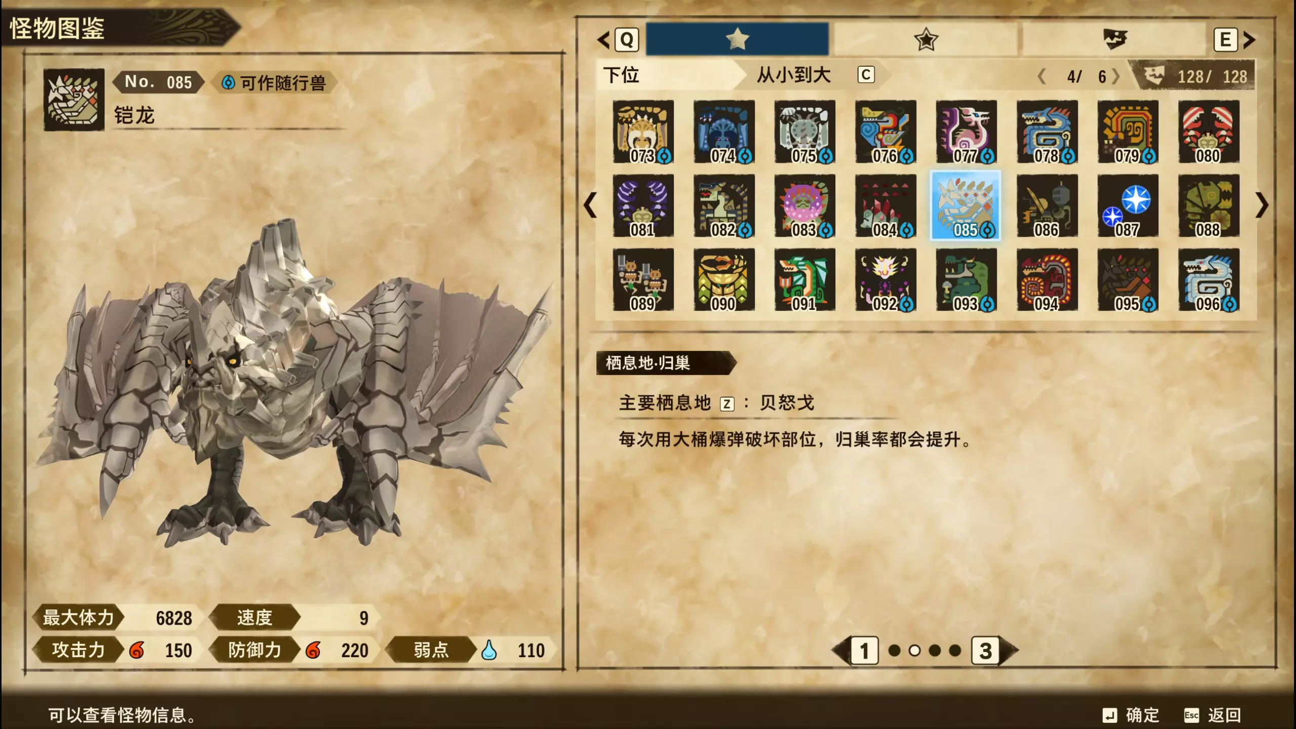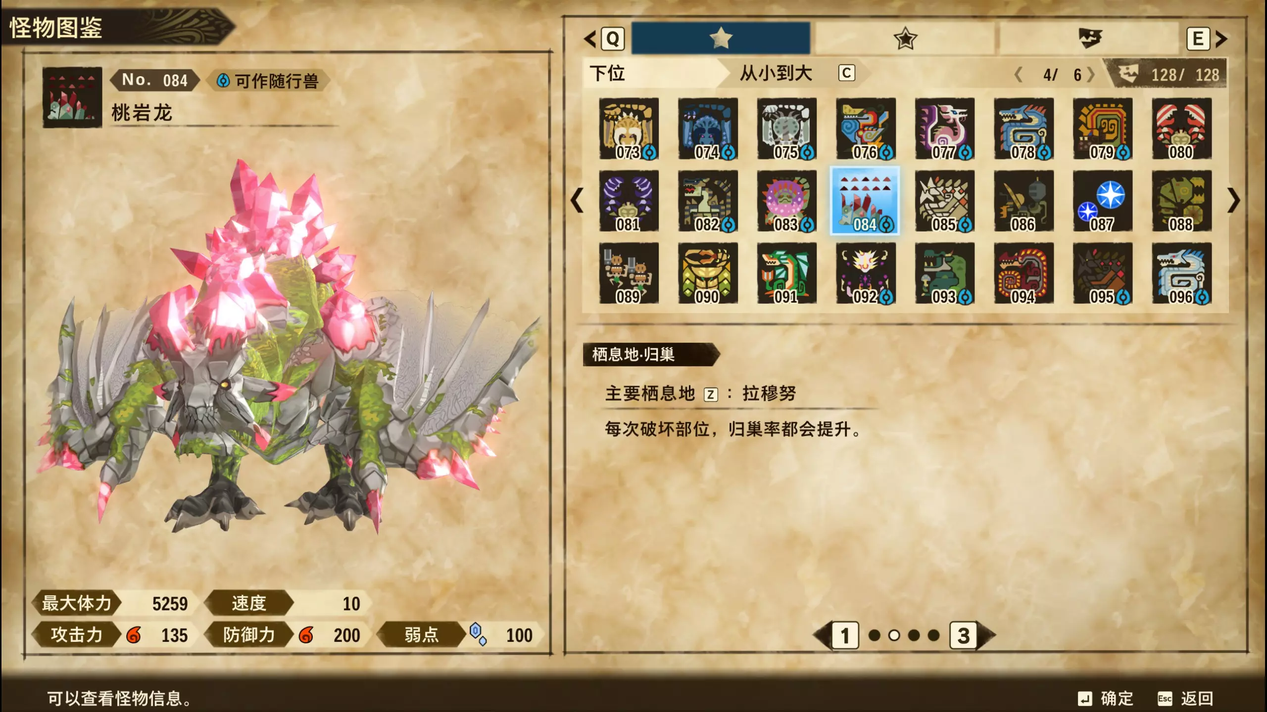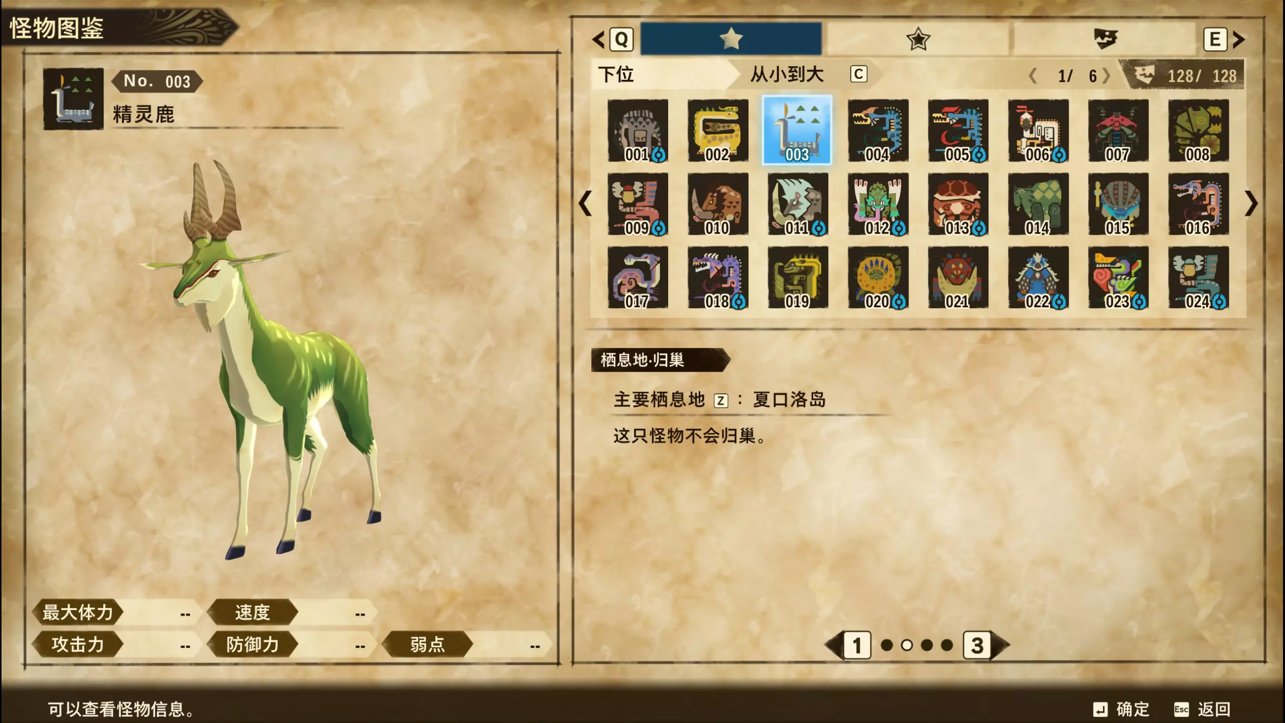 仅【高难度】系列任务 图鉴难点攻略(持续更新中) 先写感觉的几个难点吧,更具体的可以留言,我会再增加。 其余怪物基本均在对应下位明怪点附近的上位洞穴大概率刷新。 推荐:携带彩鸟或丝瓜等拥有【探测巢穴】技能的随从跑图刷怪 按图鉴顺序排列 001,上位草食龙:在新手村门口附近的上位普通洞穴,不用跑太远,大概率碰到正在睡觉或是回巢守蛋的上位草食龙。 017,上位雌狗龙:迷茫森林的上位普通洞穴,一定概率刷狗龙王,有几率出现雌狗龙同场。 021,上位鬼蛙:8星联机共斗任务【限时】两生种·平局。 033,上位波波。雪村门口的上位普通洞,大概率会遇到正在睡觉或是回巢守蛋的上位波波(刷法与上位草食龙相同)。 049,下位穿甲虫。 纳维雪岭地图尽头的大坑位置稳定刷新。 049和050,上位穿甲虫和上位重甲虫。 8星考验任务,【破坏部位】虫们的猛攻。 054,上位巨象。 8星联机共斗任务,【破坏部位】山神携随从挺进。 古龙巢穴5层,地图最下面的左边三岔口处稳定刷新。 060,上位盾虫【红】。 古龙巢穴6层,出门稳定刷新,与碎龙同场。 火山图上位普通洞和稀有洞均大概率刷新。 089,上位奇面族。 贝努戈火山脚,白海龙附近的上位普通洞,有一定概率刷新。(多数会在洞口附近,建议带彩鸟或丝瓜进图探怪,没有就退出重置。) 098,下位灭尽龙。 贝努戈火山脚-万之晶,地图尽头,初见咩咩子的场景图大坑附近稳定刷。 105,上位飞甲虫【红】。 古龙巢穴9层,地图下侧,风牙龙附近稳定刷。 111,上位大桶G艾露猫。 全古龙巢穴随机出。推荐:古龙里巢穴1层,最终的苍樱火附近大概率刷。 ————全基因图鉴———— ※:不得不说,怪猎物语这部分基因的概率低的离谱,肝了几天,还是没齐,暂时先发个残缺版的,不影响查找,后续替换!(建议先完成随从兽图鉴,对应基因孵蛋时即可解锁) ps:数字为怪物图鉴编号,超过10种以上的基因暂只提供首位编号。 ⚪无属性(共10页,本体152种)