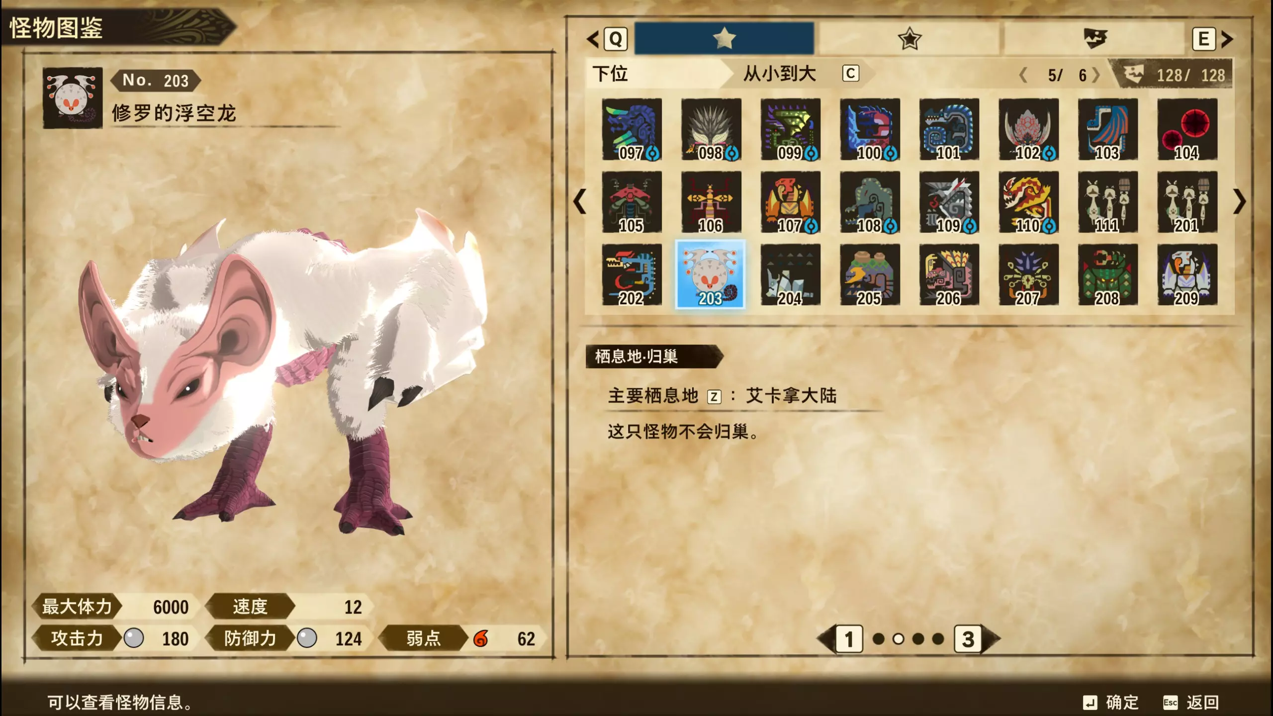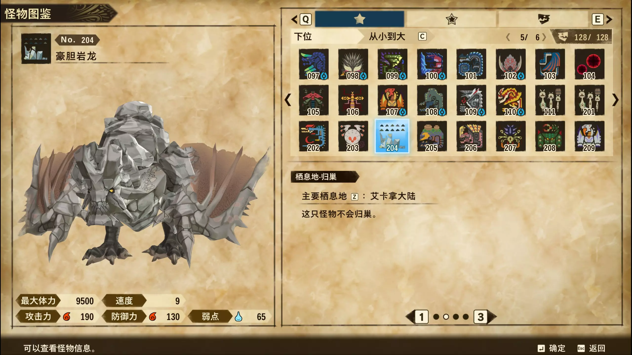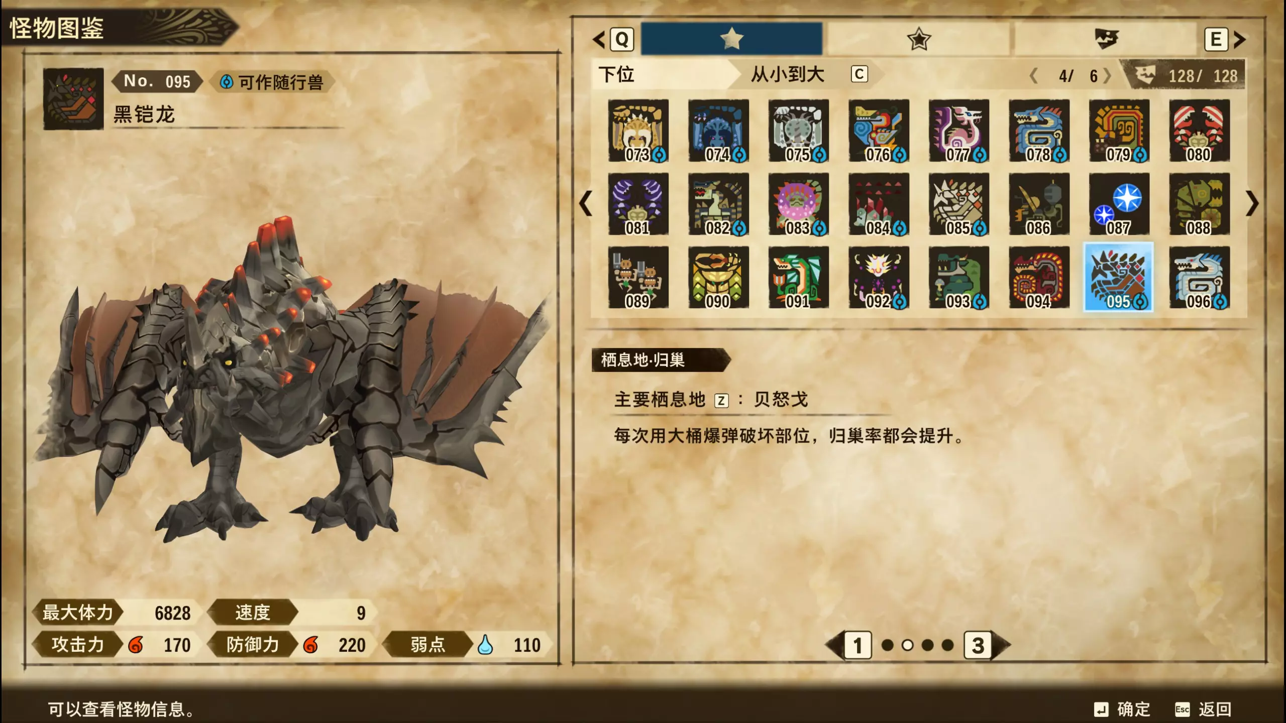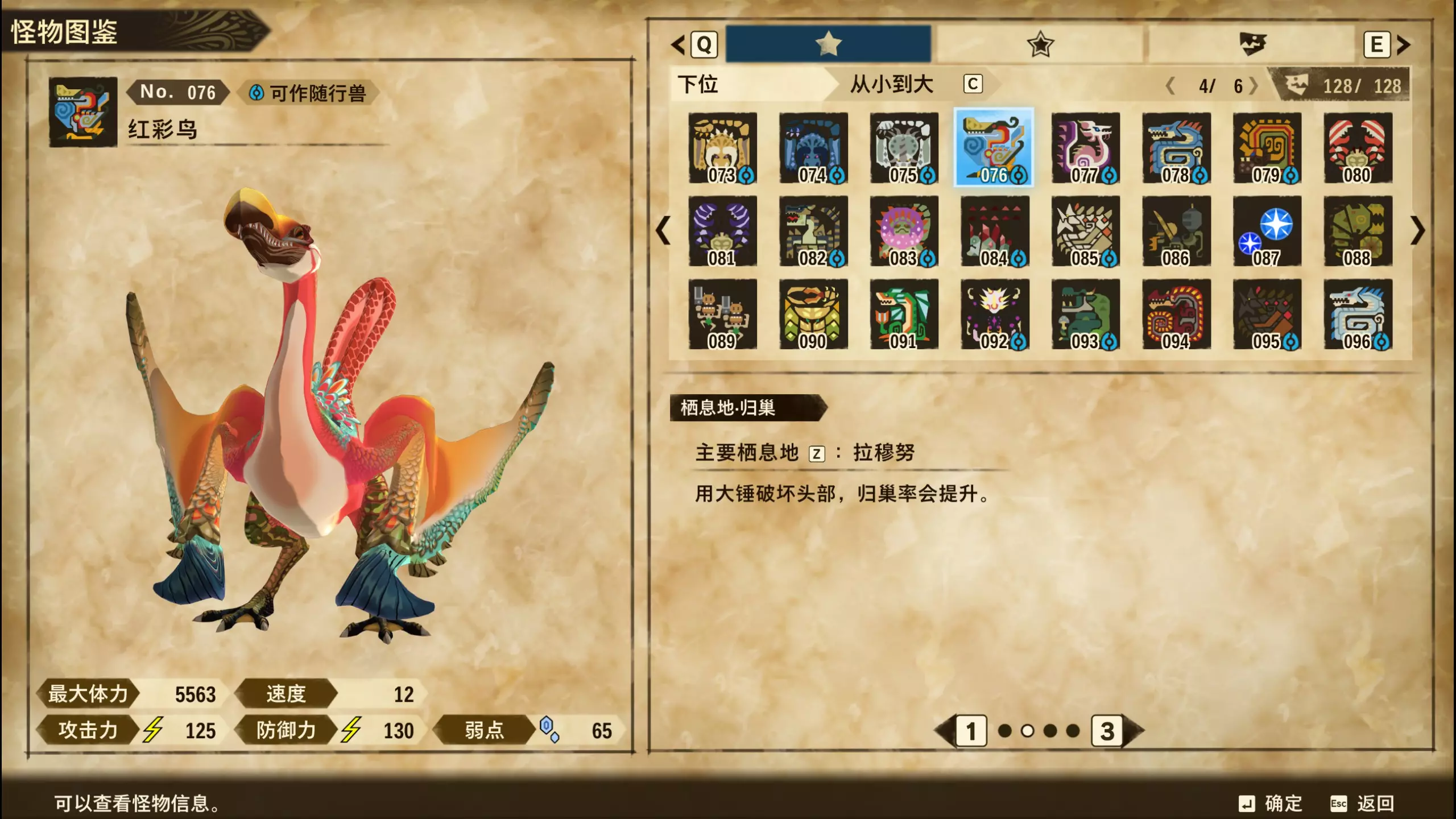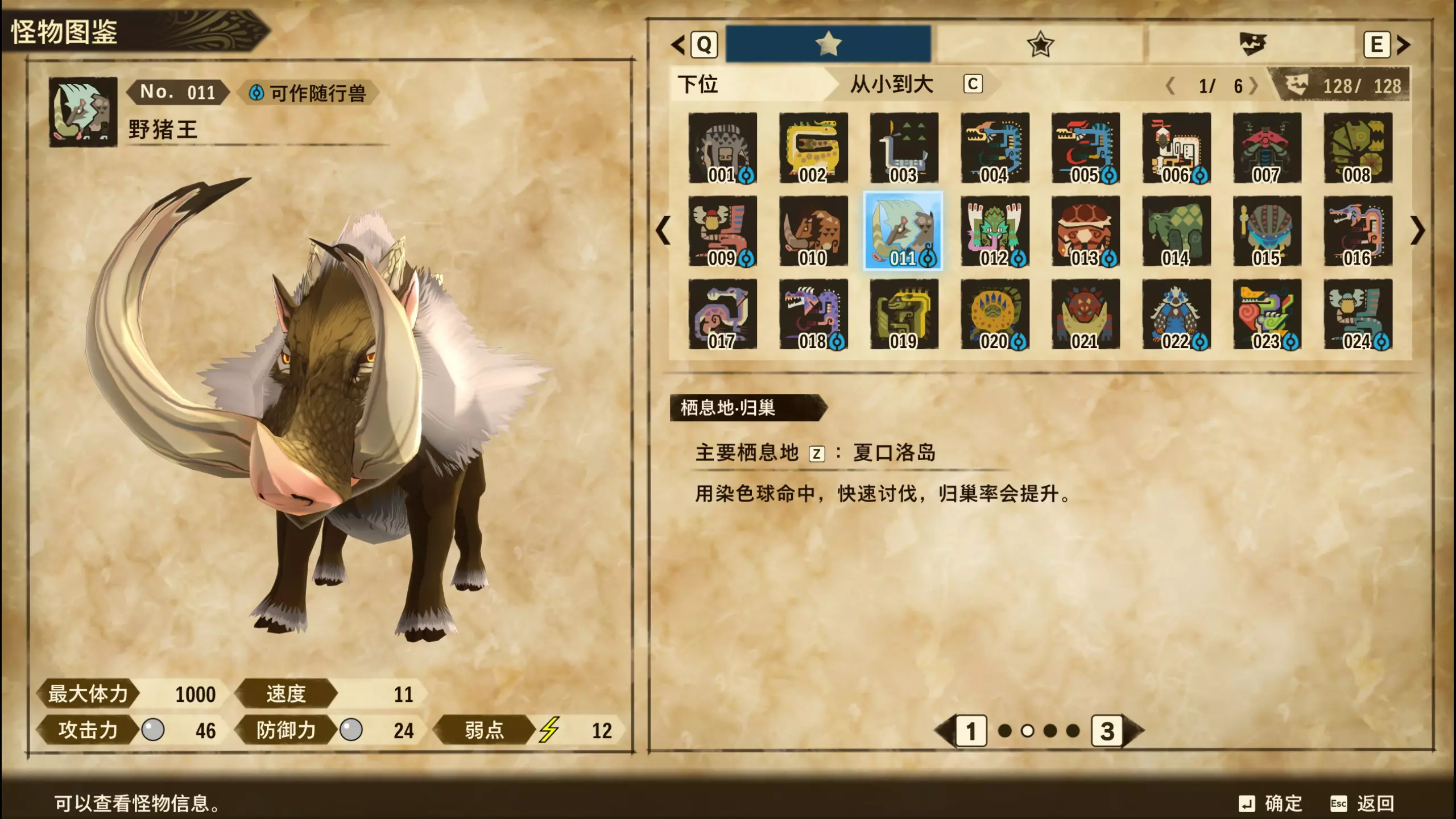 仅【高难度】系列任务 图鉴难点攻略(持续更新中) 先写感觉的几个难点吧,更具体的可以留言,我会再增加。 其余怪物基本均在对应下位明怪点附近的上位洞穴大概率刷新。 推荐:携带彩鸟或丝瓜等拥有【探测巢穴】技能的随从跑图刷怪 按图鉴顺序排列 001,上位草食龙:在新手村门口附近的上位普通洞穴,不用跑太远,大概率碰到正在睡觉或是回巢守蛋的上位草食龙。 017,上位雌狗龙:迷茫森林的上位普通洞穴,一定概率刷狗龙王,有几率出现雌狗龙同场。 021,上位鬼蛙:8星联机共斗任务【限时】两生种·平局。 033,上位波波。雪村门口的上位普通洞,大概率会遇到正在睡觉或是回巢守蛋的上位波波(刷法与上位草食龙相同)。 049,下位穿甲虫。 纳维雪岭地图尽头的大坑位置稳定刷新。 049和050,上位穿甲虫和上位重甲虫。 8星考验任务,【破坏部位】虫们的猛攻。 054,上位巨象。 8星联机共斗任务,【破坏部位】山神携随从挺进。 古龙巢穴5层,地图最下面的左边三岔口处稳定刷新。 060,上位盾虫【红】。 古龙巢穴6层,出门稳定刷新,与碎龙同场。 火山图上位普通洞和稀有洞均大概率刷新。 089,上位奇面族。 贝努戈火山脚,白海龙附近的上位普通洞,有一定概率刷新。(多数会在洞口附近,建议带彩鸟或丝瓜进图探怪,没有就退出重置。) 098,下位灭尽龙。 贝努戈火山脚-万之晶,地图尽头,初见咩咩子的场景图大坑附近稳定刷。 105,上位飞甲虫【红】。 古龙巢穴9层,地图下侧,风牙龙附近稳定刷。 111,上位大桶G艾露猫。 全古龙巢穴随机出。推荐:古龙里巢穴1层,最终的苍樱火附近大概率刷。 ————全基因图鉴———— ※:不得不说,怪猎物语这部分基因的概率低的离谱,肝了几天,还是没齐,暂时先发个残缺版的,不影响查找,后续替换!(建议先完成随从兽图鉴,对应基因孵蛋时即可解锁) ps:数字为怪物图鉴编号,超过10种以上的基因暂只提供首位编号。 ⚪无属性(共10页,本体152种)