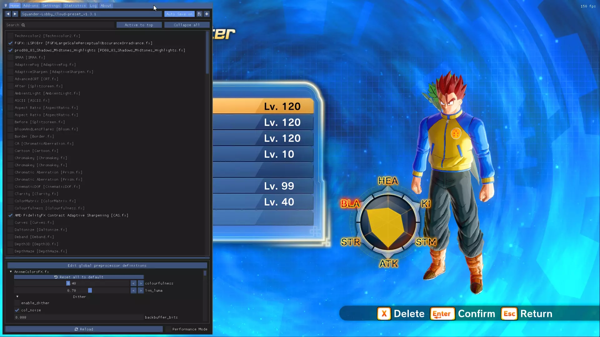 本次安装非常简单,不需要使用之前提到的任何模组安装器。操作方法如下:下载该文件,解压后将所有内容粘贴到“bin”文件夹中,即可自动完成安装。 注意:3D Vision也会触发Easy Anti Cheat(反作弊系统)保护,因此你需要像运行其他模组一样运行它。 4.2 ReShade(更好的后期处理) ReShade是一款为(几乎)所有3D游戏提供高级后期处理的工具,这意味着可以通过着色器和其他视觉效果来改善画面。如果你想让《龙珠:超宇宙》拥有类似动画的画面,甚至添加电影颗粒感,这款工具非常合适。与其他模组不同,ReShade无需补丁程序和安装程序即可使用,并且可以在线使用,完全没有问题。 ReShade可通过其官方网站下载,仅包含一个可执行文件。安装时,打开该可执行文件,选择“DBXV2.exe”文件,然后点击“下一步”。此时会提示选择相应的渲染API,选择“Direct X 10/11/12”即可。之后,安装程序会提供选择自己的着色器或基于现有预设安装的选项。《龙珠:超宇宙2》有多种ReShade预设,尤其是在VGM上,你可以选择最喜欢的进行安装。 启动游戏时,屏幕顶部会出现一个覆盖层。然后你可以按下【Home】键打开配置菜单,从中选择已安装的预设,并调整与之配套的各种着色器(下方是游戏中ReShade配置覆盖界面的图片)。