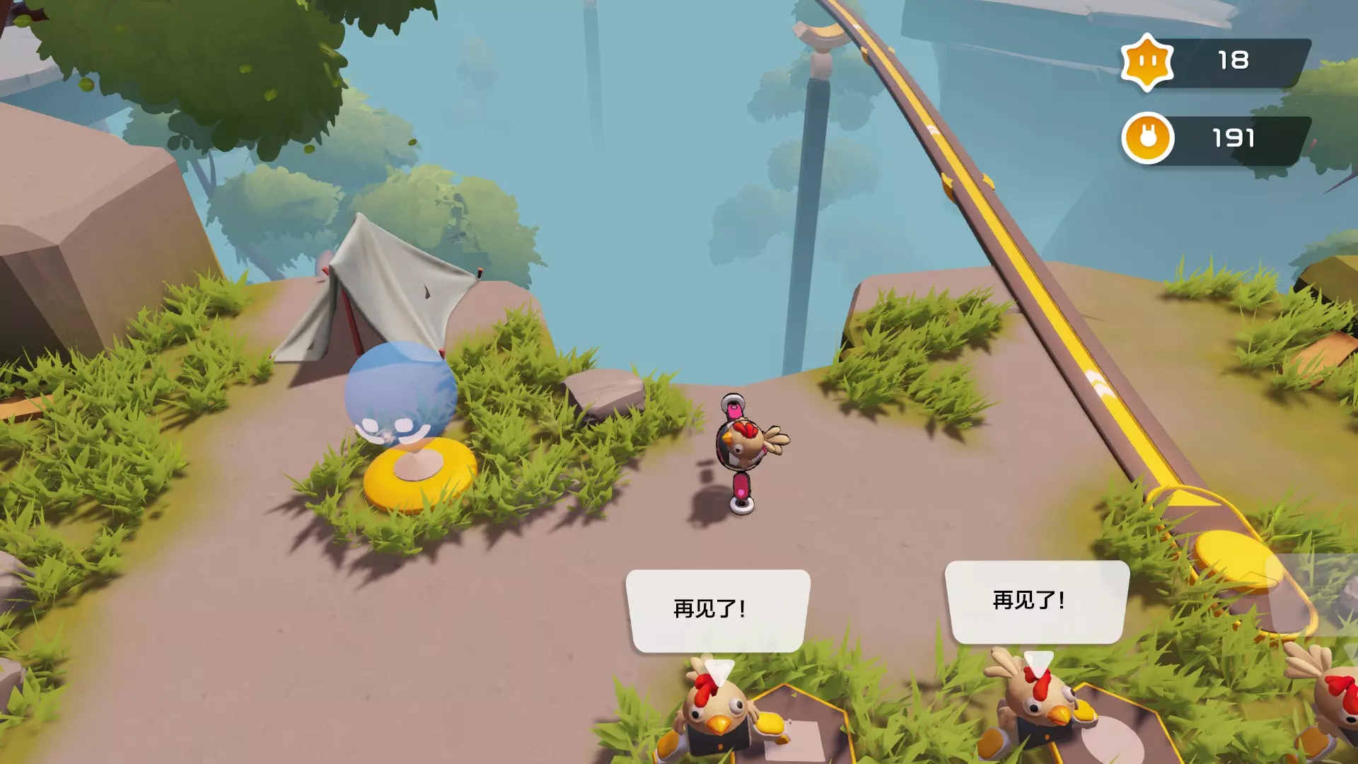第二关“森林中的走廊” 这一关算得上是最隐蔽的了,星星藏在图示的第一只鸡仔的后方,也就是鸡仔脚趾的方向,下方有一个隐藏的弹床,弹起即可成功收集上方的星星。