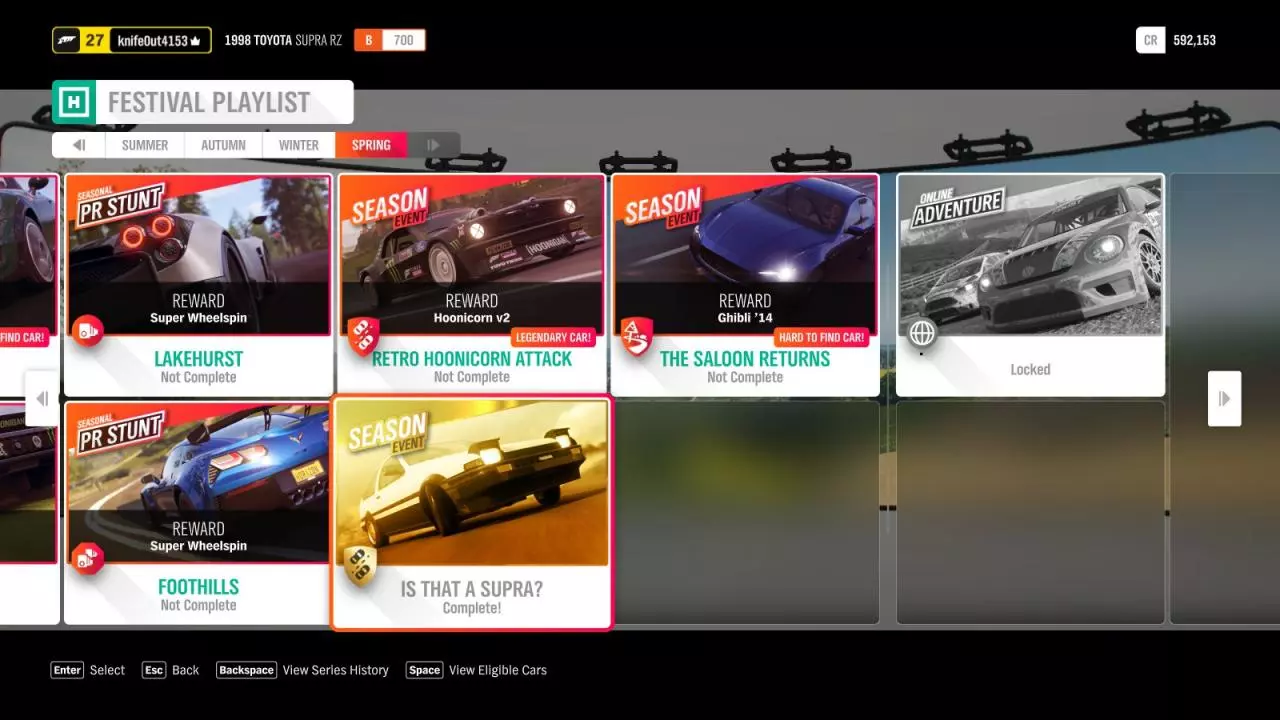 对于丰田和《头文字D》的粉丝们,这里有一个在《极限竞速:地平线4》中解锁这辆车并播放Eurobeat(欧陆节拍)的简单方法。 步骤: 1. 获得地平线花名册资格。 要获得解锁车辆的机会,首先需要完成游戏的“教程”并获得地平线嘉年华的访问权限。在获得足够的影响力点数以进入地平线花名册后,你将能够参与地平线嘉年华播放列表活动。(首要目标是获得秋季资格,然后是冬季、春季,之后即可进入地平线花名册。) 以下是查找播放列表位置的示例。