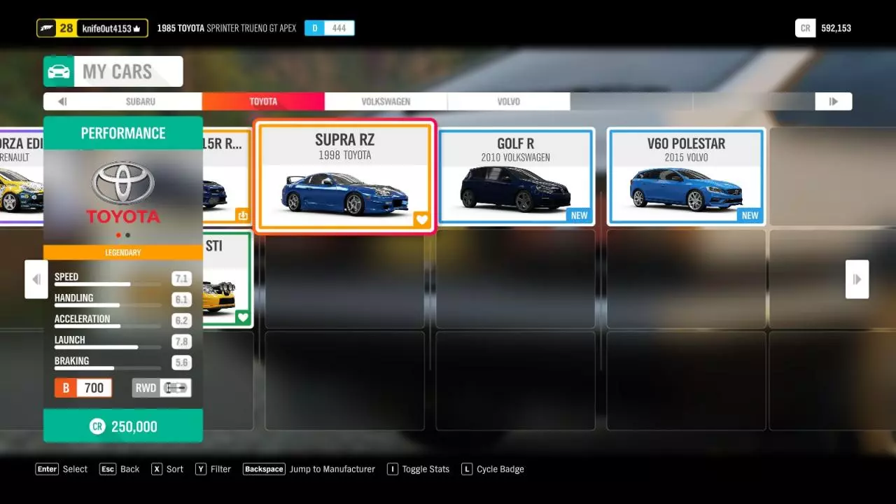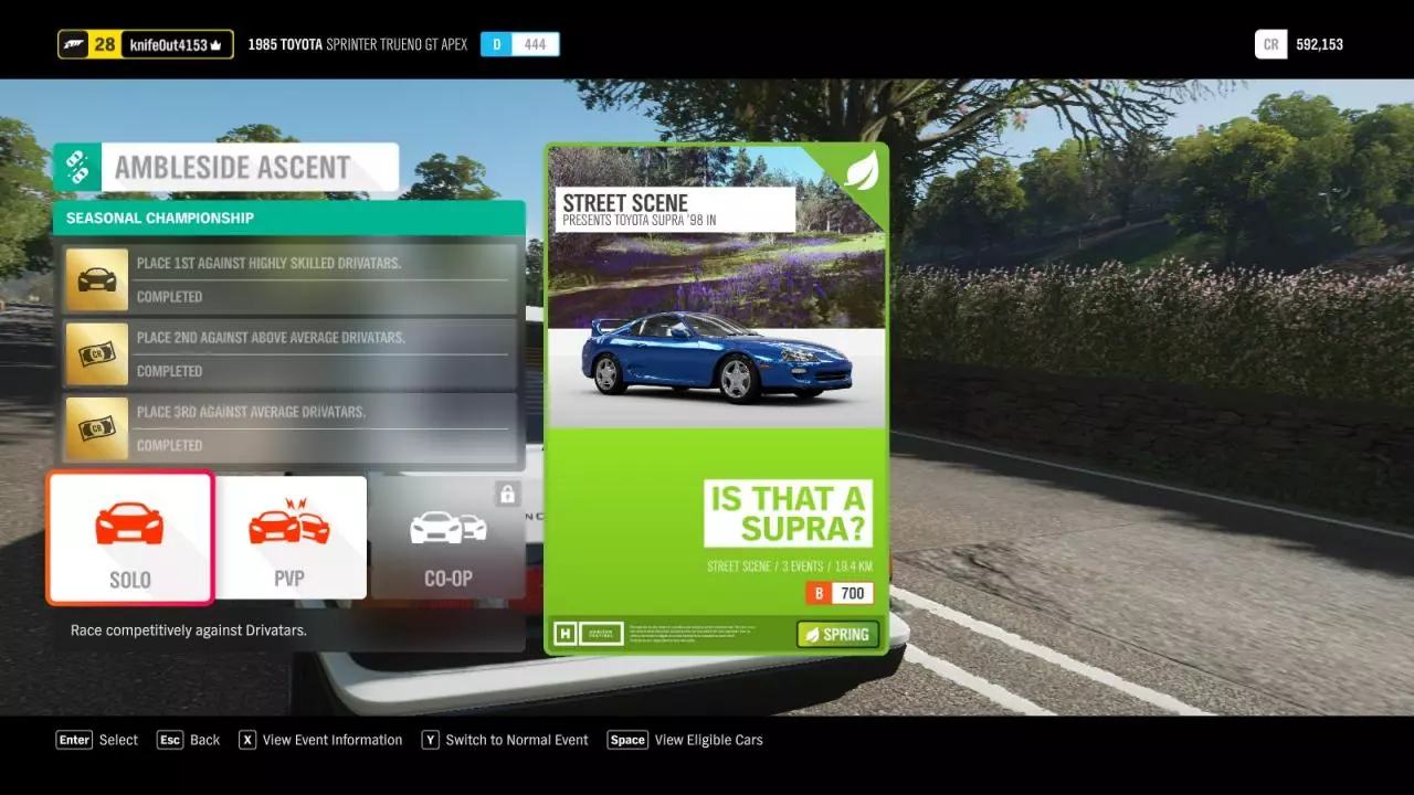 第二,获取一辆性能评分700的丰田Supra RZ。 当你获得节日播放列表的访问权限后,你就已经完成了一半。你需要250,000游戏货币来购买丰田Supra RZ,因为要解锁Trueno,你需要驾驶Supra赢得一个锦标赛,不过要注意该锦标赛对车辆性能评分的限制为700。