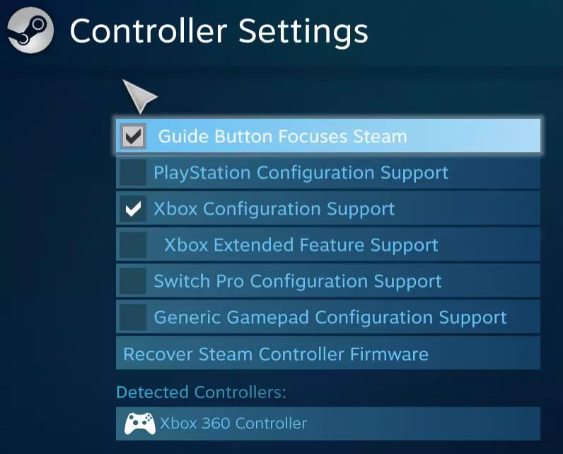 步骤5: 勾选【指南按钮聚焦】、【Steam】和【Xbox配置支持】复选框。