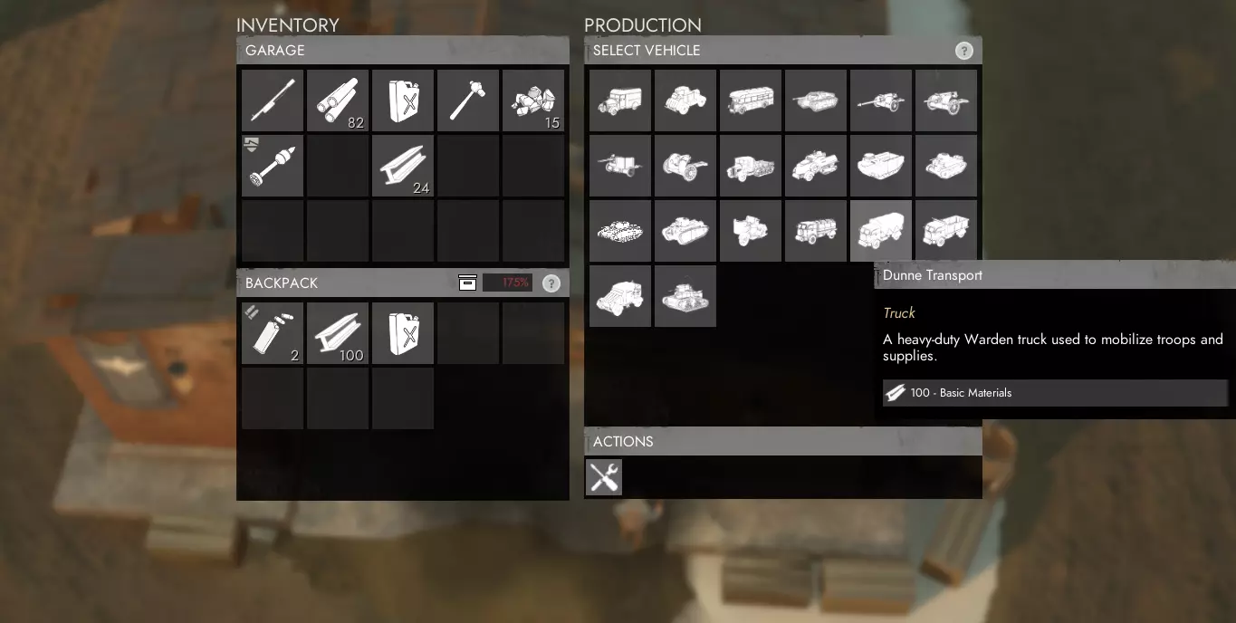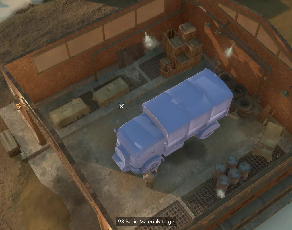 你需要等待几分钟让你的回收物完成精炼,在此期间你可以选择继续收集更多回收物,或者就在精炼厂旁等待精炼完成。在精炼过程中的任何时候,你都可以将已完成精炼的部分资源提取回你的卡车库存中。 铁和铝:你有机会从回收场获得铁和铝。当你获得这些资源后,需要将它们送到精炼厂进行精炼,之后才能提交到工程中心的科技树中。 每个回收场在被完全清理前,只能产出铁或铝中的一种,而不是两种都有。一旦回收场重新生成,它就可能开始产出另一种资源。 工厂的物资生产:基础材料有多种用途,甚至在前线和后方的建造中都能用到。现在你需要使用这些材料在工厂中制造一些武器、弹药和其他装备。和炼油厂一样,你需要坐在卡车驾驶座上才能进入工厂。可生产的不同物品按类别划分,显示在中间区域的不同标签页中。某些物品,例如基础步枪和弹药,只需基础材料即可生产,而其他更高级的物品,例如炮弹,则需要爆炸物或重型爆炸物等不同资源。