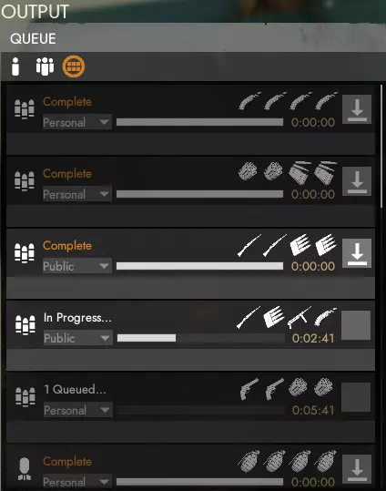 当你从工厂生产物品时,队列时间是公开的。这意味着如果有人和你在同一类别下下了订单,你必须等他们的订单完成后,你的订单才会开始。每个类别一次最多只能排队四个订单,这可能会导致你无法下达想要的订单。 你可以将订单设置为私人、小队或公开,以决定订单完成后谁可以领取。如果你切换队列标签,可以在查看自己的订单、小队订单和公开订单之间进行切换,这些订单完成后都可以领取。如果你正在生产诸如士兵补给(SS)或驻军补给(GS)这类物资,它们的重点在于生产出来,而不是由谁具体将其送到需要的地方,那么你或许应该将订单设为公开。这样一来,在需要时,有人可以直接领取,无需你亲自去取,也不必让他们自己重新下订单。如果你在订单完成后不打算立即领取,这是一种你应该遵循的基本礼仪,因为前线经常出现士兵补给耗尽的情况,而后勤人员却不得不重新开始生产衬衫,同时无法领取他人已完成的私人士兵补给订单。无论订单是私人、小队还是公共订单,若完成后约45分钟内未被领取,将会自动放入工厂的公共库存。如果公共库存中没有足够空间存放这些箱子,它们将丢失且无法找回,因此不要让工厂的库存一直处于完全满的状态。 驻军补给