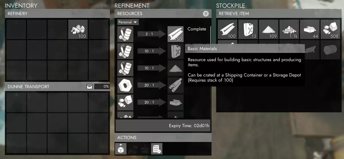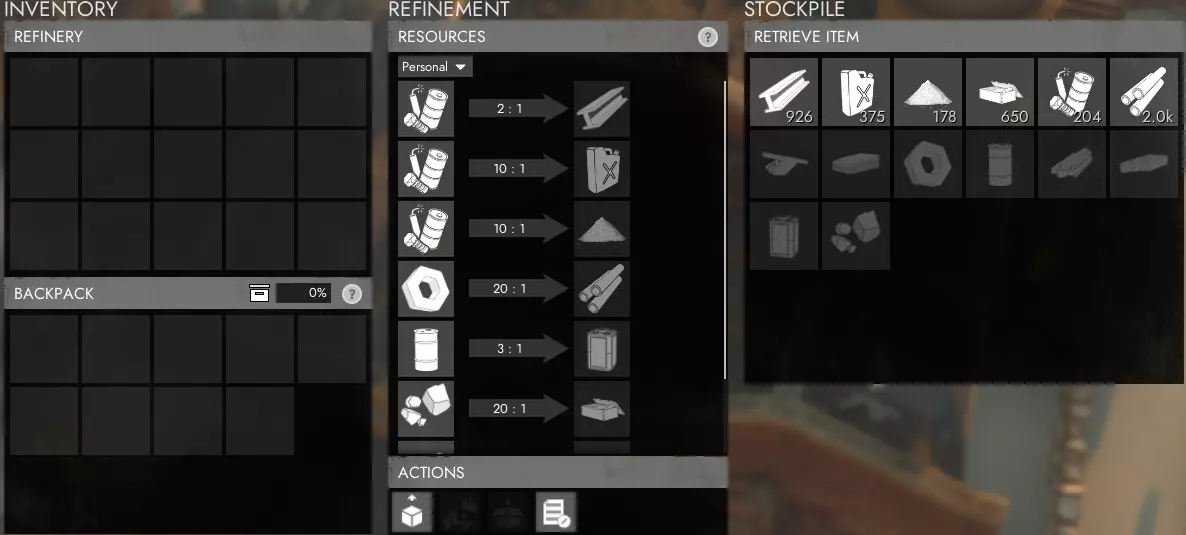 炼油厂是你可以将 salvage(废料)和 components(零部件)等原材料提炼成 bmats(基础材料)和 rmats(高级材料)等更有用资源的地方,也是将原油提炼成汽油的场所。你还必须将铁和铝提炼成合金,然后将其提交到工程中心以提升科技水平。