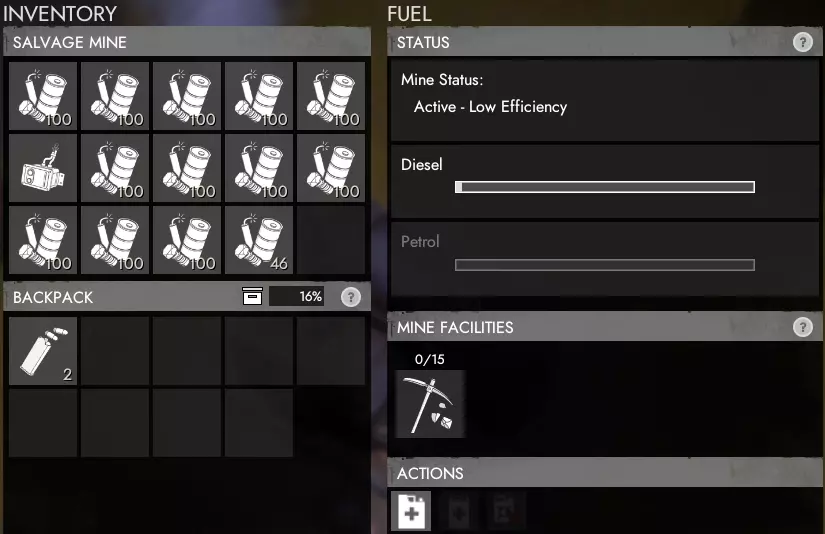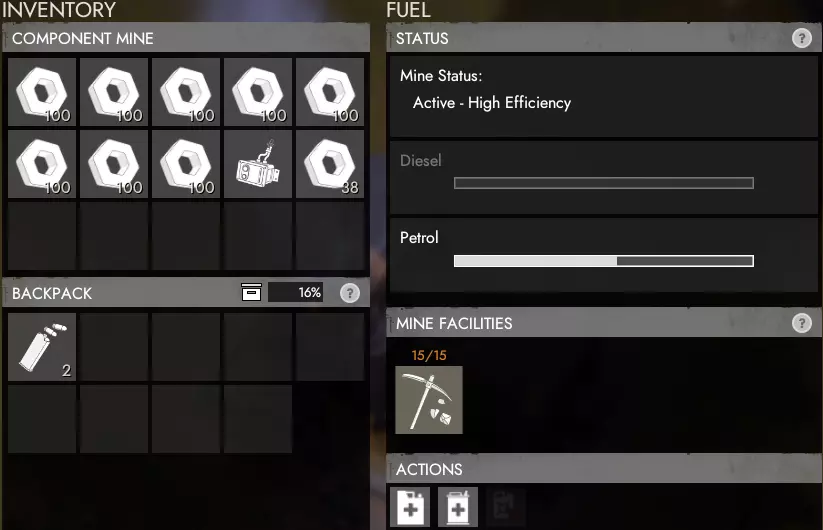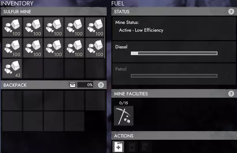 所有生产的组件和技术零件将放入公共可访问的库存中。你可以使用柴油或汽油来运行矿场。如果两种燃料都已添加,矿场会优先使用汽油,然后再使用柴油。 建议在矿场附近储备额外的燃料,以便在燃料不足时能够快速轻松地补充。 硫磺矿场