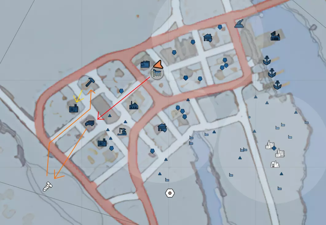 硫磺矿区是一个存在大量硫磺矿石节点的区域。单个硫磺矿区的硫磺储量可达数千单位,但一旦被开采,这些节点需要数小时才能再生。开采这些资源具有一定的紧迫性,因为获取它们非常重要,你不希望敌人有机会开采,而且开始开采得越早,节点就能越早开始重生。 硫磺只能用大锤或采矿机开采,但在拥有大锤或采矿机之前,也可以从硫磺矿场收集。 你可以在中央节点旁按【E】键,了解矿区剩余的节点数量,或者查看地图上的矿区标记来获取剩余节点数量。每个节点大约含有200单位硫磺。 === 后勤玩家的职责与入门 === 以下章节旨在为新玩家提供后勤工作和前线补给的入门指导。游戏玩法多样,你可以承担多种特定职责,因此本文仅作为你开展这些工作的参考指南。 在介绍过程中,我只会涵盖关于建筑和载具的必要知识,如需更多细节,请参考上文内容。 接下来几节中,你将进行的工作概述如下。红色箭头:你需要一辆卡车来运输重型资源,因此很可能需要制造一辆。制造卡车需获取100个基础材料,然后前往载具工厂【卡车图标】。 橙色箭头:有了卡车后,你需要收集一些废金属,因此要前往最近的废料场【螺丝图标】,用锤子开采。废料可以精炼成多种资源,最常见的是基础材料(bmats),这一过程在精炼厂【锤子图标】进行。 黄色箭头:基础材料有多种用途,在本环节中,你需将其送到工厂【带有两个烟囱的小型工厂图标】,以制造基础武器和弹药。 之后,你就可以驾驶卡车将这些物资运送到任何需要的地方了!