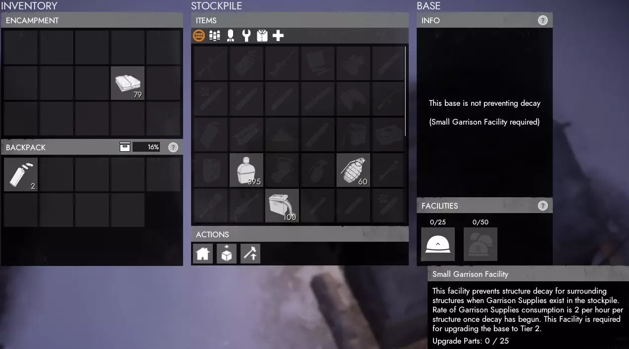 另一个需要生产并四处供应的关键资源是【驻军补给】。将这些补给储存在【战区总部(TH)】、【前沿作战基地(FOB)】和【遗迹基地】中,能够防止防御建筑不可避免的自然损耗(建筑随时间受到损伤是服务器清除玩家认定为未使用的建筑以减轻服务器负载的方式)。 不过,除非完成至少【小型驻军】升级,否则驻军补给无法防止建筑损耗。一旦建筑开始损耗(时间不定,但至少需要数小时),对于已完成【小型驻军】升级的建筑,每个正在损耗的防御建筑(包括沙袋和墙壁等)每小时会自动消耗2个驻军补给。在TH、FOB或遗迹基地范围内的任何会衰减的物品,以及大型驻军设施每小时每座会衰减的防御建筑各产生1个。大规模生产工厂