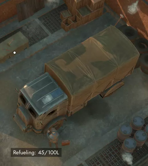 卡车组装完成后,你需要为其加油。新制造的载具初始燃油量很少,这里是5/100,仅够开出工厂,无法行驶更远。确保你的柴油罐装备在第三个装备栏,而非背包中(在背包内左键点击柴油罐可将其移至装备栏)。然后按默认按键“3”拿出油桶,在卡车旁长按左键即可加油。