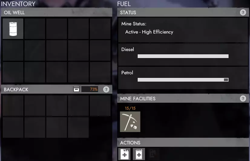 所有产出的硫磺将放入公共可访问的库存中。你可以使用柴油或汽油来运行矿场。如果两种燃料都已添加,矿场会优先使用汽油,之后再使用柴油。 建议在矿场附近储备额外的燃料,以便在燃料不足时能够快速轻松地补充。 【油井】