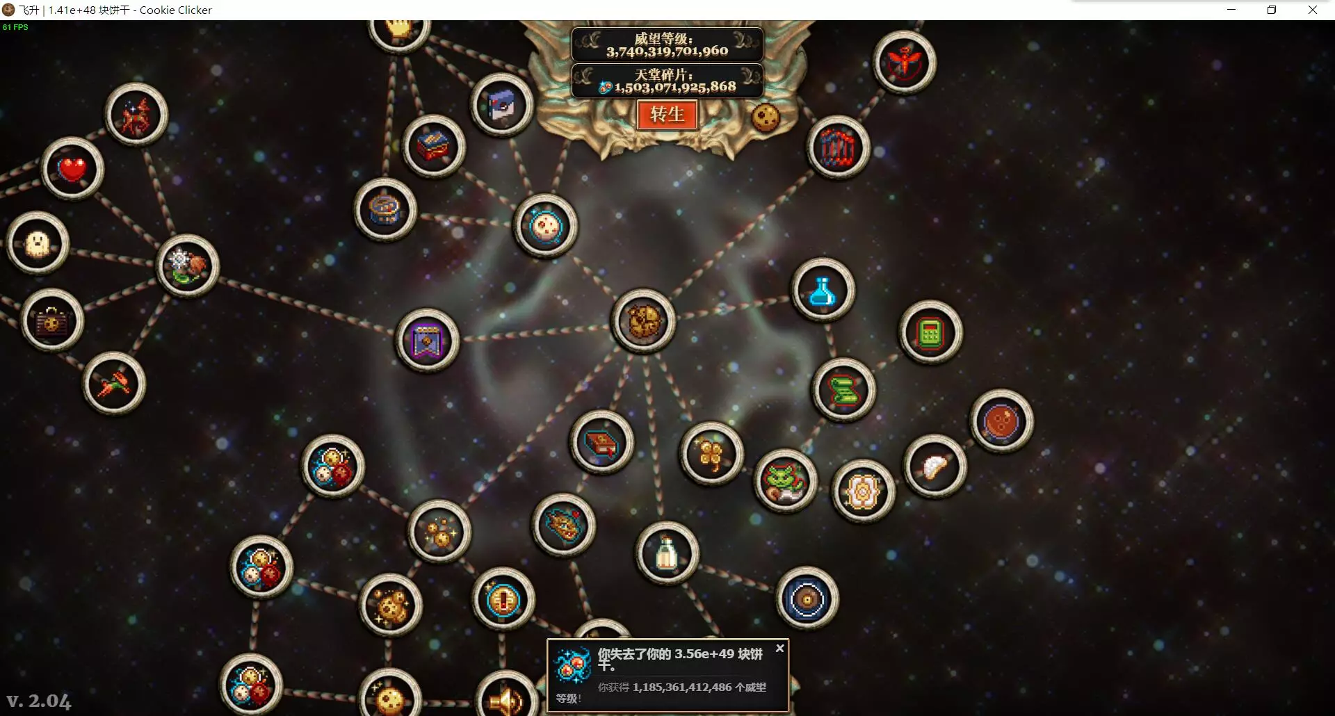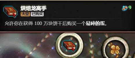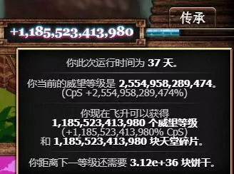 随着游戏进行,饼干会不断生产,右上角的进度条也会随之增长。进度条涨满一条后,将获得1块天堂碎片和1点威望等级。天堂碎片可在飞升后的天堂商店中用于解锁特别升级;威望等级则会在开启下周目时对产量产生加成,且该加成在后续周目中会持续保留,经过几轮积累后,产量将呈现滚雪球式增长。 (当前飞升获得的等级不会对本局产量产生加成,需开启下周目后才会生效) 飞升后即可进入天堂商店。