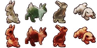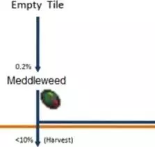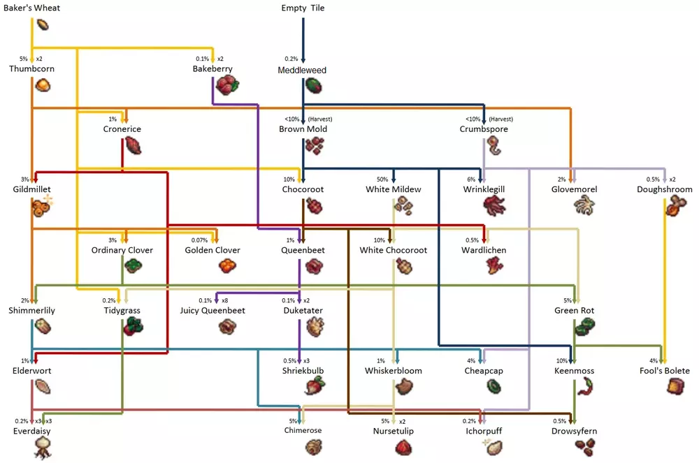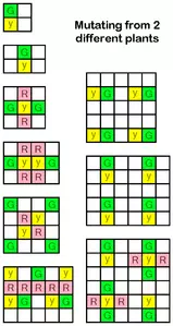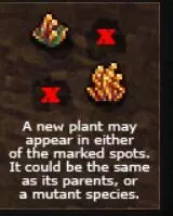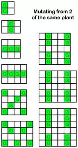 (游戏里是突变,但我觉得部分地方叫杂交更顺口点,应该更好理解) 如图,两株已成熟的植物相邻且周围1格有空位时,就可能会在进入每个新周期时在空位生成一个新植物,这株植物可能是亲本的其中一相同种,也可能是两者能杂交产生的新品种。 不同植物组合能产生的新品种不同,以下是全杂交表: