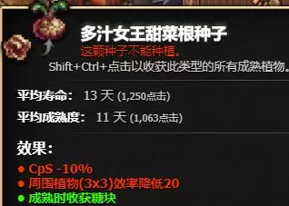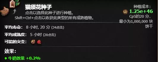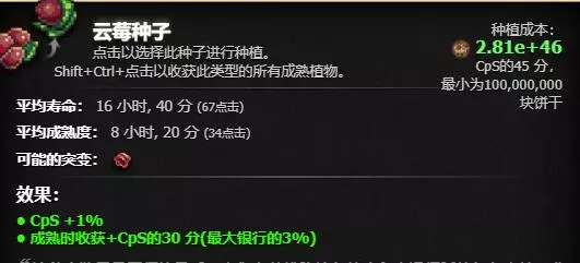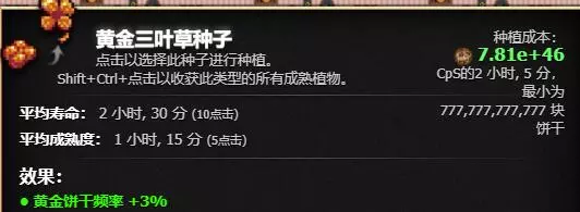 前期即可解锁(指极低概率刷出),收获时每株可获得相当于当前产量半小时的量。正确使用方法是种植一片作物,等全部成熟后冷冻,攒出两个甚至三个金饼干buff后一键收割,体验极佳。不过每株的收益上限取决于饼干库存的3%,所以需要囤积足够的库存。