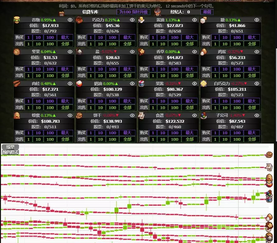 股票每分钟更新一次价格,实际支付价以当前每秒产量为准。仓库升到3、5、6级会分别额外解锁3种贷款,效果为在接下来的2小时/40秒/2天里产量+50%/100%/20%,但要支付20%/40%/50%当前存款,且正面效果过期后接下来的4小时/40分钟/5天内产量下降75%/90%/20%。 直接买入时要额外支付20%手续费,雇佣经纪人每个可以减少5%。这里5%是在20%基础上乘算,所以实际公式为:20%*0.95^经纪人数量。 至于多少性价比最高?我数学不好,别问我 仓库等级、经纪人和价格都会在飞升后重置 股市价格变化还是有规律的,直接参考大佬的价格分析表(关键是时间跨度,短时间一天记几十次反而不准)(哪天我可能搬到国内平台,但估计自动读取就用不了了,我也不会整宏)3. 饼干龙