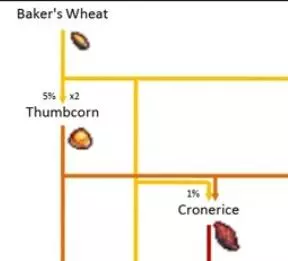 等两株植物都成熟后,在它们其中一株凋亡(或被你收割)前的这段时间里,每过一个【周期】,都有可能在周围四格内生成一株烘焙麦,或者杂交出新品种拇指玉米(运气极好时还能得到云莓)。图中的“x2”表示两株同种植物进行自交(后续的x3、x8等含义相同)。 当新植物成熟后,点击收获即可解锁其种子,之后就能直接种植该植物了。 【注意】不要让新植物自然凋亡,也不要在未成熟时收割,否则无法获得种子。 若将种植布置换成1株烘焙麦和1株玉米,就能杂交出另一个新品种干瘪稻米,图中展示的就是这种情况。