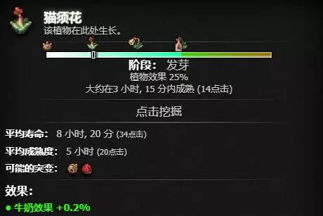 植物的生长时间以【tick】为单位(截图中的点击操作和倒计时里的勾号都代表这一概念),不同土壤的【tick】时长不同。截图中使用的黏土【tick】为15分钟,若某株植物成熟需要20个【tick】,换算成现实时间就是15分钟×20=300分钟,即5小时。如果换成泥土,其【tick】为5分钟,那么成熟时间就变为5分钟×20=100分钟。 植物生长分为芽、出芽、开花、成熟四个阶段,其提供的被动效果会随阶段提升,成熟时效果达到最大。成熟后经过一段时间会自然凋亡,凋亡时间为植物寿命减去成熟所需时间。(除了描述中标注“不朽”的植物外,其他植物都会自然凋亡) 注意到时间差异了吗?每株植物种植后的具体成熟时间和寿命会有一定浮动,因此同一时间种下的一排植物,经过相同时间后,有的已经成熟,有的尚未成熟,有的已经枯萎,有的依然存活。(除了描述中标注“可预期的增长”的植物,这类植物每株的生长时间完全一致) 土壤会根据种植过的植物数量逐步解锁,可随时免费切换,但每次切换后会有10分钟的冷却时间,消耗1个糖块可跳过冷却。 2.1.2 突变 (如果你玩过《集合啦!动物森友会》,就会发现机制完全相同)
