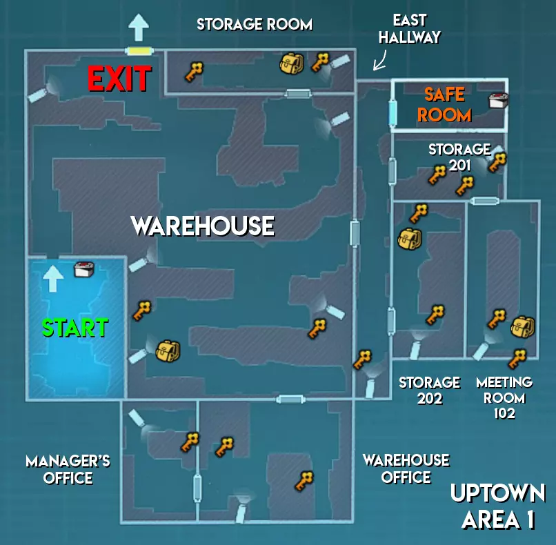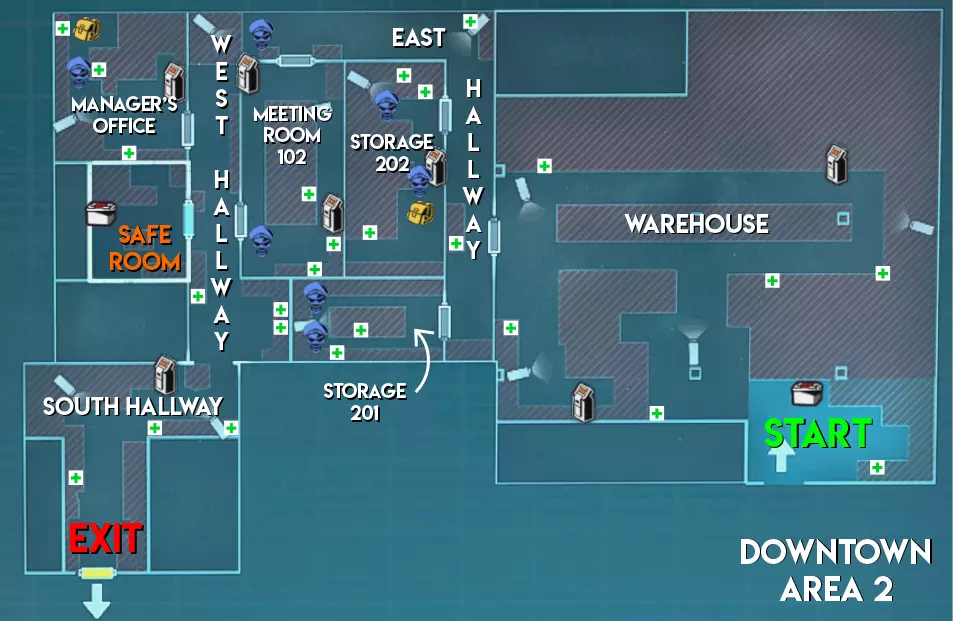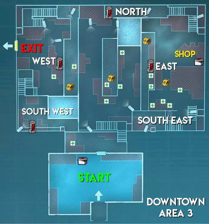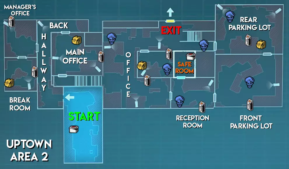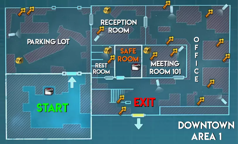 难度(中立) 区域1 - ★★ 中等(地图较大,包含狭窄通道和需要突破的小房间) 区域2 - ★★★ 困难(地图更大但线性程度较低。部分安全装置配备多个摄像头) 区域3 - ★ 简单(无房间,高地优势有助于远距离发现补给僵尸/威胁)
