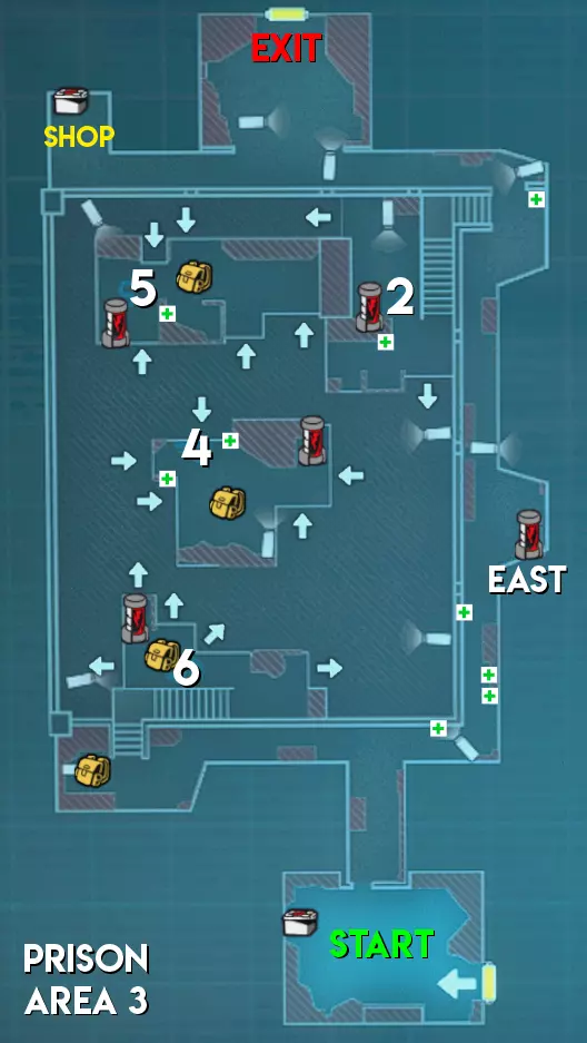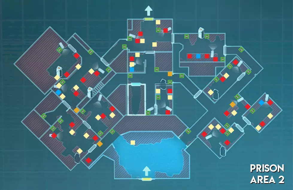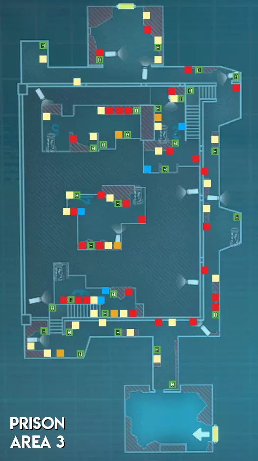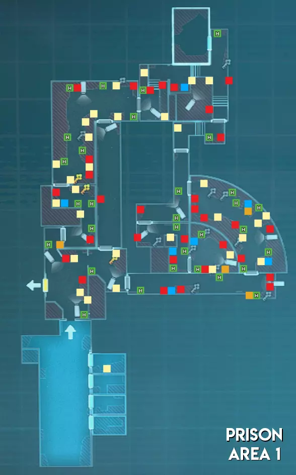 监狱地图的物品分布与废弃公园类似。不过在区域1中,第一个G2牢房可能会刷新雨伞信用点。区域3的地图布局也可能发生变化。 难度(以主谋方视角) 区域1 - ★★★ 困难(地图分为两个部分,有许多需要突破的房间) 区域2 - ★★★ 困难(地图较大,走廊较长且房间众多,导致移动困难,部分安全装置上装有多个摄像头) 区域3 - ★★ 中等(区域狭窄。大多数生物核心暴露在外,但被屏障封锁,地图布局可能会改变)