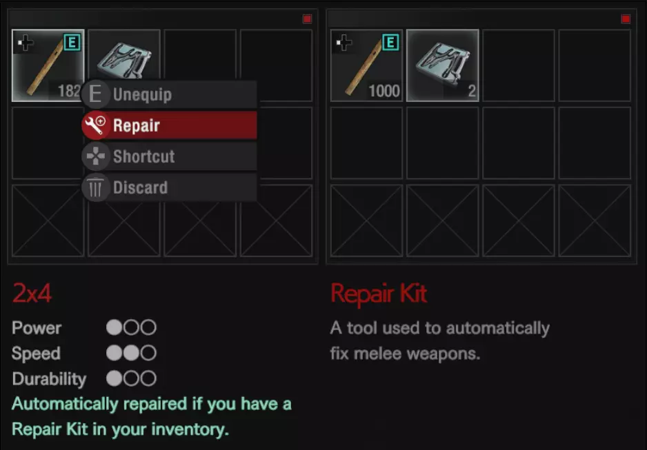 如果玩家的物品栏中至少有1个修理工具包,它会自动将损坏的武器修复至满耐久度。你也可以手动修复武器,方法是选择你想要修复的武器,然后选择修理工具包。