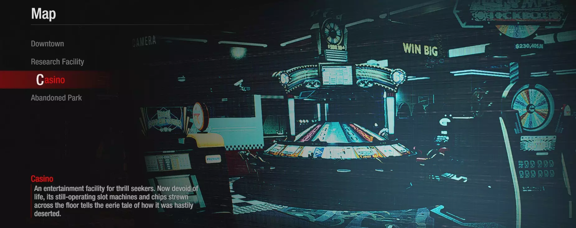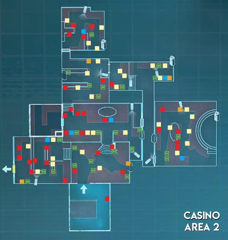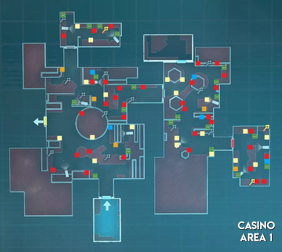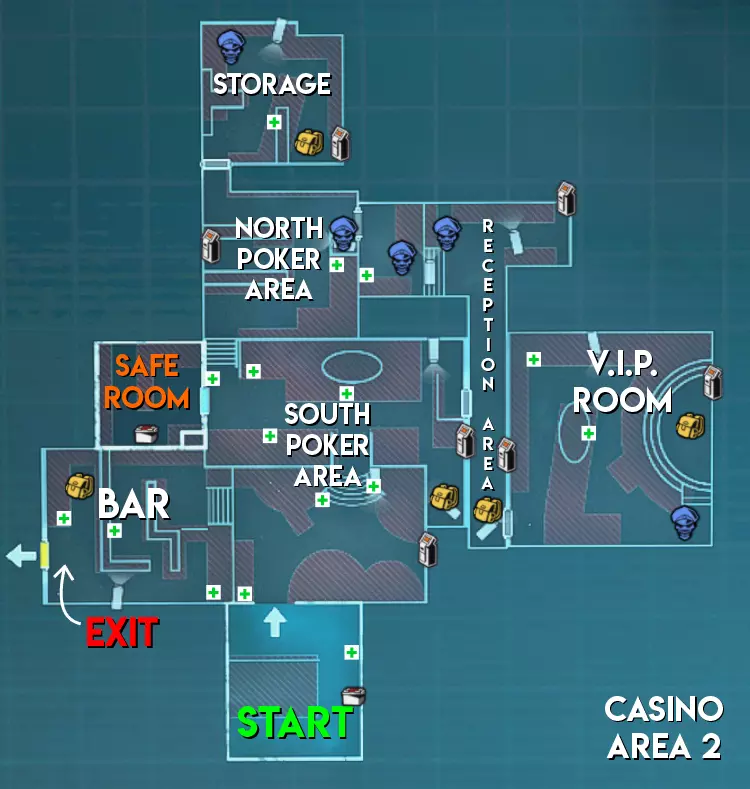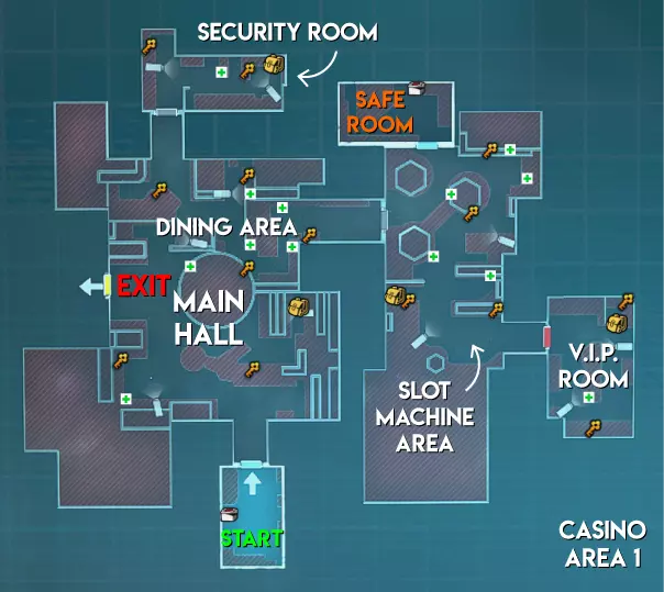 赌场地图的分布与研究设施类似,但区域2没有手雷刷新点,区域3的手雷刷新点比研究设施少1个。安全室也不像研究设施的区域2那样有伞形积分刷新点。 难度(中立) 区域1 - ★ 简单(线性地图,幸存者可以组队行动) 区域2 - ★★ 中等(区域狭窄,部分安保装置配备多个摄像头) 区域3 - ★★ 中等(生物核心位于房间内,但可从中心区域看到;老虎机、出口区域较小,且仅有1个进出点)