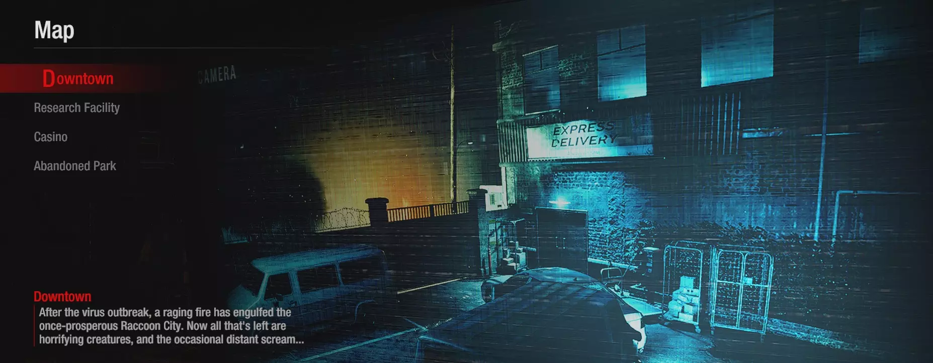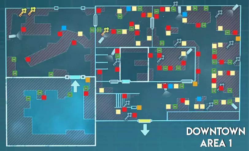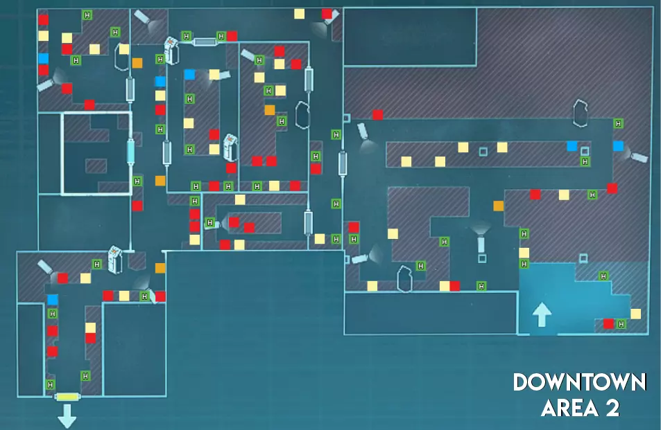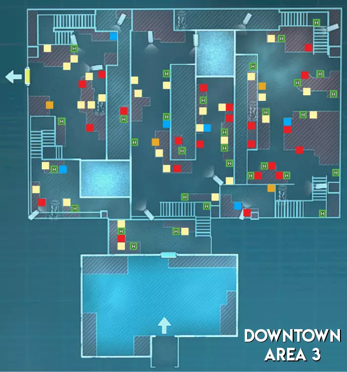 市中心地图的1区与其他地图的1区相比,绿色药草的刷新数量更少。市中心的1区也是唯一没有急救喷雾刷新点的地图。最后,与研究设施和赌场不同,市中心没有任何手雷刷新点。 难度(偏向幸存者) 1区 - ★简单(路线短且线性) 2区 - ★★中等(线性地图,有许多狭窄区域和小房间。部分安全装置上有多个摄像头) 3区 - ★简单(无房间且有高地优势)
