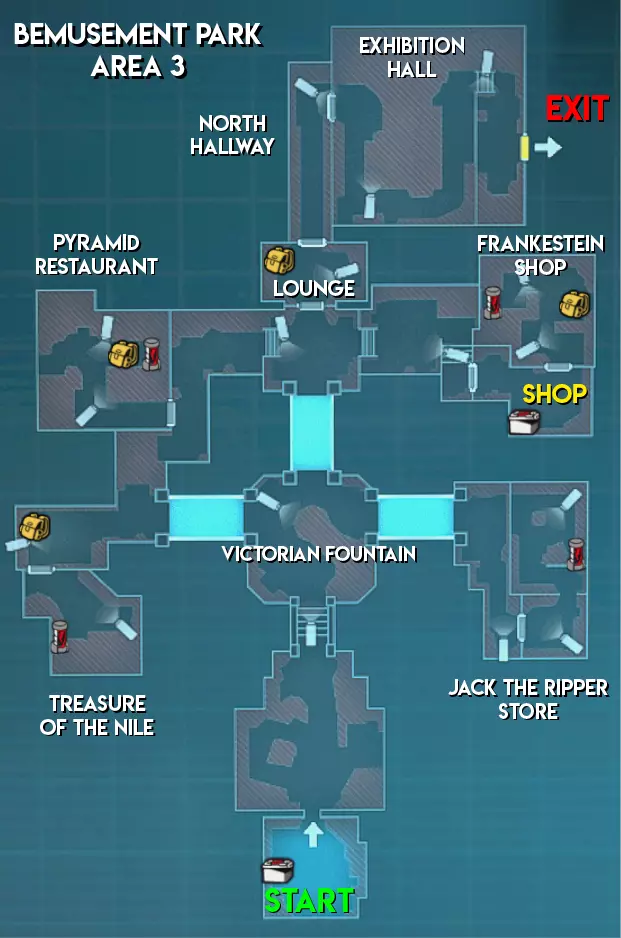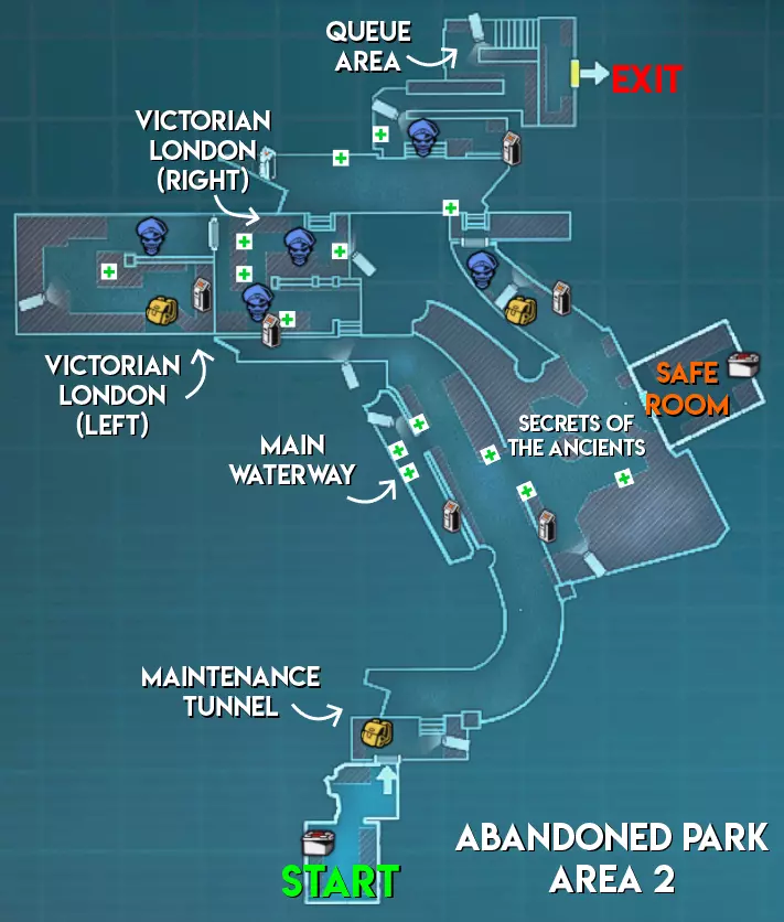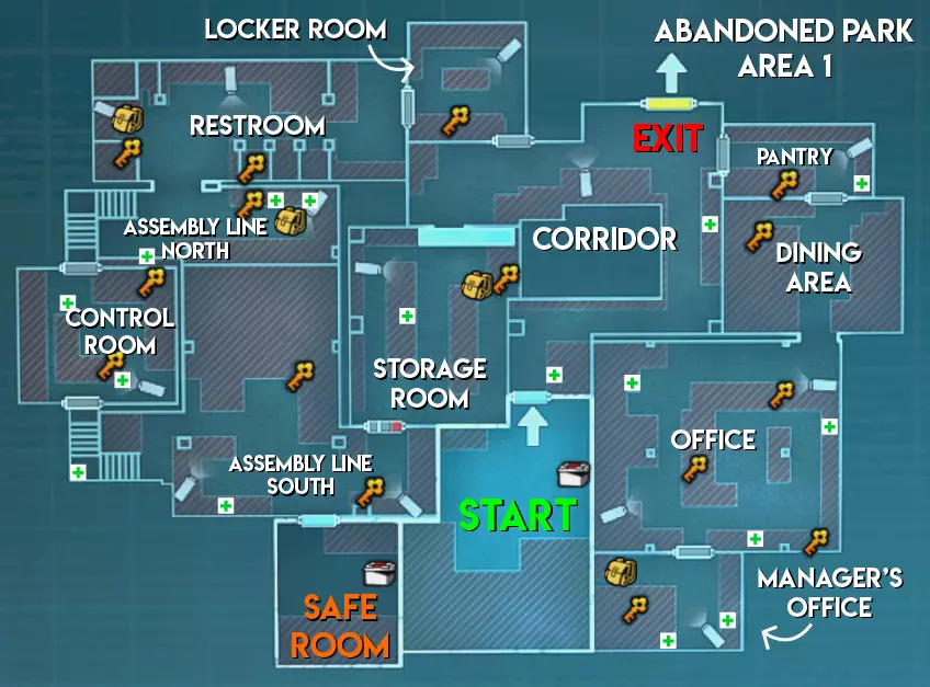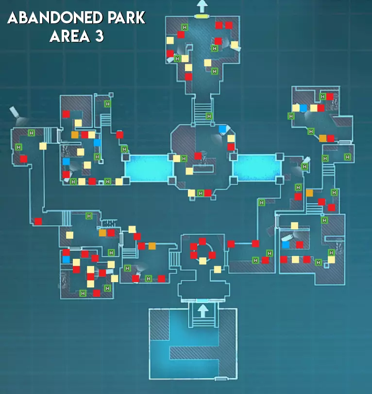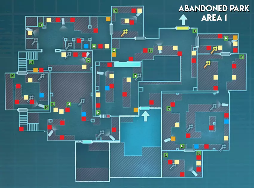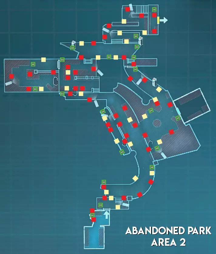 与研究设施和赌场不同,废弃公园地图中不会生成任何手雷。除此之外,其物品分布与大多数关卡类似,没有太多值得注意的地方。 难度(以主脑方视角) 区域1 - ★★★ 困难(大型地图,分为两个区域,有许多需要突破的房间) 区域2 - ★★ 中等(路径较长,部分安保装置配备多个摄像头) 区域3 - ★★★ 困难(生物核心位于地图不同角落的小房间内,有移动桥梁,摄像头可远距离攻击幸存者)