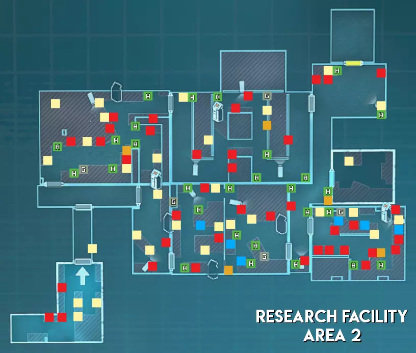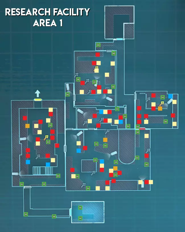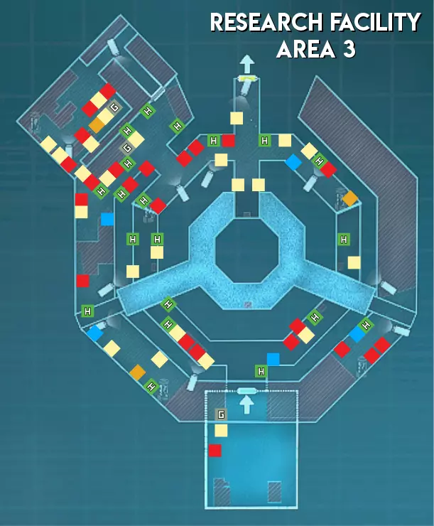 难度(中立) 区域1 - ★★★ 困难(大型地图,分为两个区域,包含狭窄通道和多个需突破的房间) 区域2 - ★ 简单(部分安防设备配备不止1个摄像头。线性地图设计便于组队搜寻保安) 区域3 - ★★ 中等(生物核心位于地图不同角落的小房间内。地图较小,通道狭窄且呈线性布局)