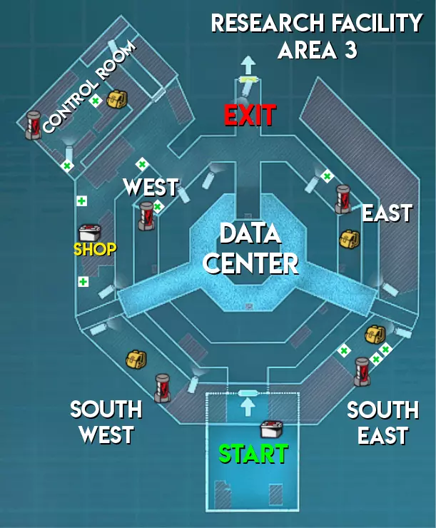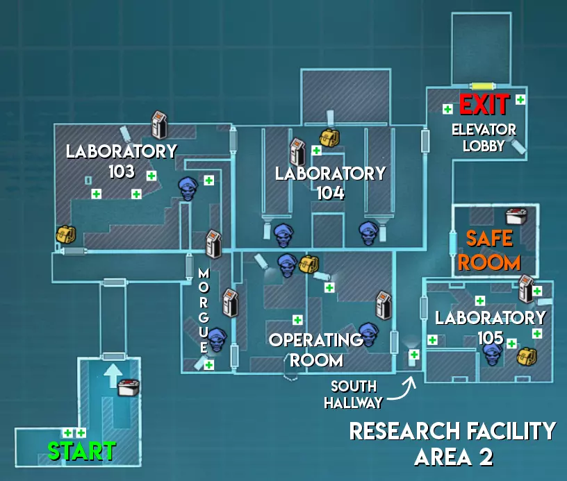 与市区地图不同,研究设施地图的1区额外刷新3个绿色药草、1个黄色药草和1个急救包,同时还多4个弹药刷新点;2区和3区各有2个手雷刷新点。 不过研究设施2区的2个黄色药草刷新点中,有时只会刷出1个。此外,该区域还有一个雨伞代币刷新点会被物体遮挡,导致无法拾取,这就是有时只能收集到12个雨伞代币中的11个的原因,不知为何只有这张地图存在这种情况。 2区的安全屋中有1个雨伞代币刷新点,记得及时去查看。难度(偏向幸存者) 区域1 - ★★中等(起始区域附近有摄像头,地图较大但大多数房间有不止一个入口) 区域2 - ★简单(房间有不止一种进入方式,且安全装置上只有1个摄像头) 区域3 - ★简单(大多数生物核心暴露在外,可从远处进行生物核心狙击)