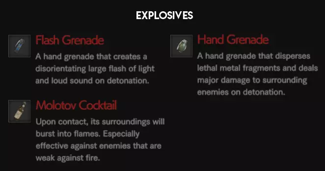 每种近战武器的最大耐久度均为1000点,但不同武器的耐久消耗速度有所不同(例如:火炬的消耗速度比棒球棒快)。爆炸物