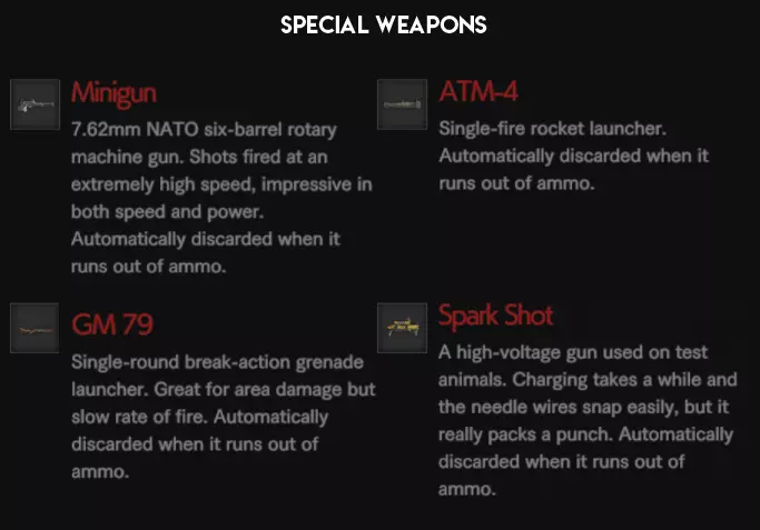 特殊武器可从补给僵尸身上掉落,或通过“一月”的“网络星期一 - 军火库”技能购买。它们不会消耗你的弹药,但各自拥有独立的弹药。修理包和近战武器:游戏在每个区域生成1个2x4近战武器和2个修理包。